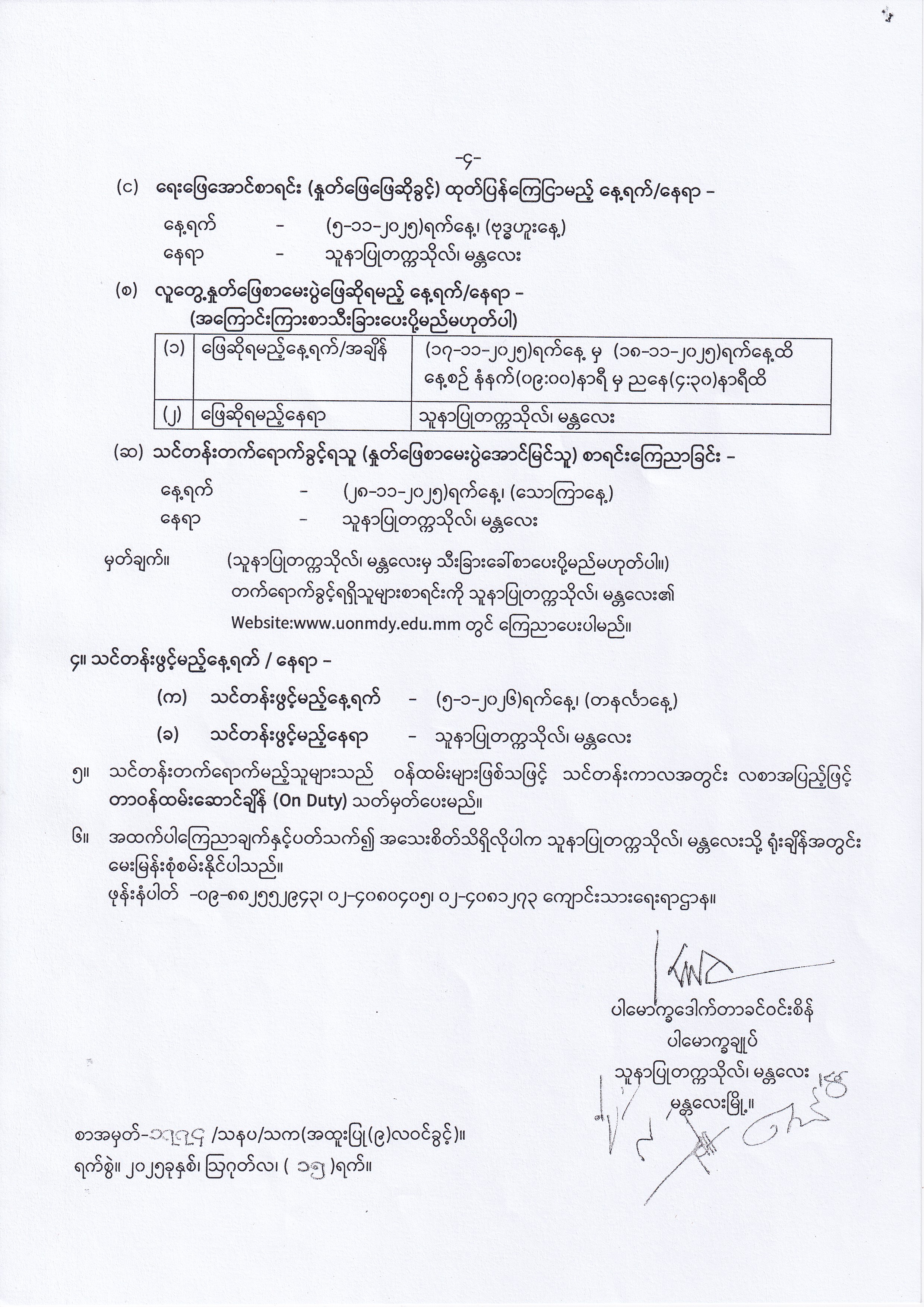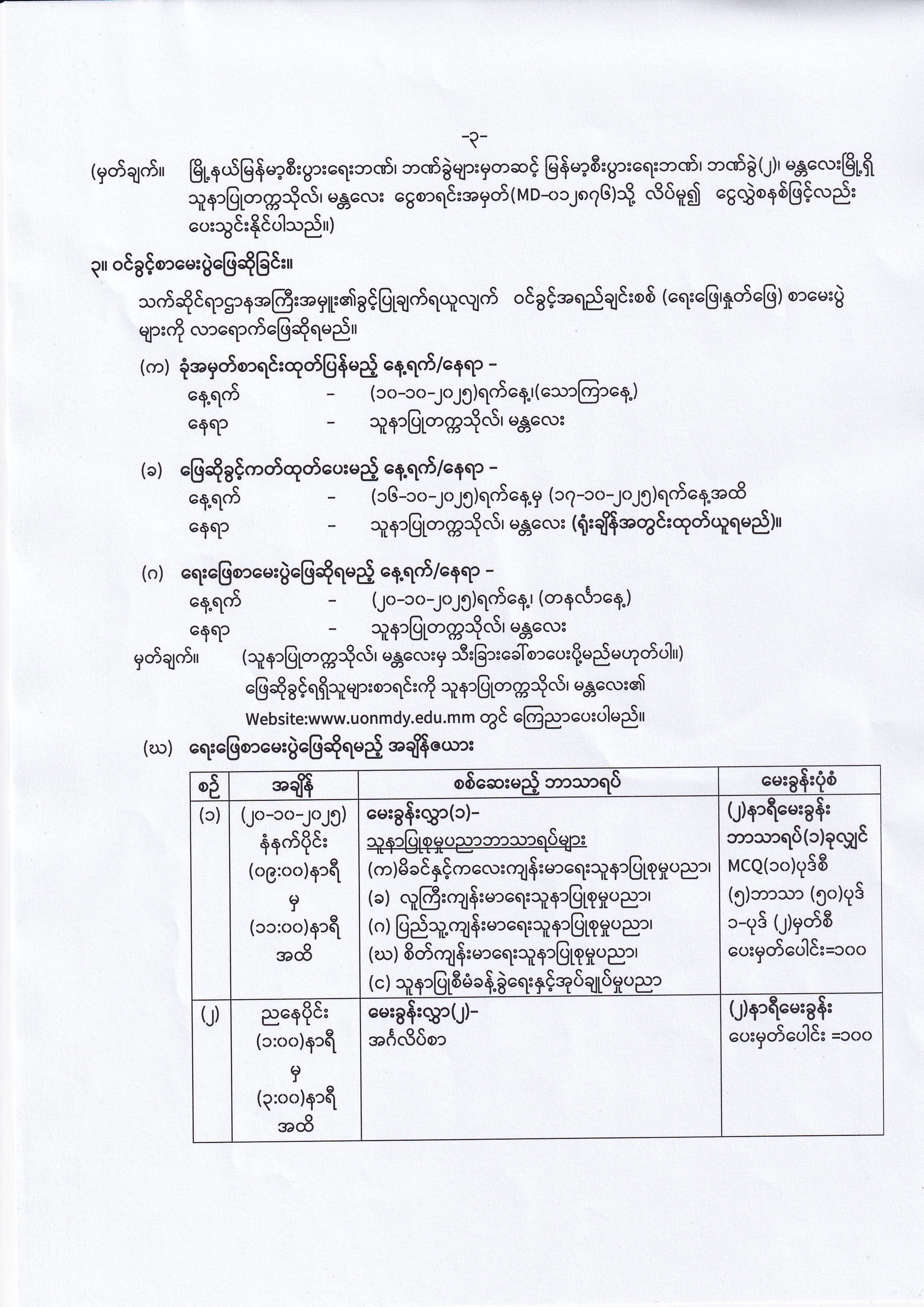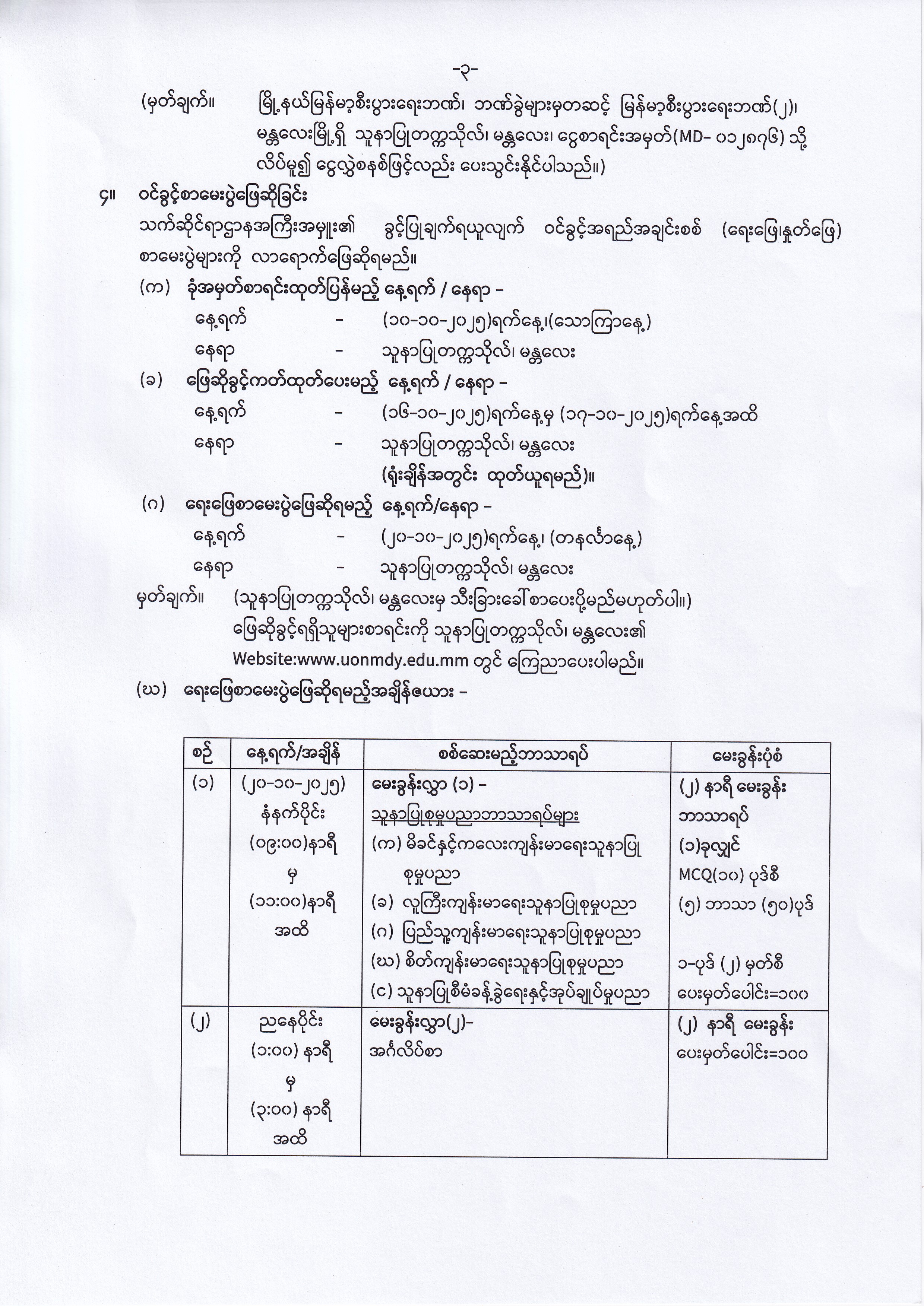 သူနာပြုတက္ကသိုလ်-မန္တလေး၌ (၅-၁-၂၀၂၆) ရက်နေ့၌ဖွင့်လှစ်မည့် အထူးပြုသူနာပြုဒီပလိုမာ (၉)လသင်တန်းအတွက် ရေးဖြေစာမေးပွဲဖြေဆိုခွင့်ရရှိသူများ၏ ခုံအမှတ်စာရင်းနှင့် စာမေးပွဲအချိန်စာရင်း