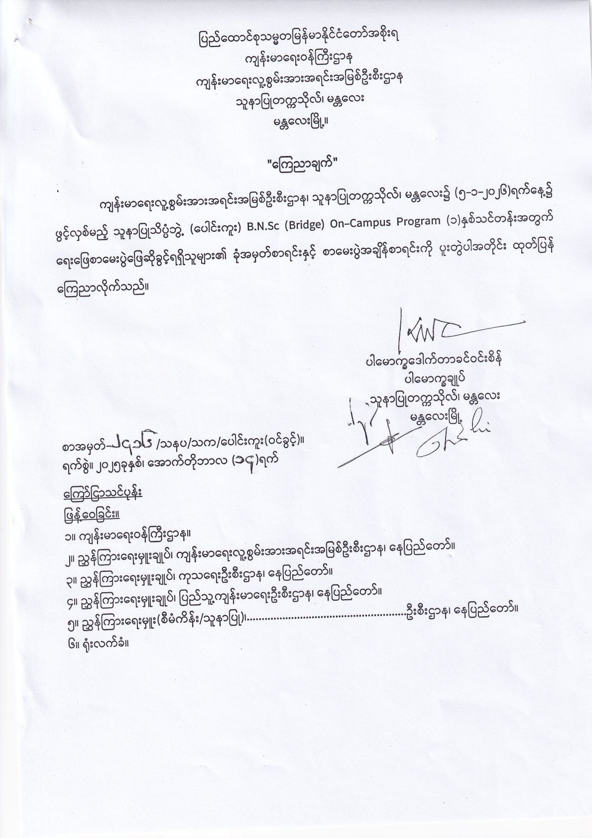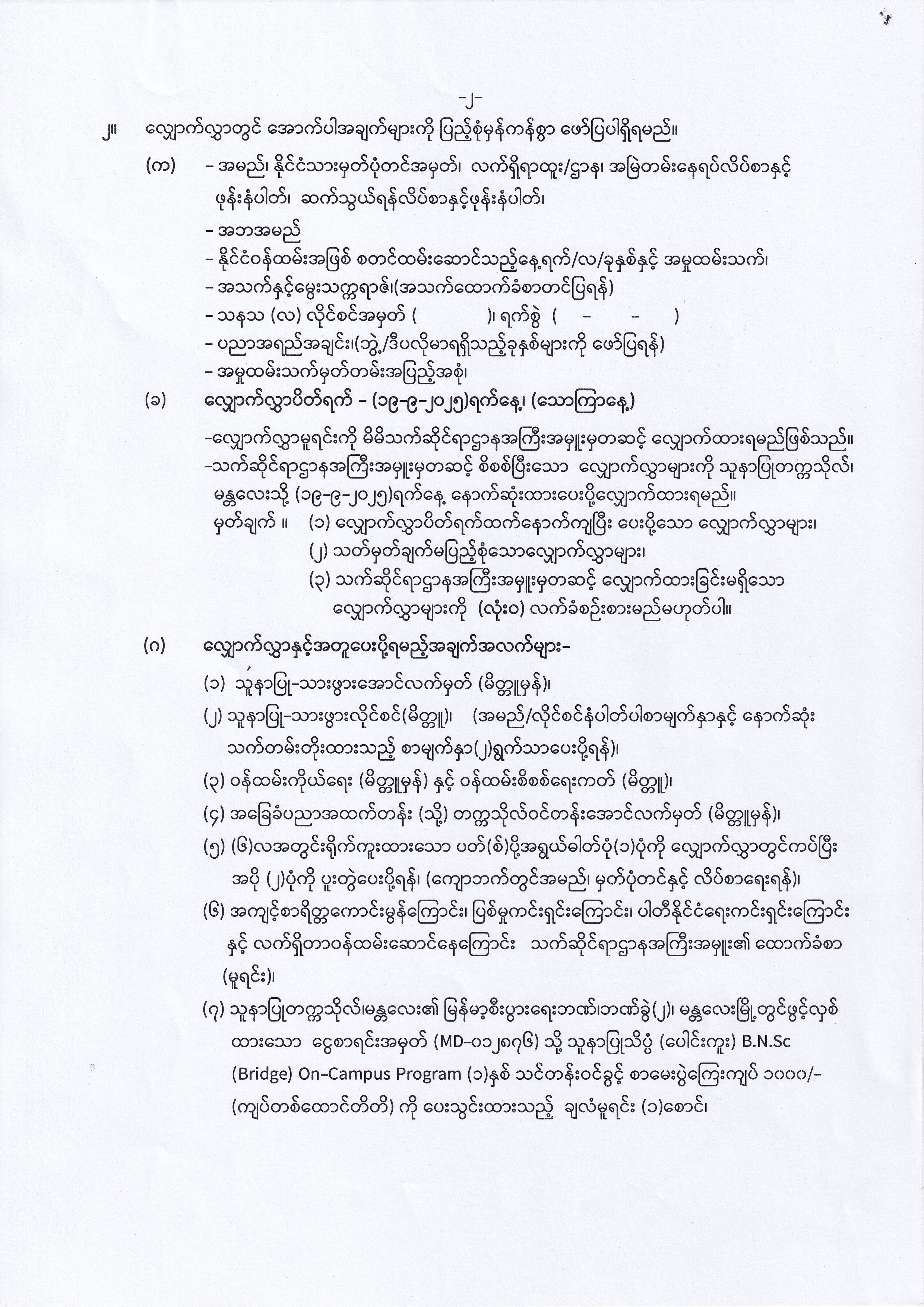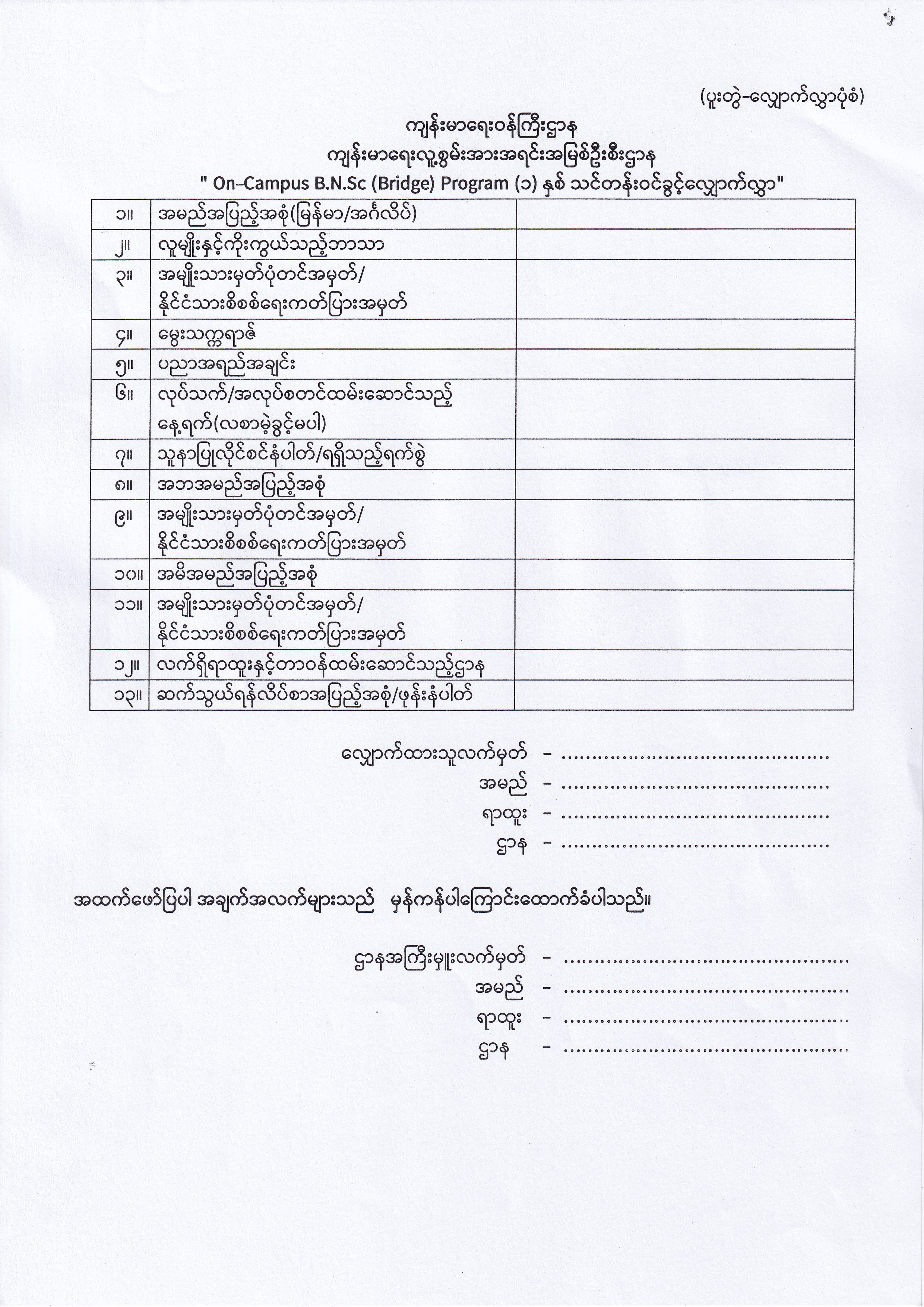 သူနာပြုတက္ကသိုလ်-မန္တလေး၊ ၂၀၂၆ ပညာသင်နှစ်တွင် ဖွင့်လှစ်မည့် သူနာပြုသိပ္ပံ (ပေါင်းကူး) B.N.Sc (Bridge) On-Campus Program (၁)နှစ် သင်တန်းလျှောက်လွှာခေါ်ယူခြင်း