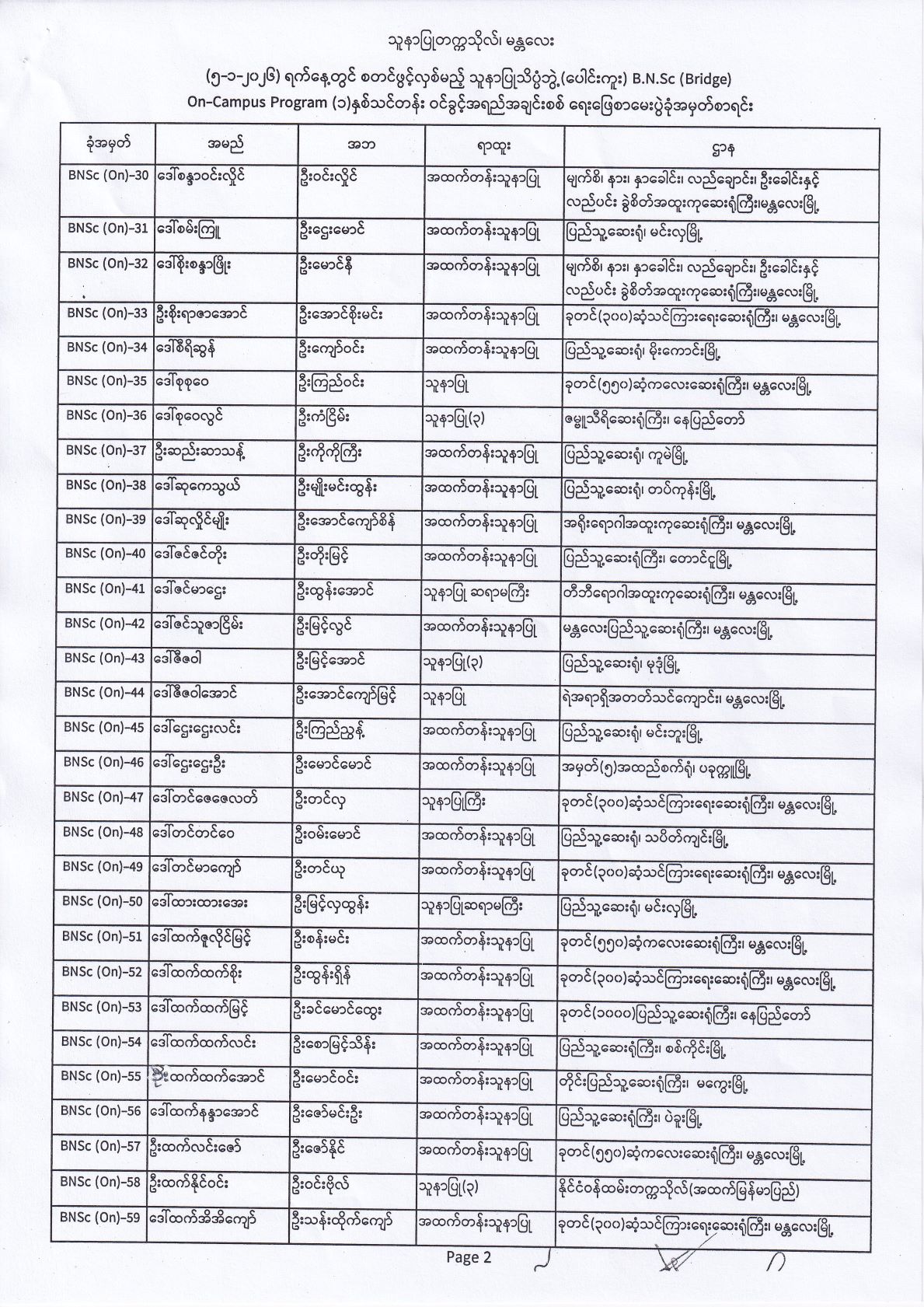သူနာပြုတက္ကသိုလ်-မန္တလေး၌ (၅-၁-၂၀၂၆) ရက်နေ့၌ဖွင့်လှစ်မည့် သူနာပြုသိပ္ပံဘွဲ့(ပေါင်းကူး) B.N.Sc (Bridge) On-Campus Program (၁)နှစ်သင်တန်းအတွက် ရေးဖြေစာမေးပွဲဖြေဆိုခွင့်ရရှိသူများ၏ ခုံအမှတ်စာရင်းနှင့် စာမေးပွဲအချိန်စာရင်း