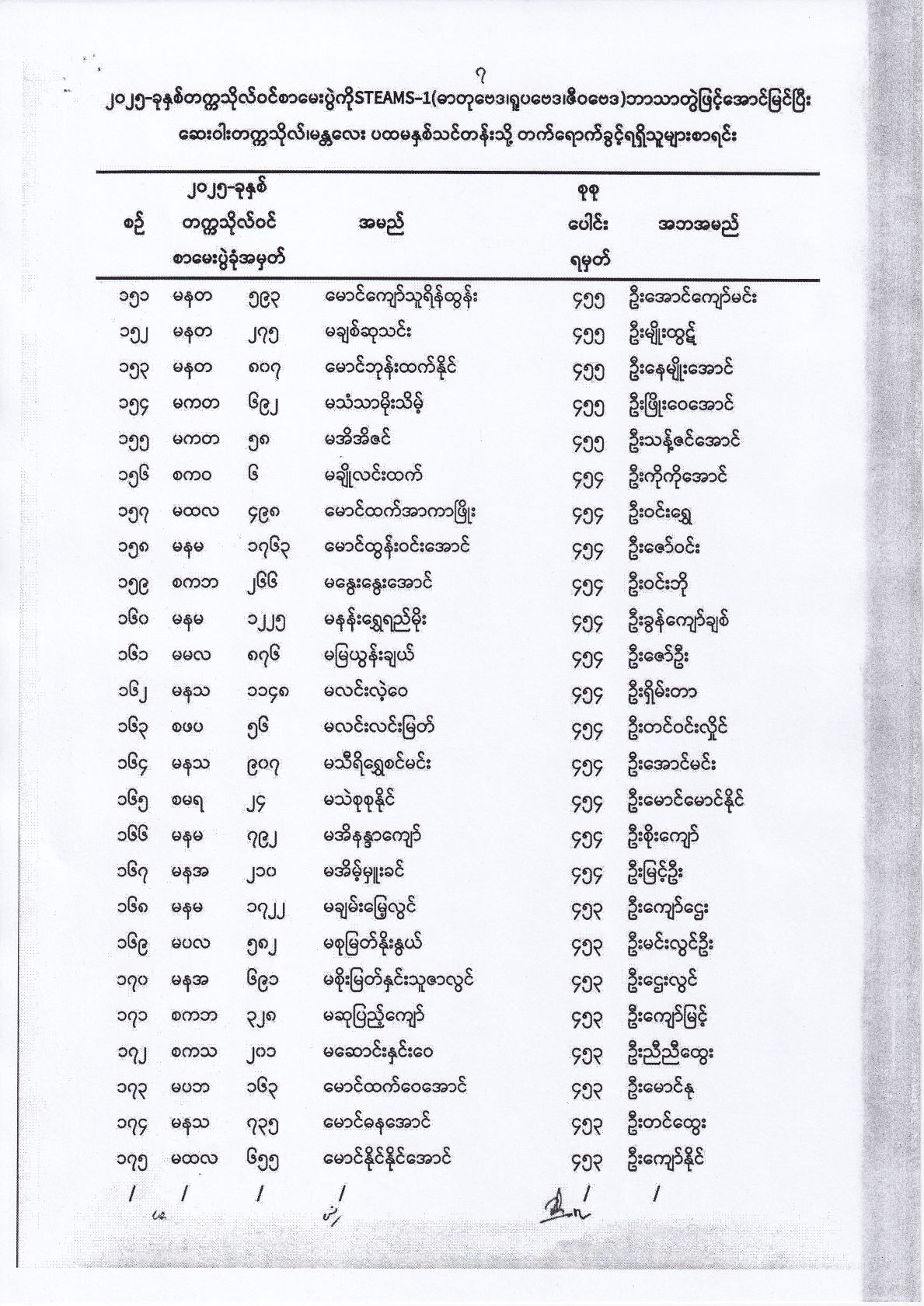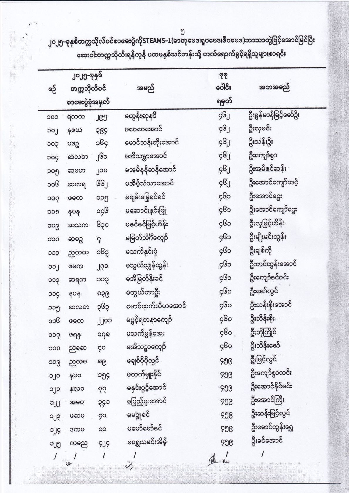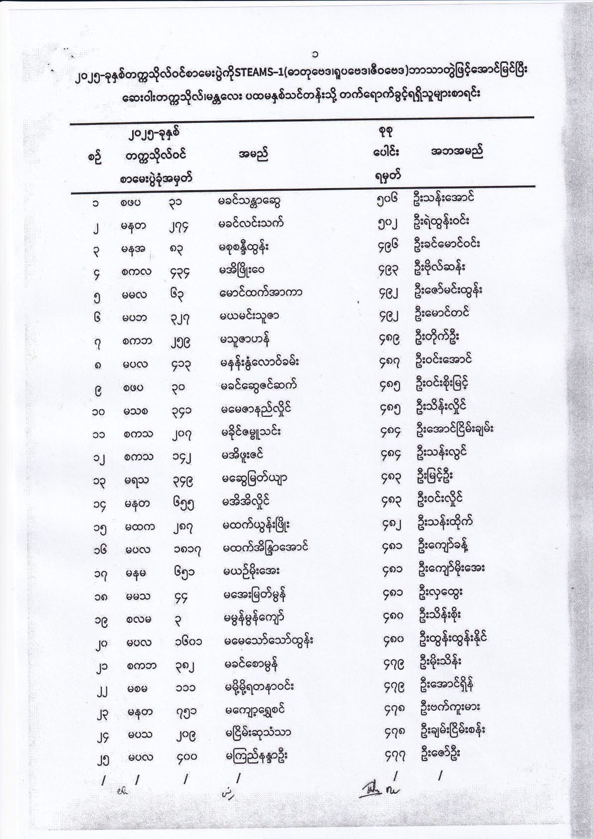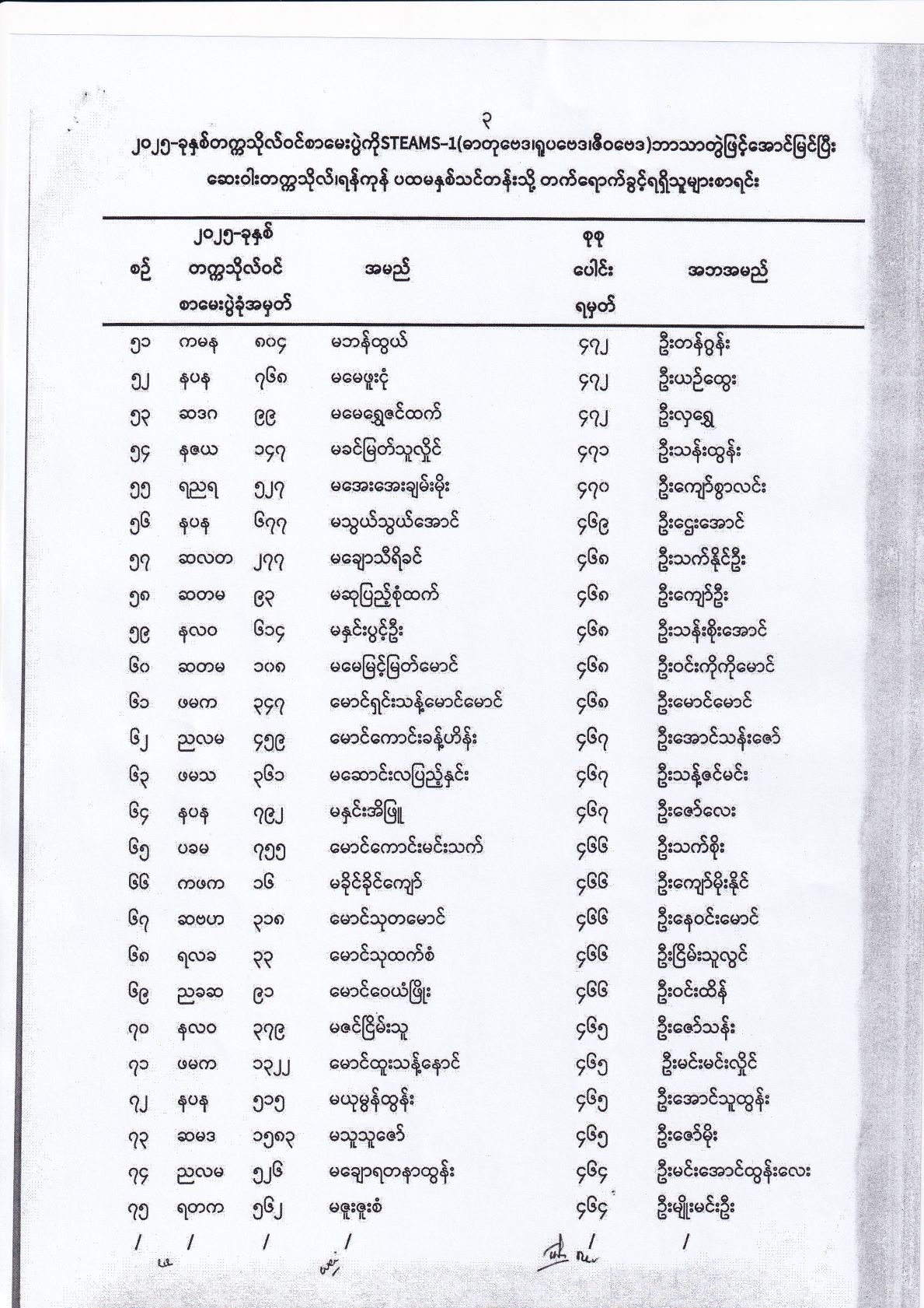 (၂၀၂၅) ခုနှစ်တွင် တက္ကသိုလ်ဝင်စာမေးပွဲကို STEAMS-1 (ဓာတုဗေဒ၊ ရူပဗေဒ၊ ဇီဝဗေဒ) ဘာသာတွဲ ဖြင့်အောင်မြင်ပြီး ကျန်းမာရေးလူ့စွမ်းအားအရင်းအမြစ်ဦးစီးဌာန၊ ဆေးပညာနှီးနွှယ်တက္ကသိုလ်များ၏ ပထမနှစ်သင်တန်းသို့ ဝင်ခွင့်ရရှိသည့် ကျောင်းသား/သူများစာရင်း