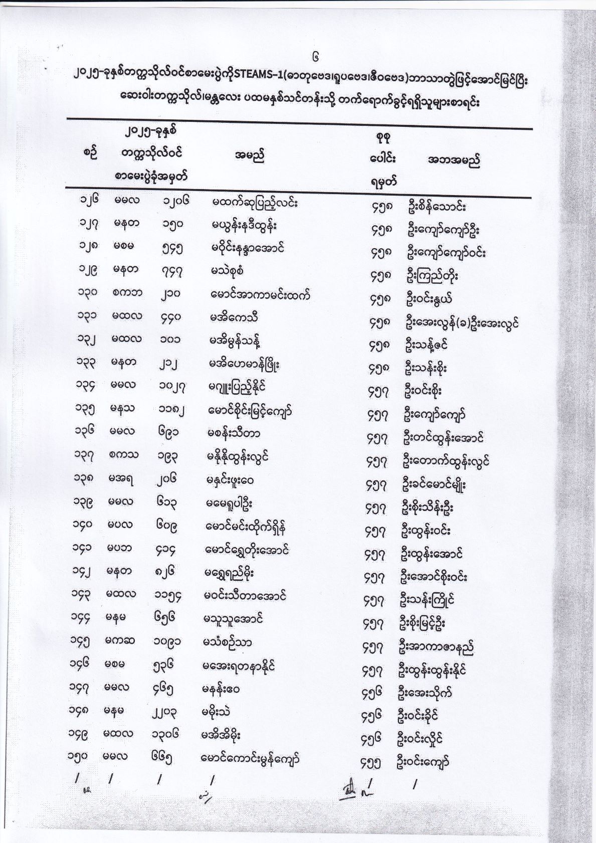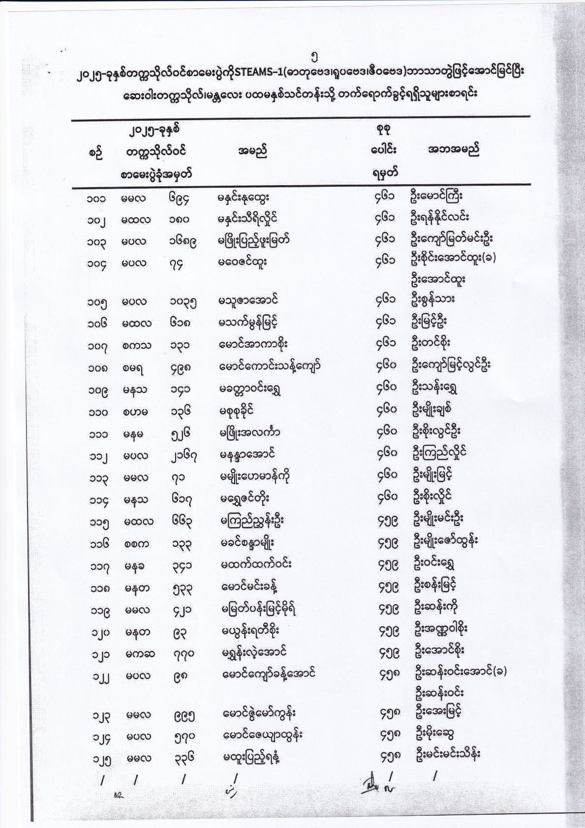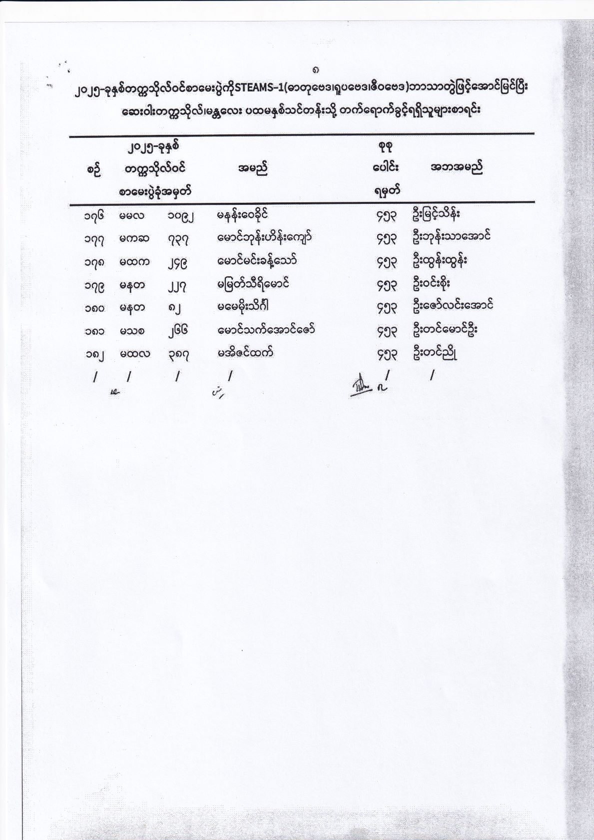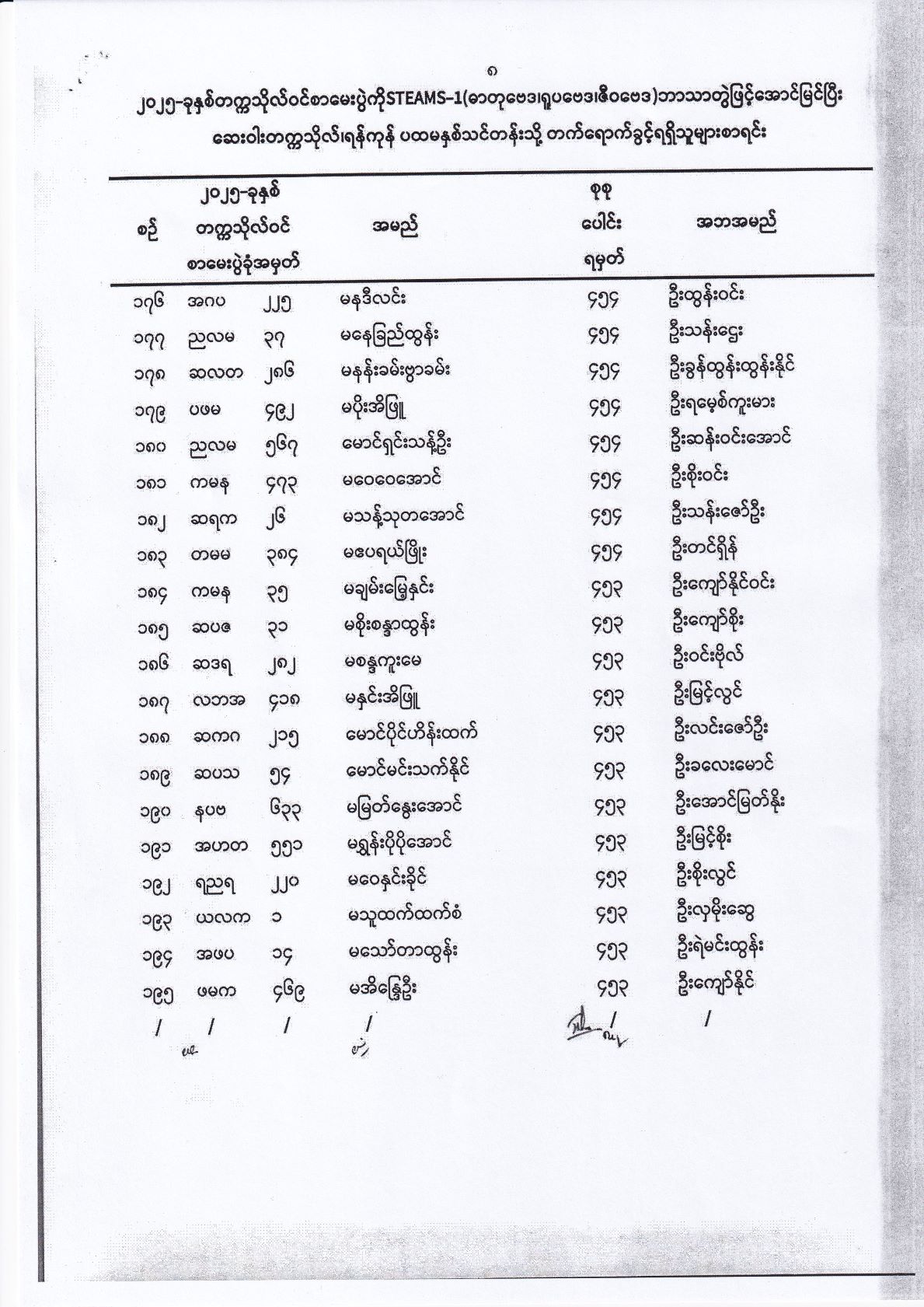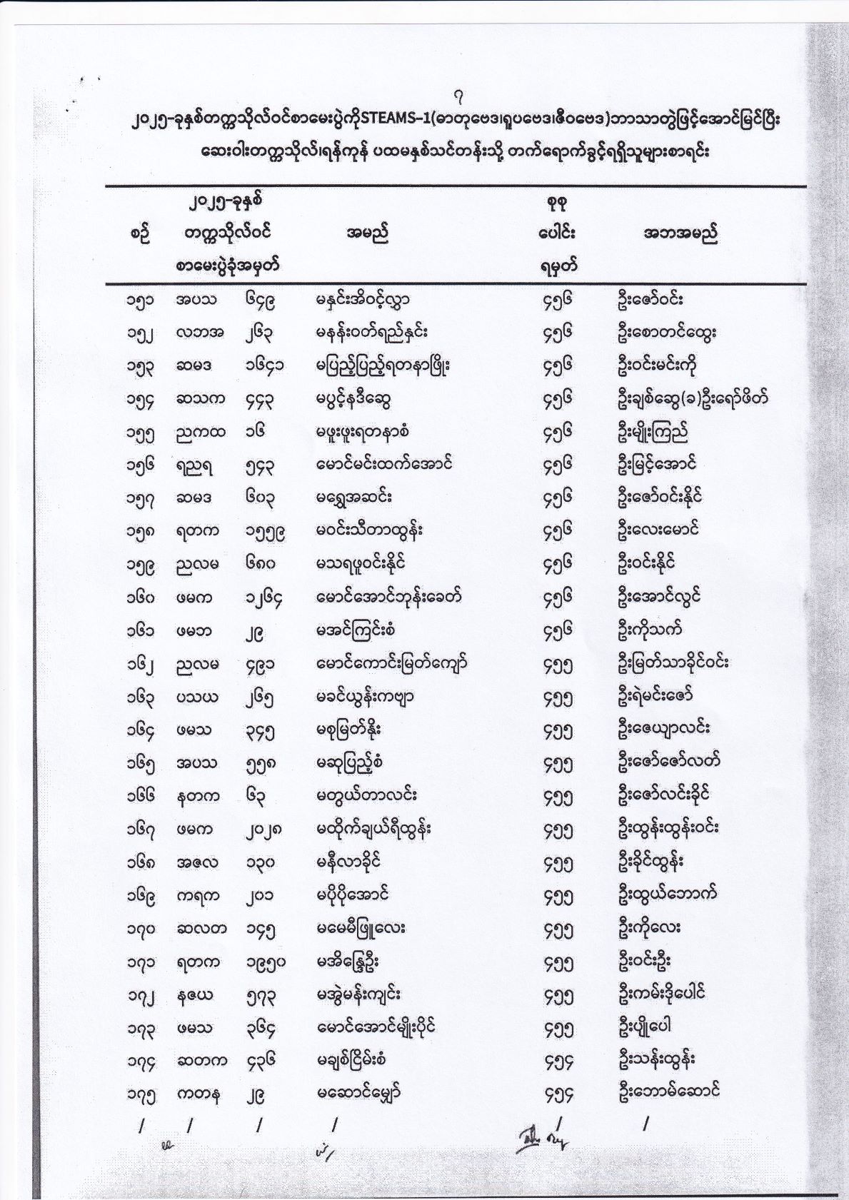 (၂၀၂၅) ခုနှစ်တွင် တက္ကသိုလ်ဝင်စာမေးပွဲကို STEAMS-1 (ဓာတုဗေဒ၊ ရူပဗေဒ၊ ဇီဝဗေဒ) ဘာသာတွဲ ဖြင့်အောင်မြင်ပြီး ကျန်းမာရေးလူ့စွမ်းအားအရင်းအမြစ်ဦးစီးဌာန၊ ဆေးပညာနှီးနွှယ်တက္ကသိုလ်များ၏ ပထမနှစ်သင်တန်းသို့ ဝင်ခွင့်ရရှိသည့် ကျောင်းသား/သူများစာရင်း