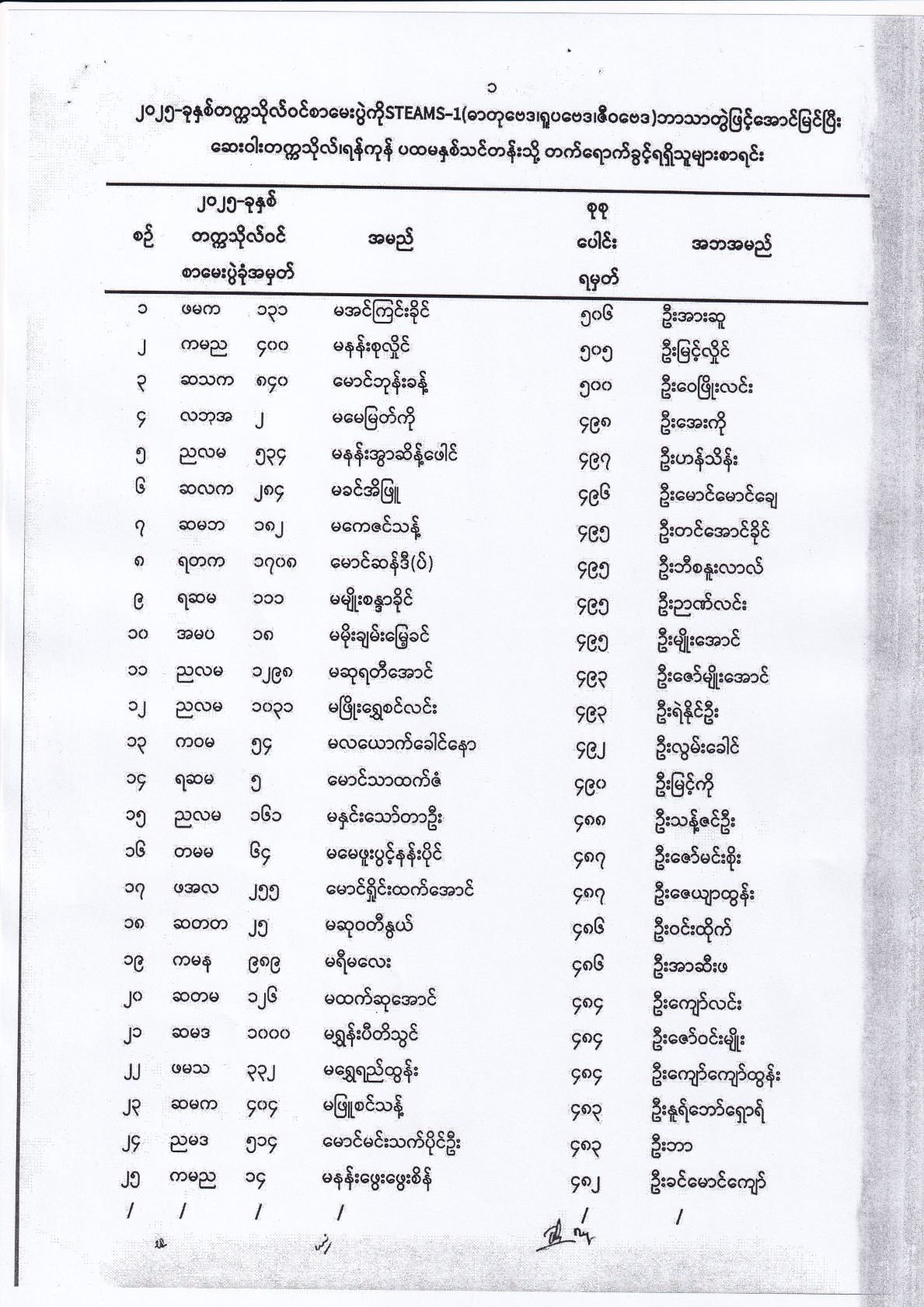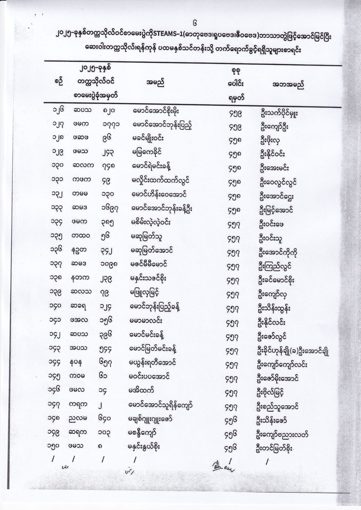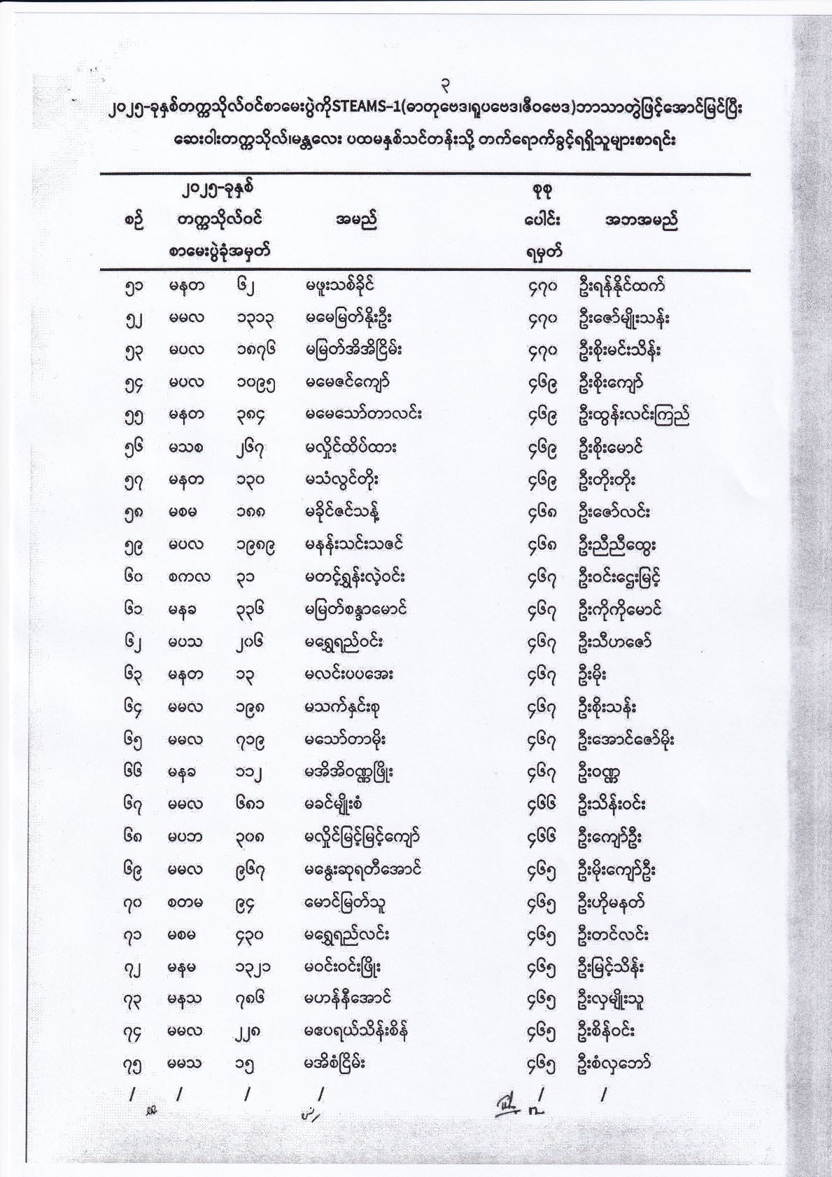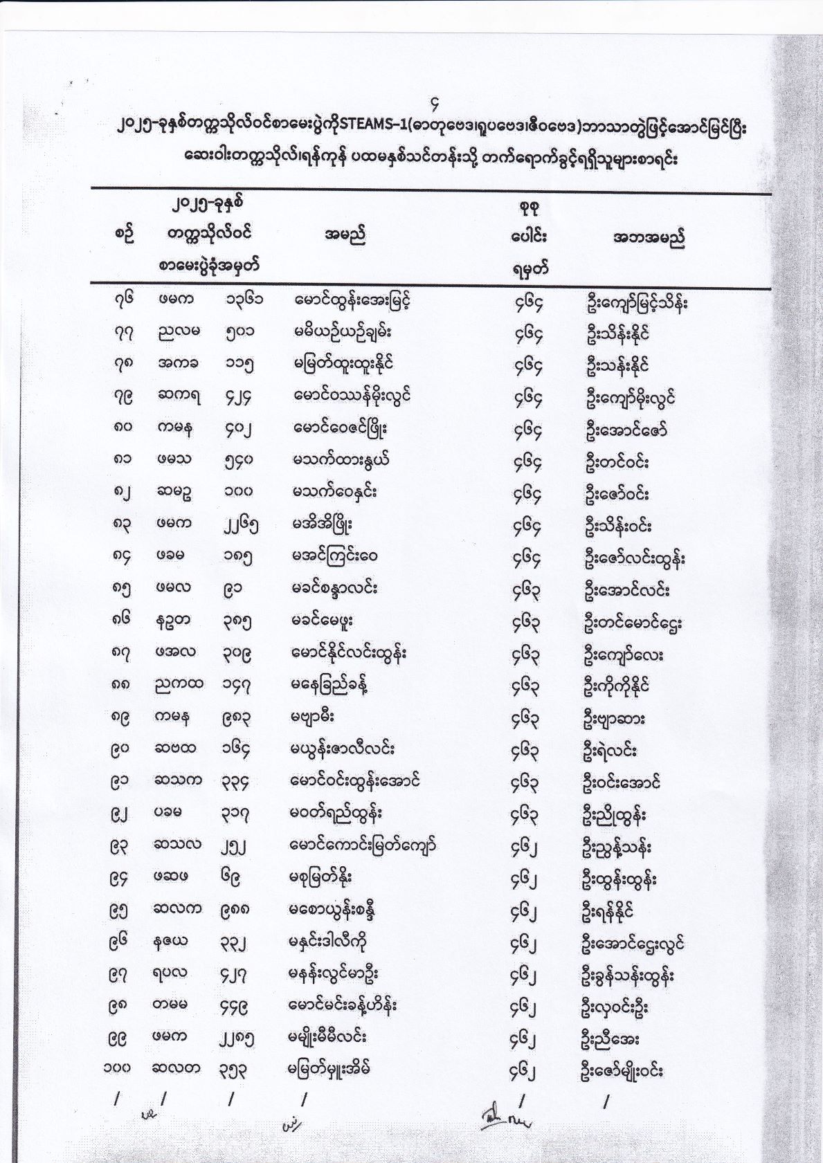 (၂၀၂၅) ခုနှစ်တွင် တက္ကသိုလ်ဝင်စာမေးပွဲကို STEAMS-1 (ဓာတုဗေဒ၊ ရူပဗေဒ၊ ဇီဝဗေဒ) ဘာသာတွဲ ဖြင့်အောင်မြင်ပြီး ကျန်းမာရေးလူ့စွမ်းအားအရင်းအမြစ်ဦးစီးဌာန၊ ဆေးပညာနှီးနွှယ်တက္ကသိုလ်များ၏ ပထမနှစ်သင်တန်းသို့ ဝင်ခွင့်ရရှိသည့် ကျောင်းသား/သူများစာရင်း