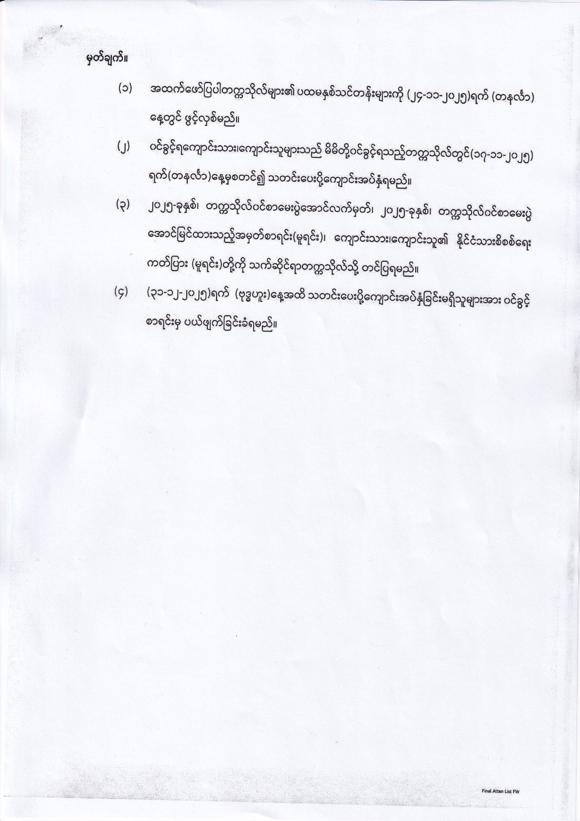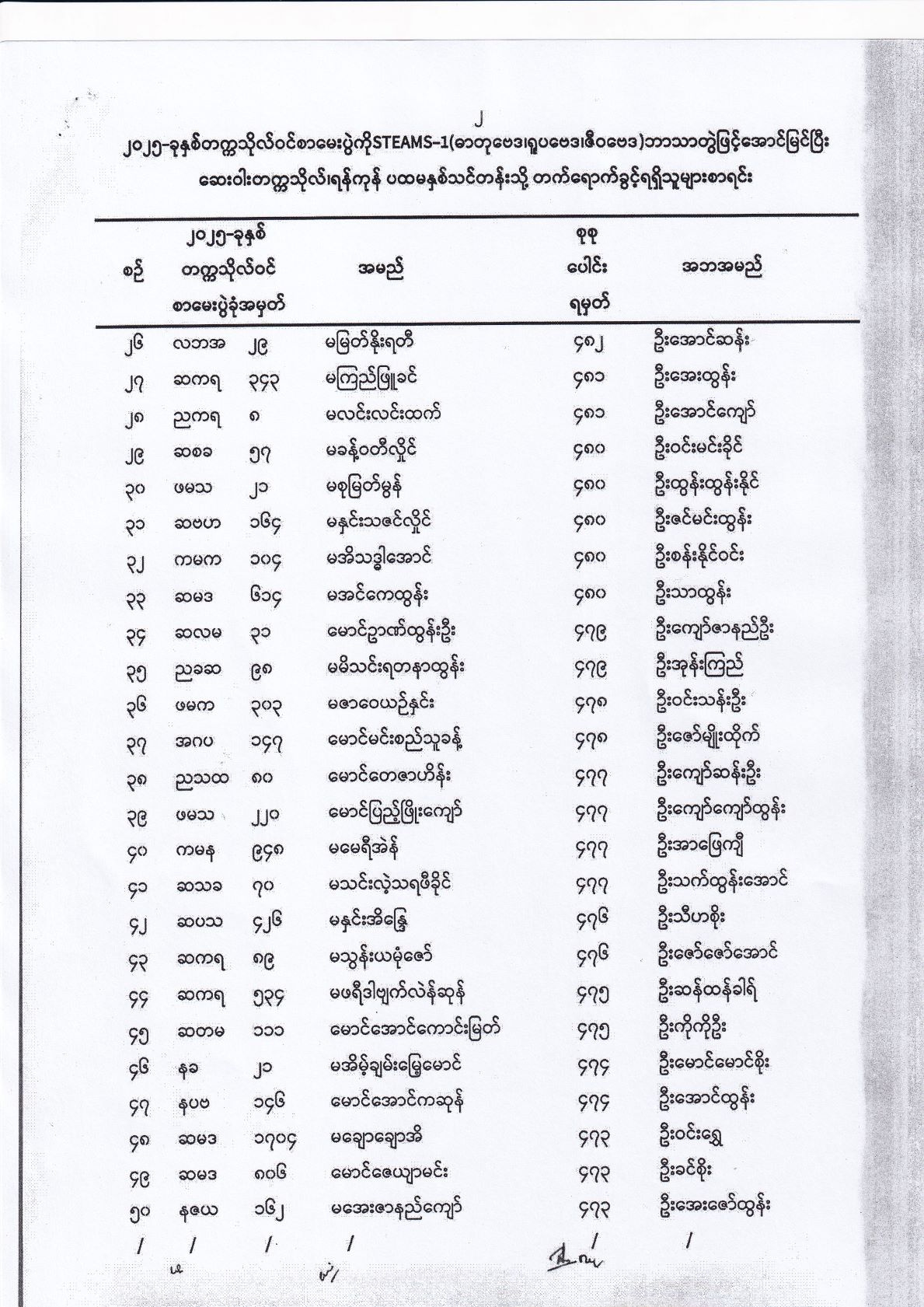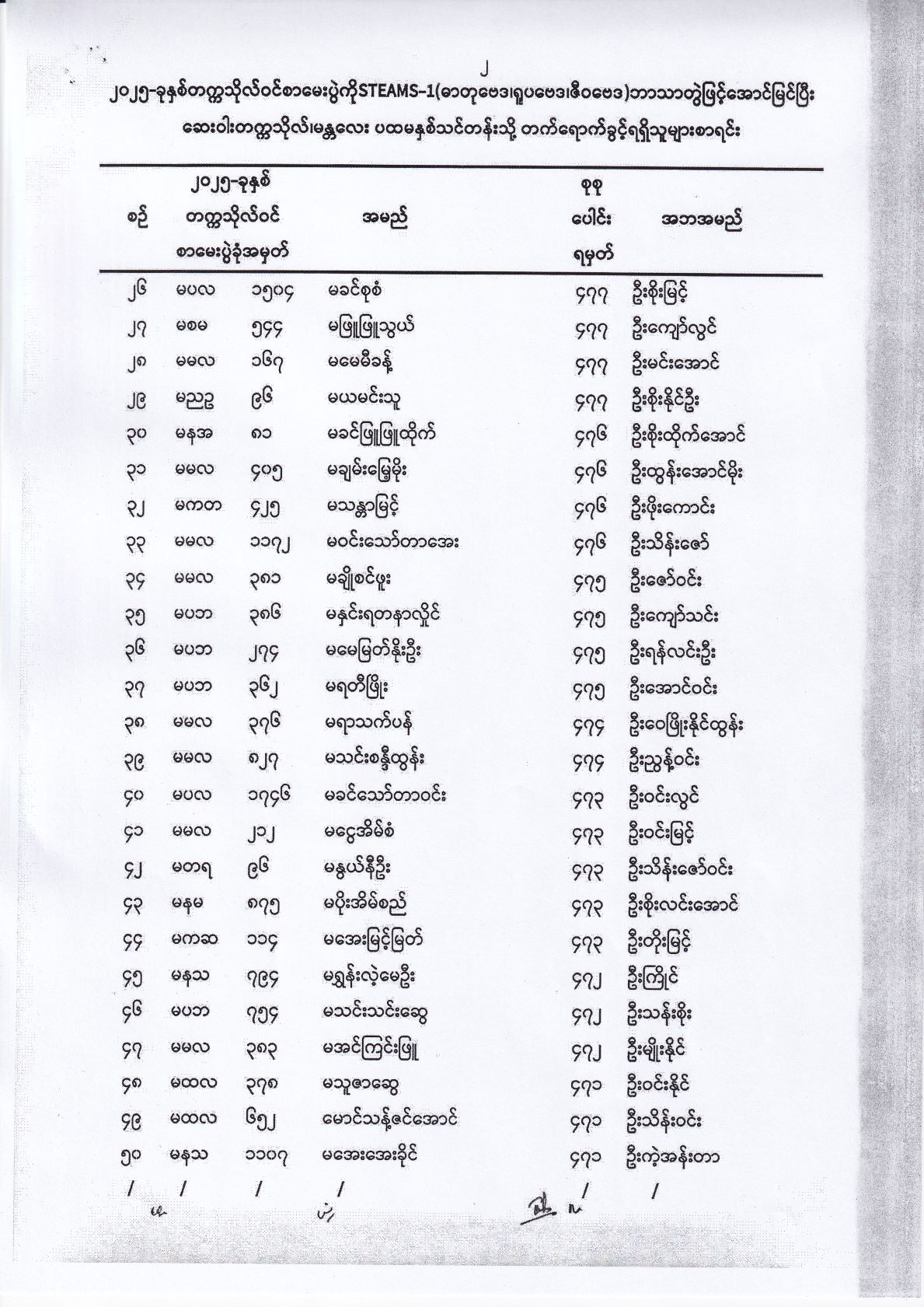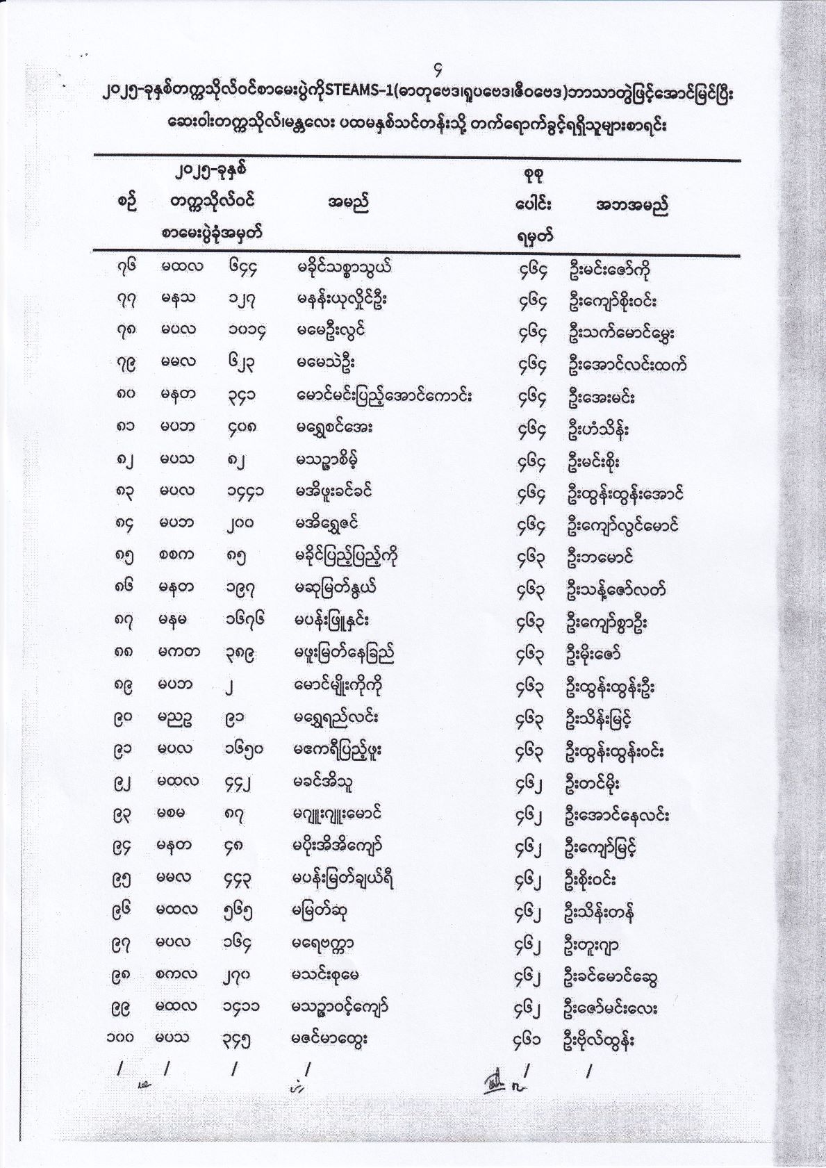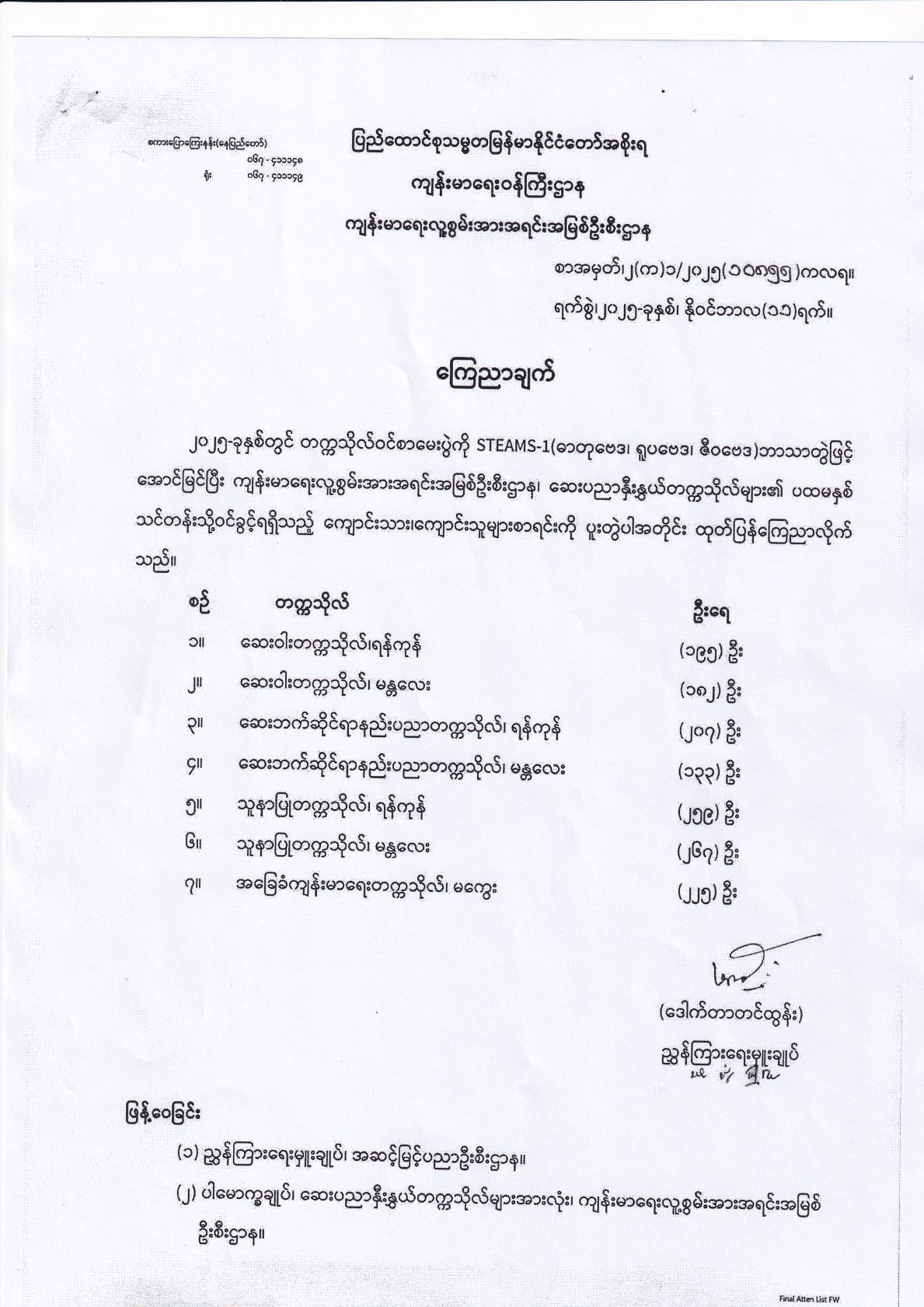 (၂၀၂၅) ခုနှစ်တွင် တက္ကသိုလ်ဝင်စာမေးပွဲကို STEAMS-1 (ဓာတုဗေဒ၊ ရူပဗေဒ၊ ဇီဝဗေဒ) ဘာသာတွဲ ဖြင့်အောင်မြင်ပြီး ကျန်းမာရေးလူ့စွမ်းအားအရင်းအမြစ်ဦးစီးဌာန၊ ဆေးပညာနှီးနွှယ်တက္ကသိုလ်များ၏ ပထမနှစ်သင်တန်းသို့ ဝင်ခွင့်ရရှိသည့် ကျောင်းသား/သူများစာရင်း