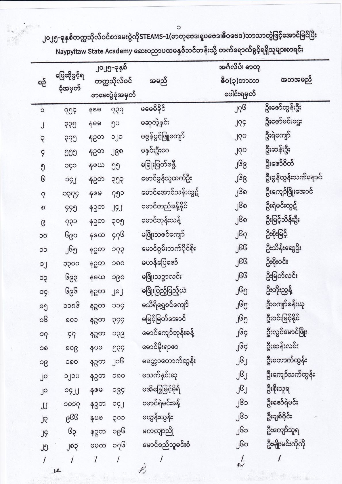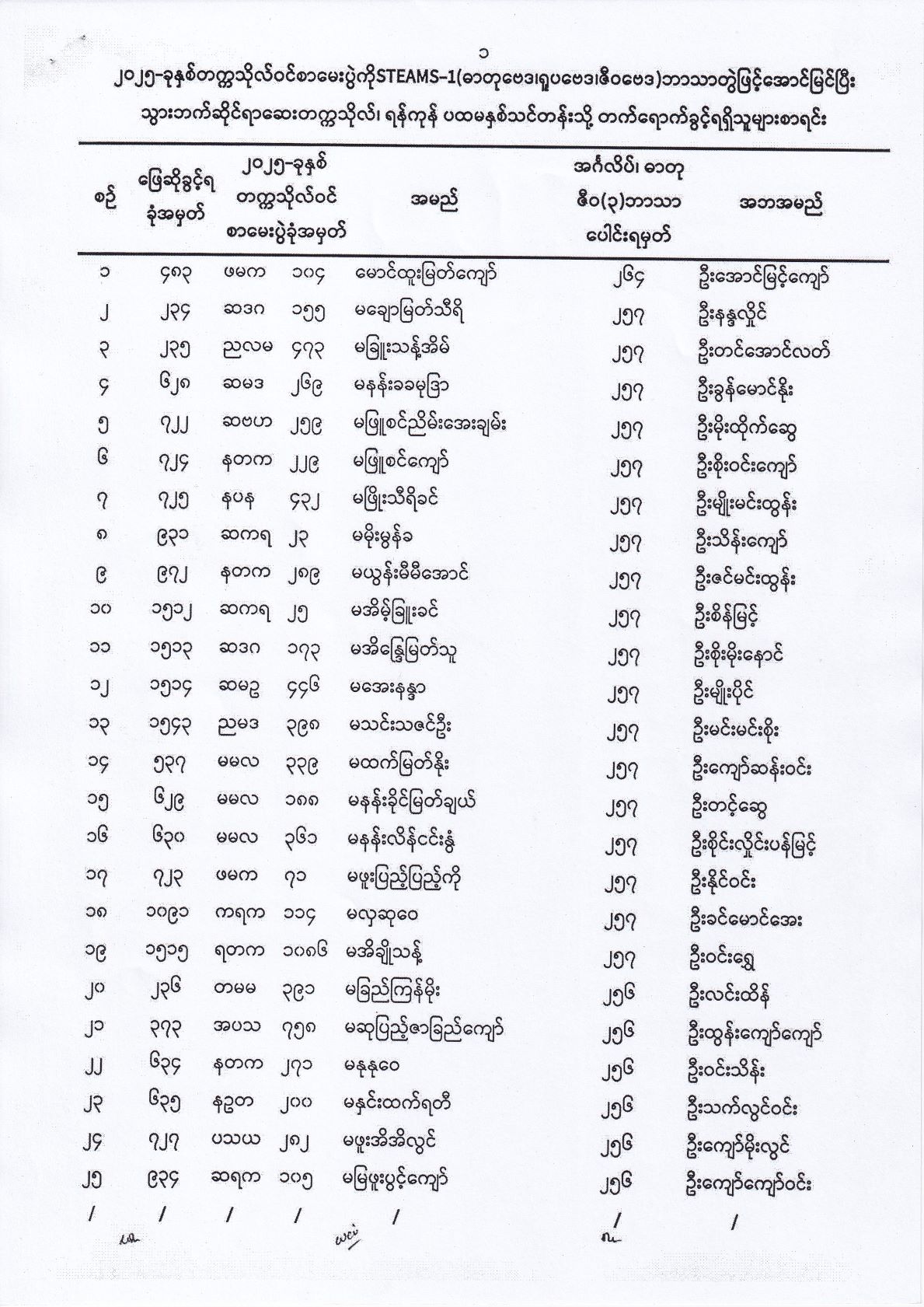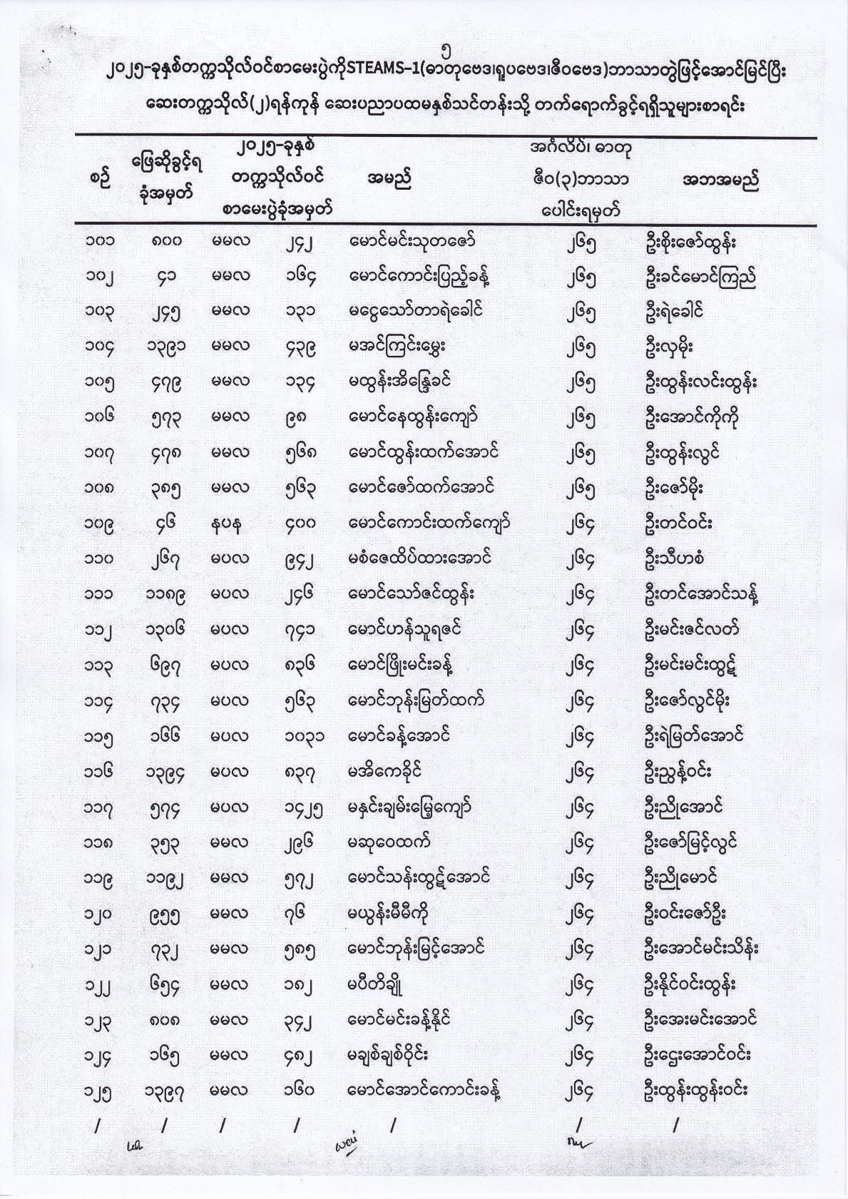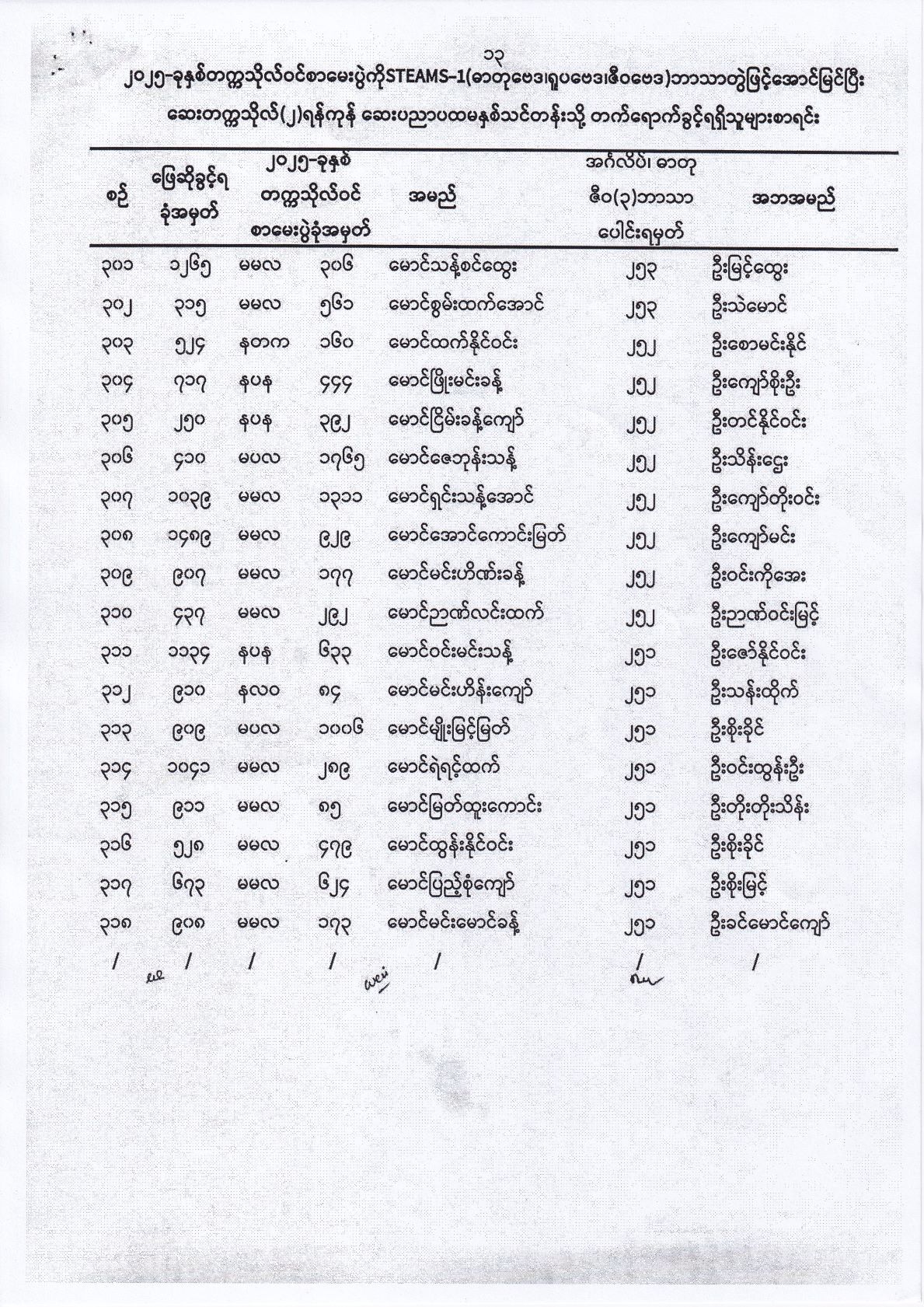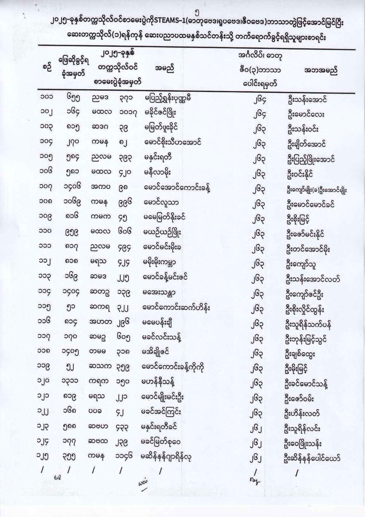(၂၀၂၅) ခုနှစ်တွင် တက္ကသိုလ်ဝင်စာမေးပွဲကို STEAMS-1 (ဓာတုဗေဒ၊ ရူပဗေဒ၊ ဇီဝဗေဒ) ဘာသာတွဲ ဖြင့် အောင်မြင်ပြီး ကျန်းမာရေးလူ့စွမ်းအားအရင်းအမြစ်ဦးစီးဌာန၊ ဆေးတက္ကသိုလ်များနှင့် သွားဘက်ဆိုင်ရာ ဆေးတက္ကသိုလ်များ၏ ပထမနှစ်သင်တန်းသို့ ဝင်ခွင့်ရရှိသည့် ကျောင်းသား/သူများ