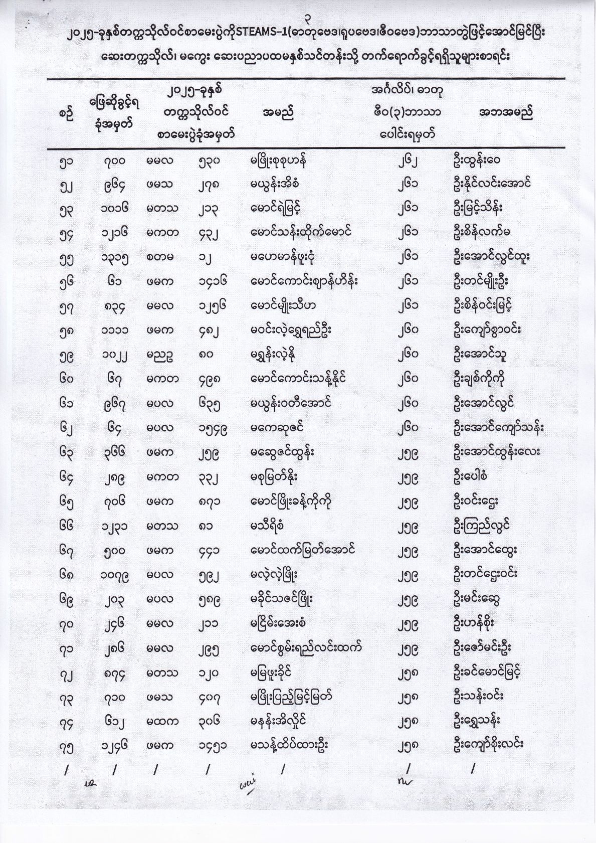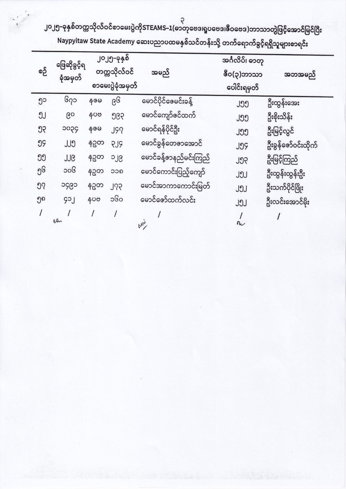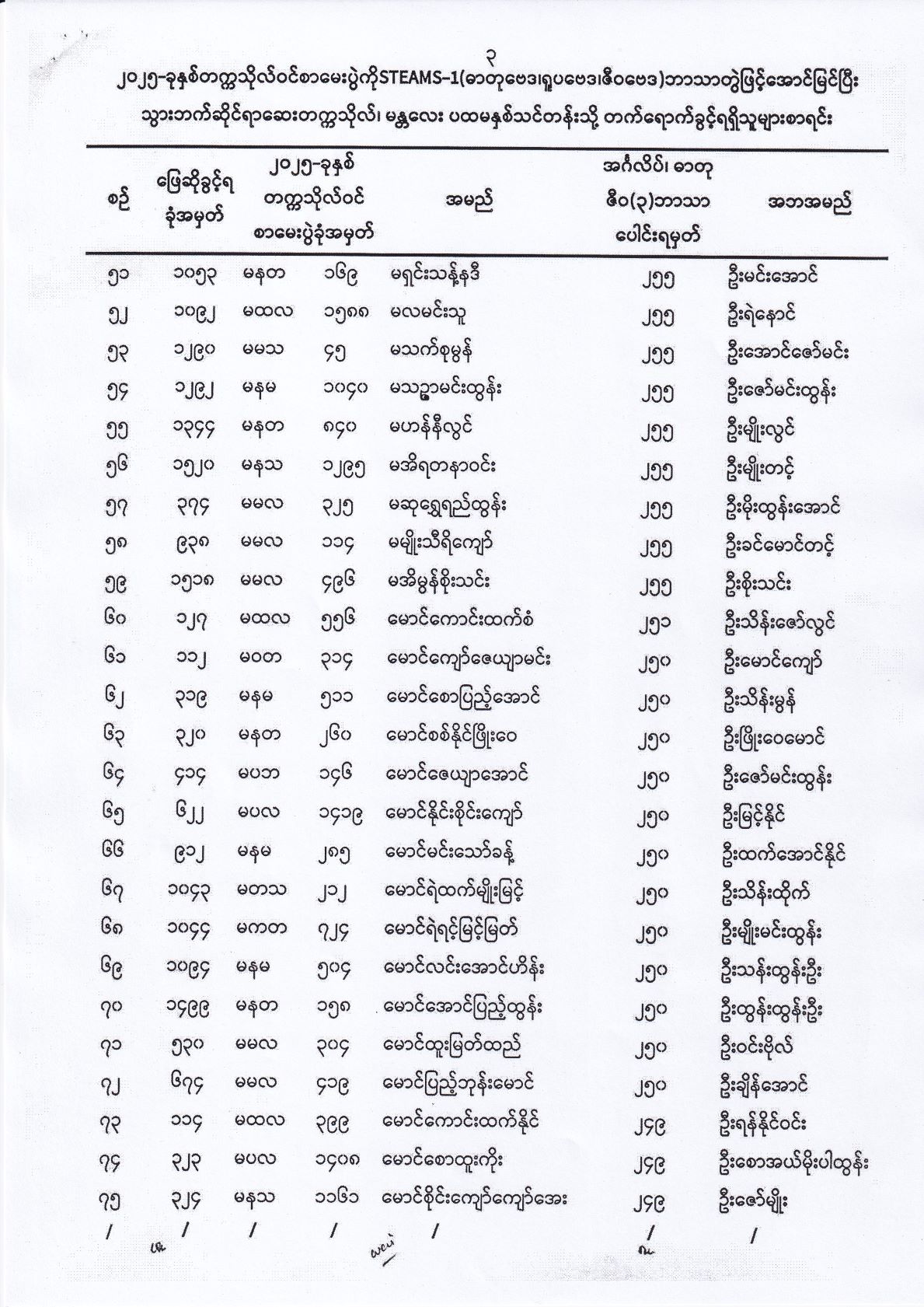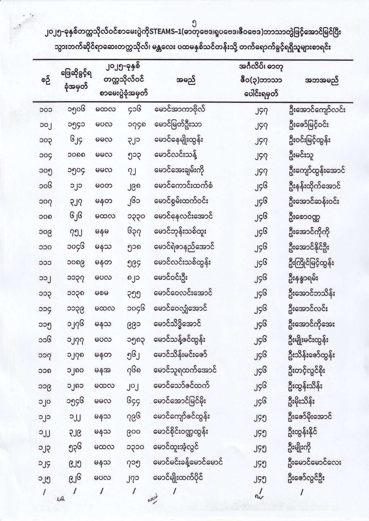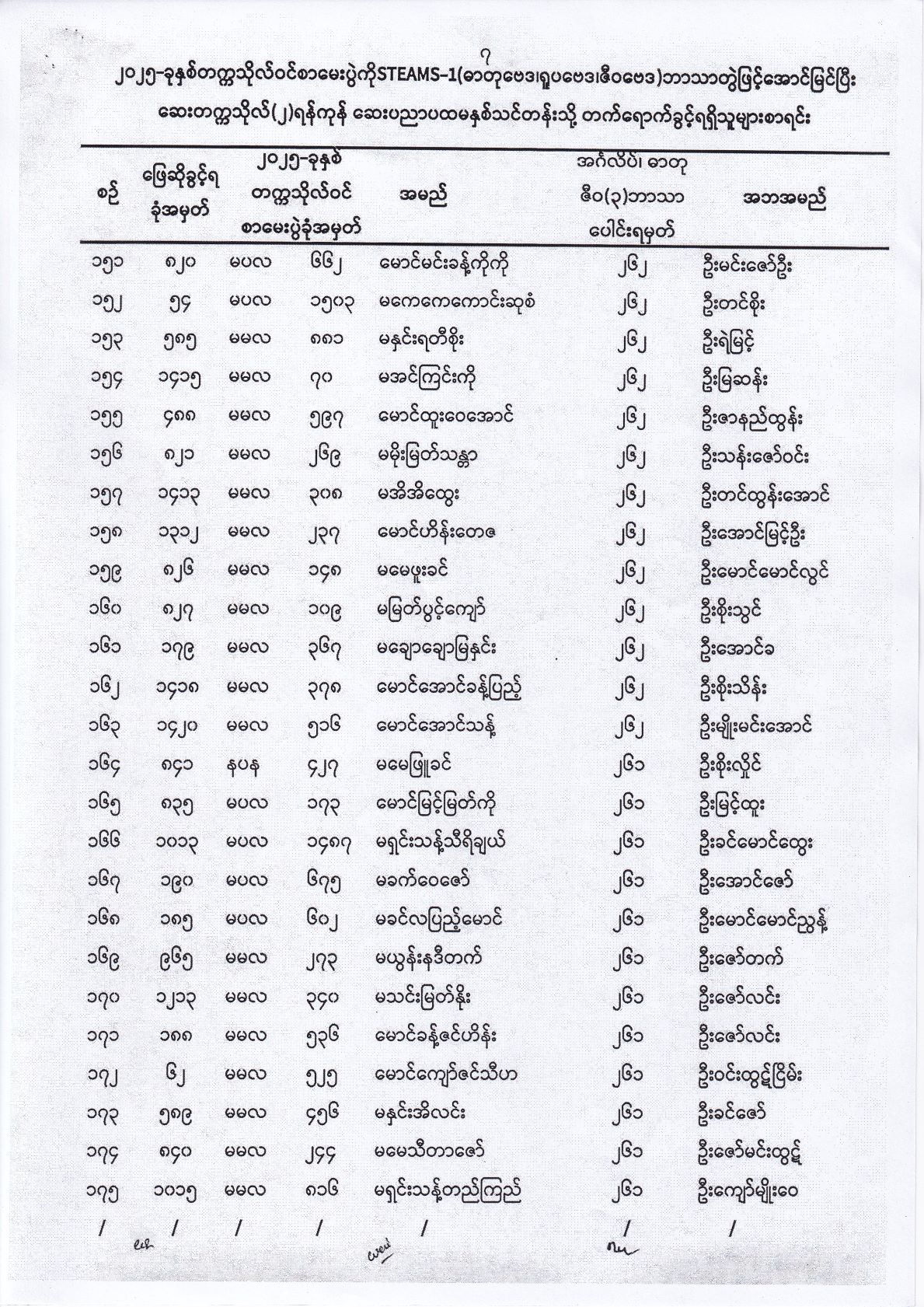 (၂၀၂၅) ခုနှစ်တွင် တက္ကသိုလ်ဝင်စာမေးပွဲကို STEAMS-1 (ဓာတုဗေဒ၊ ရူပဗေဒ၊ ဇီဝဗေဒ) ဘာသာတွဲ ဖြင့် အောင်မြင်ပြီး ကျန်းမာရေးလူ့စွမ်းအားအရင်းအမြစ်ဦးစီးဌာန၊ ဆေးတက္ကသိုလ်များနှင့် သွားဘက်ဆိုင်ရာ ဆေးတက္ကသိုလ်များ၏ ပထမနှစ်သင်တန်းသို့ ဝင်ခွင့်ရရှိသည့် ကျောင်းသား/သူများ