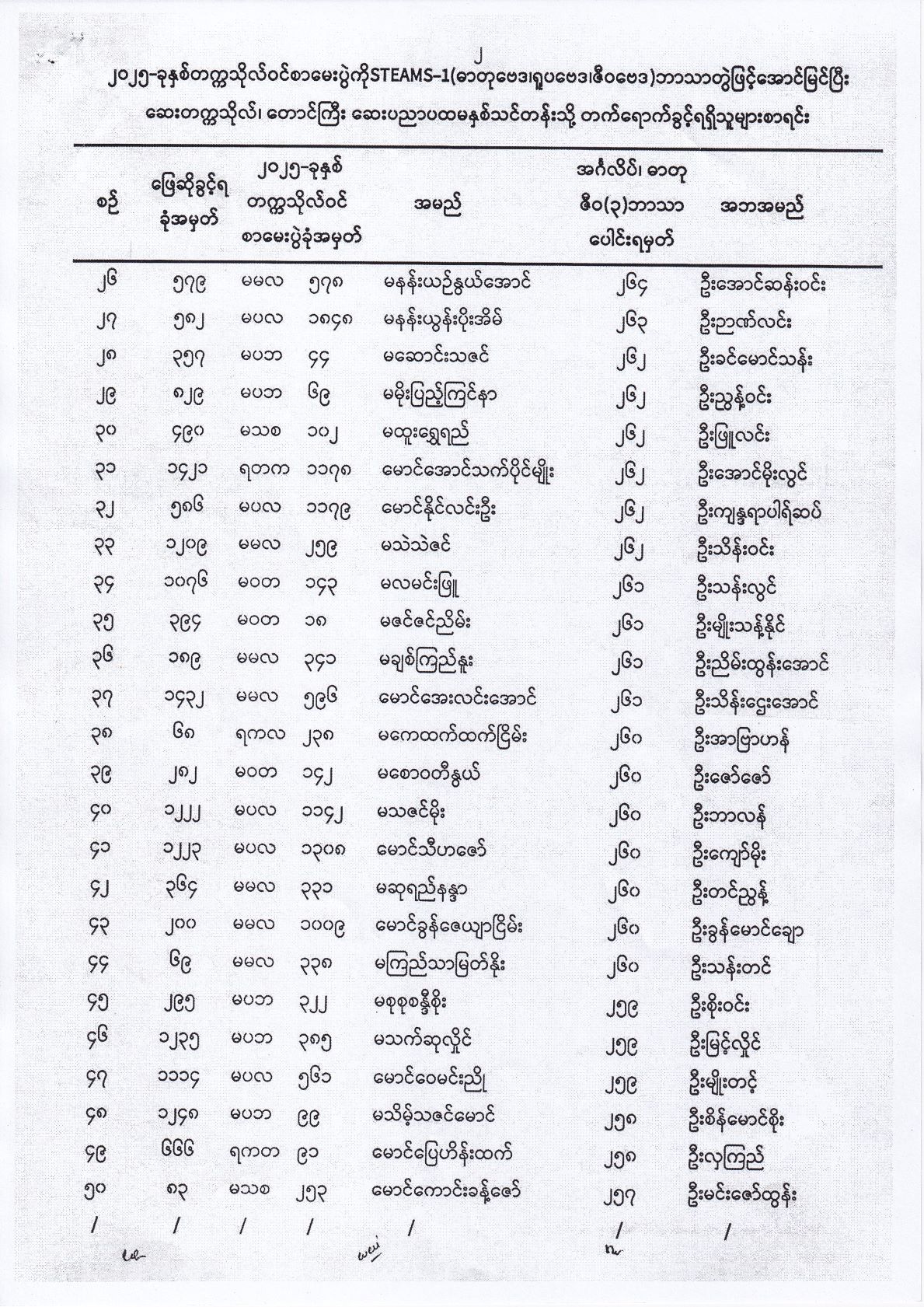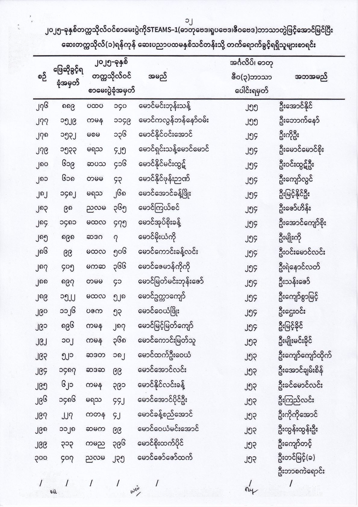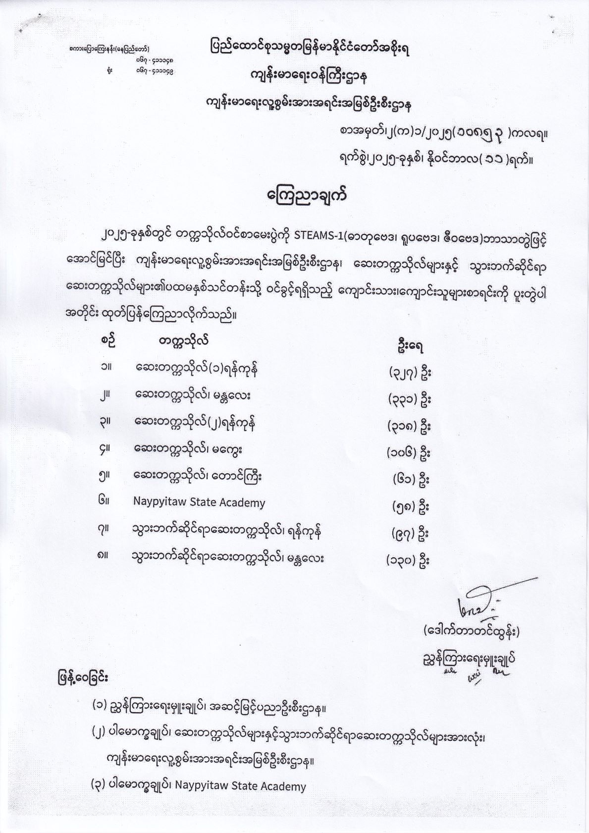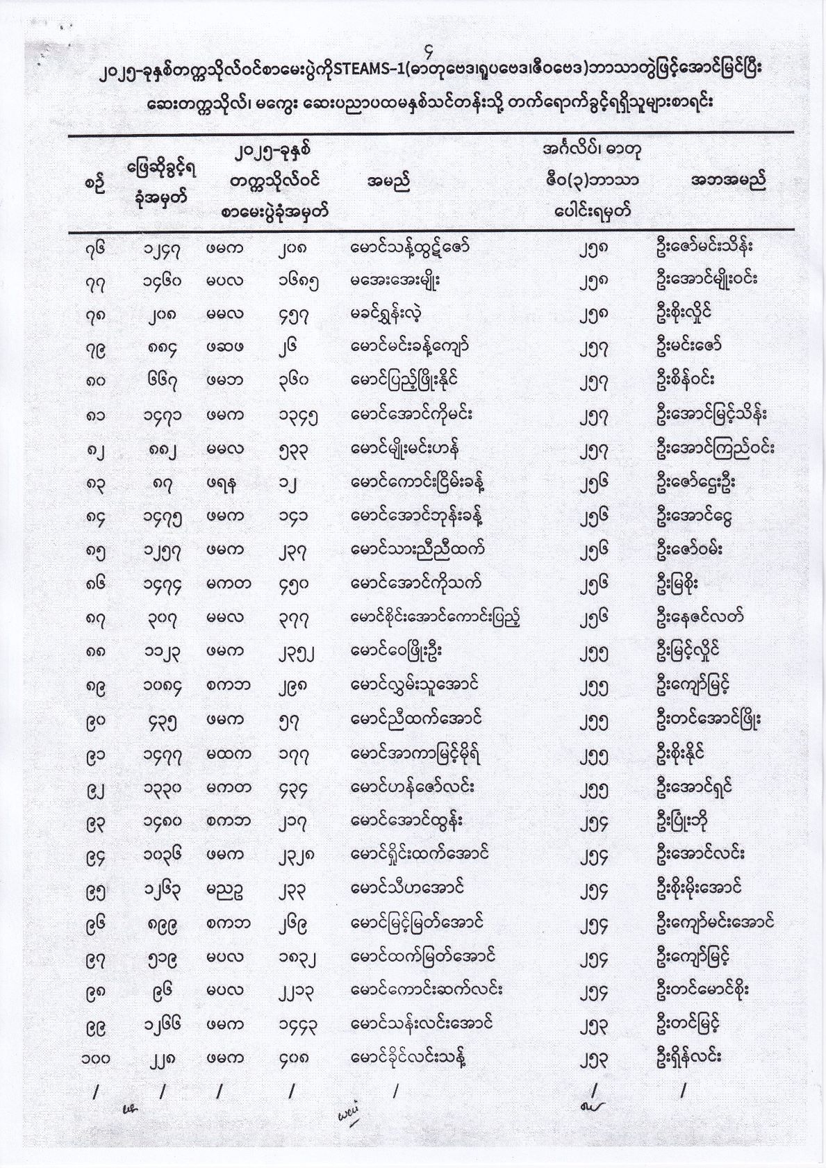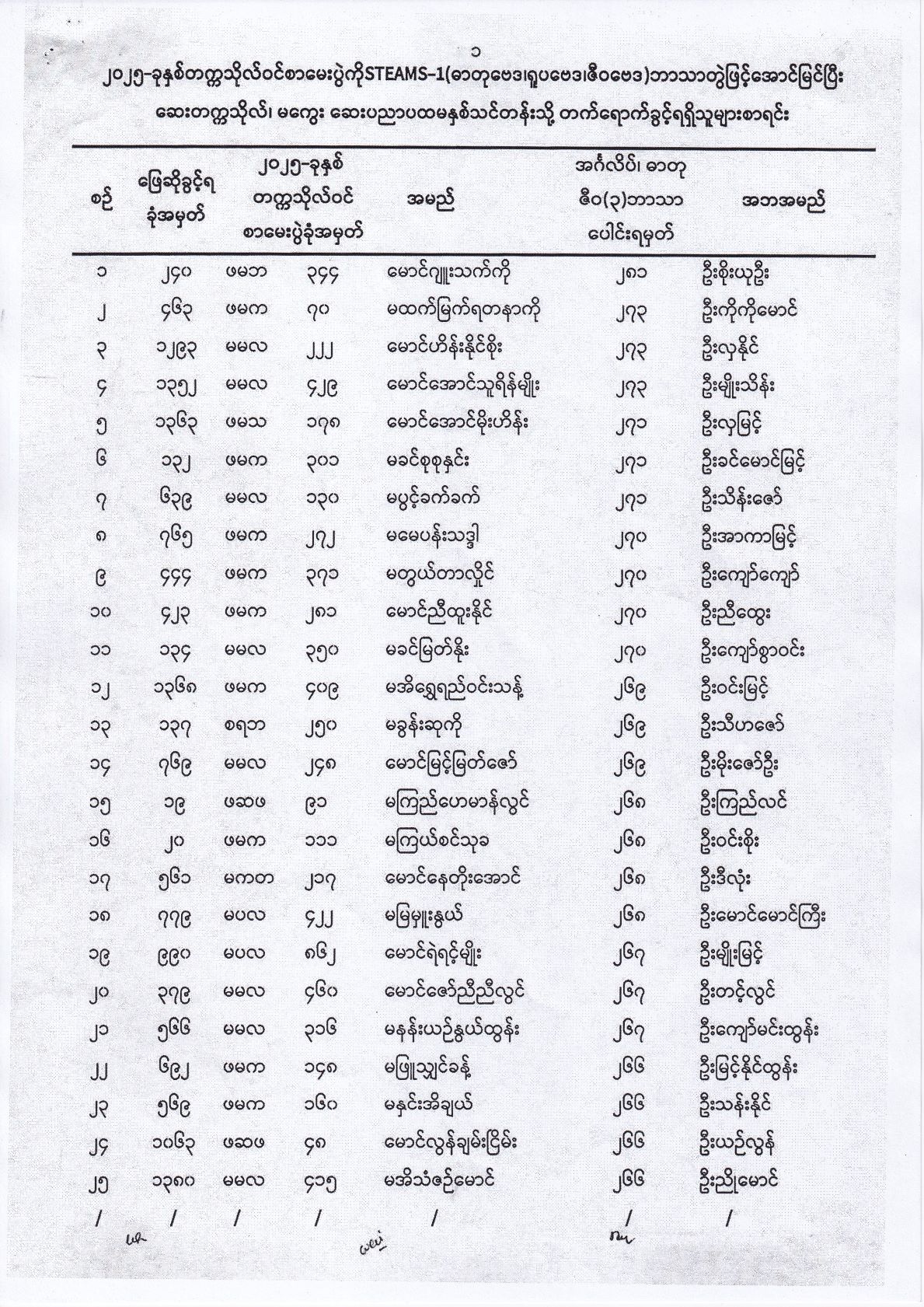 (၂၀၂၅) ခုနှစ်တွင် တက္ကသိုလ်ဝင်စာမေးပွဲကို STEAMS-1 (ဓာတုဗေဒ၊ ရူပဗေဒ၊ ဇီဝဗေဒ) ဘာသာတွဲ ဖြင့် အောင်မြင်ပြီး ကျန်းမာရေးလူ့စွမ်းအားအရင်းအမြစ်ဦးစီးဌာန၊ ဆေးတက္ကသိုလ်များနှင့် သွားဘက်ဆိုင်ရာ ဆေးတက္ကသိုလ်များ၏ ပထမနှစ်သင်တန်းသို့ ဝင်ခွင့်ရရှိသည့် ကျောင်းသား/သူများ
