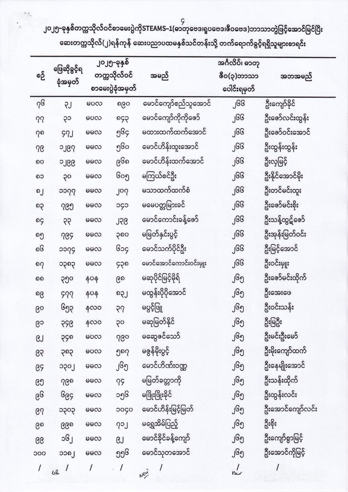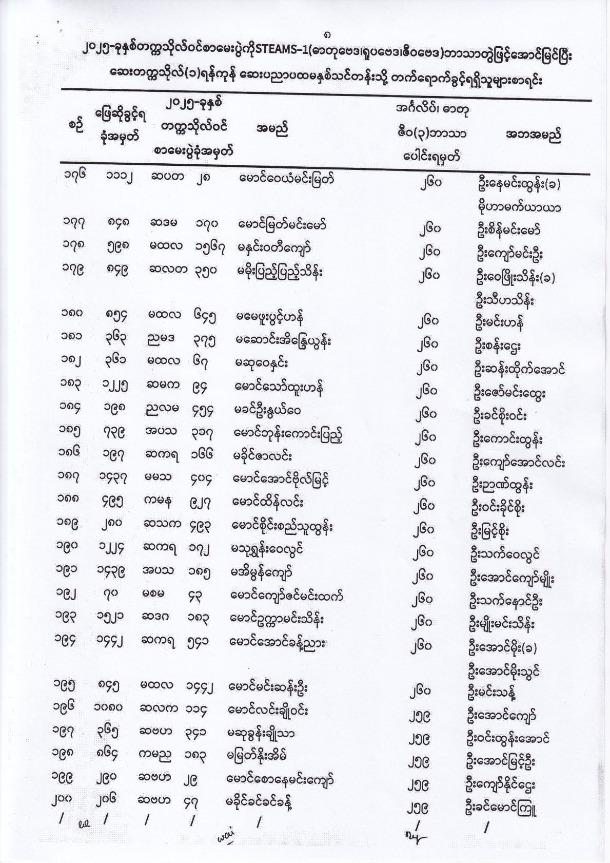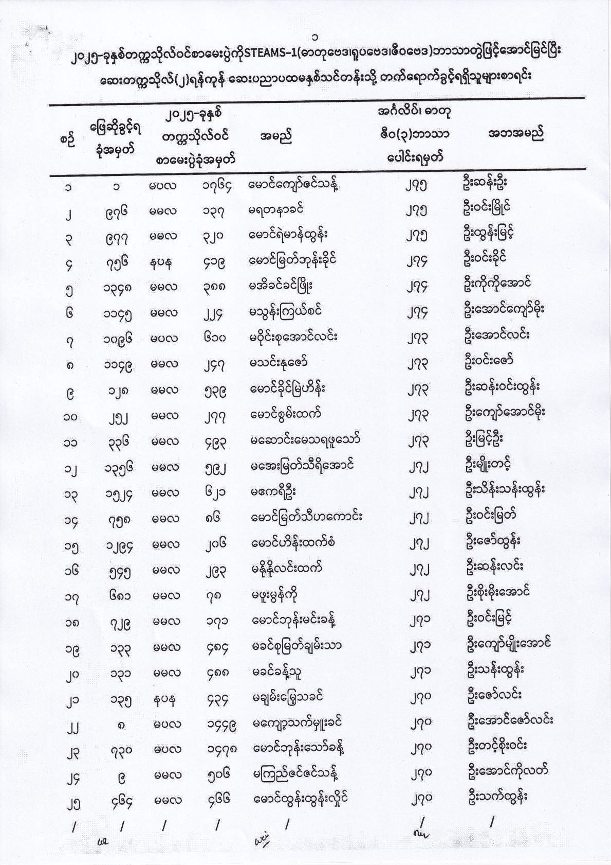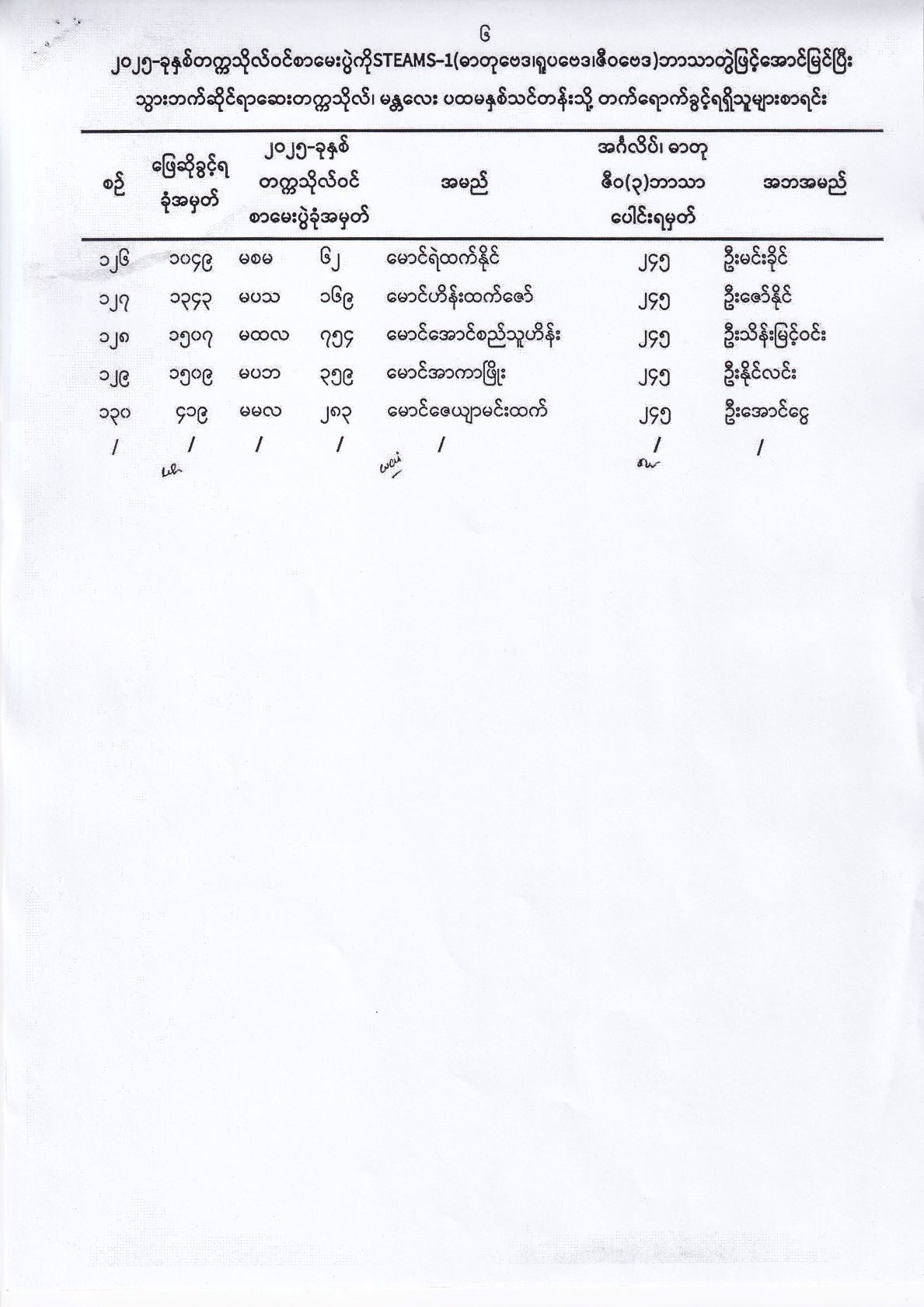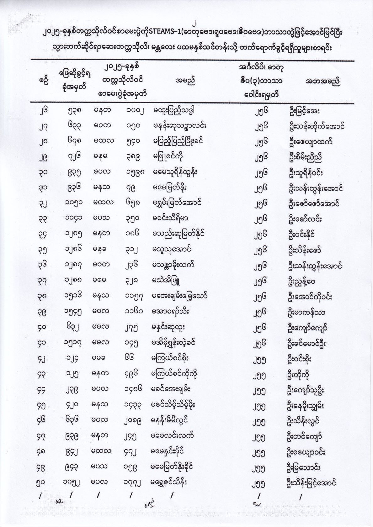 (၂၀၂၅) ခုနှစ်တွင် တက္ကသိုလ်ဝင်စာမေးပွဲကို STEAMS-1 (ဓာတုဗေဒ၊ ရူပဗေဒ၊ ဇီဝဗေဒ) ဘာသာတွဲ ဖြင့် အောင်မြင်ပြီး ကျန်းမာရေးလူ့စွမ်းအားအရင်းအမြစ်ဦးစီးဌာန၊ ဆေးတက္ကသိုလ်များနှင့် သွားဘက်ဆိုင်ရာ ဆေးတက္ကသိုလ်များ၏ ပထမနှစ်သင်တန်းသို့ ဝင်ခွင့်ရရှိသည့် ကျောင်းသား/သူများ