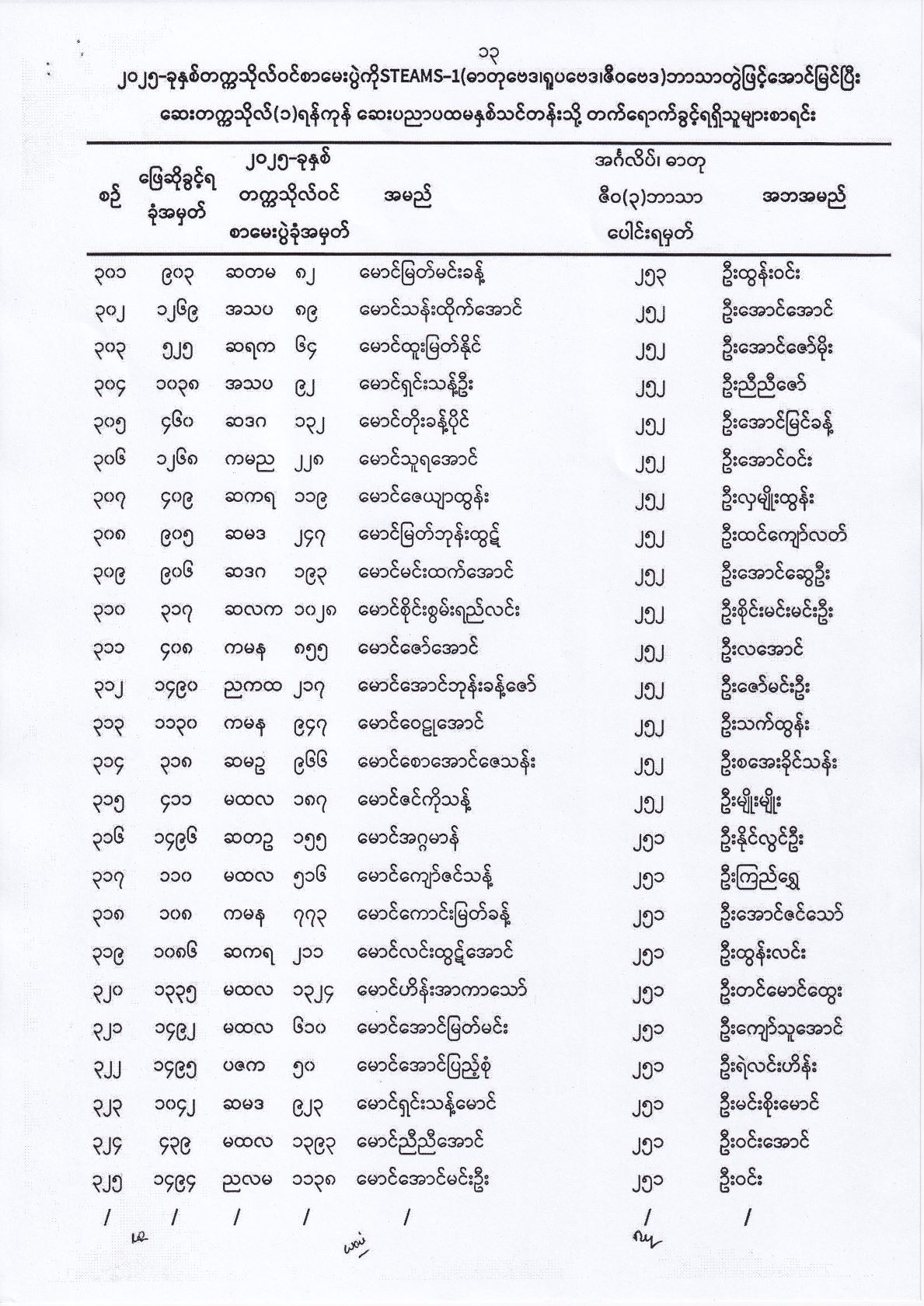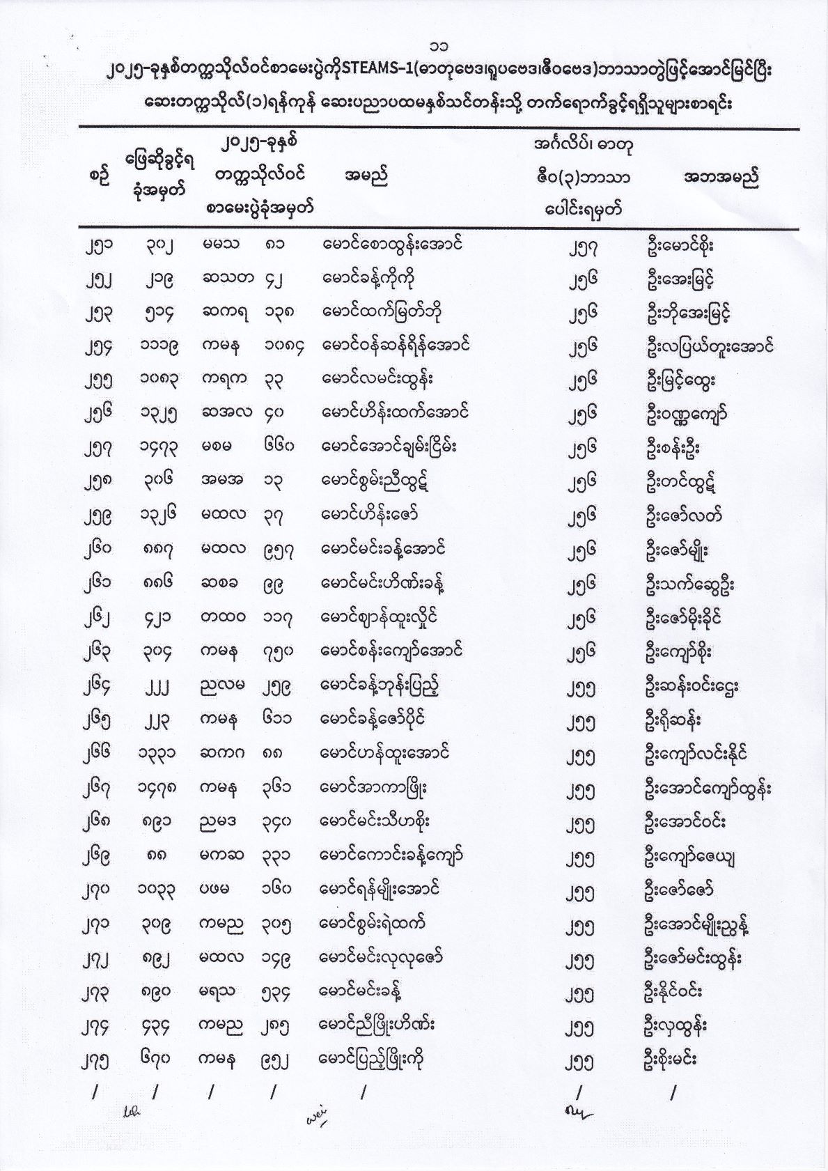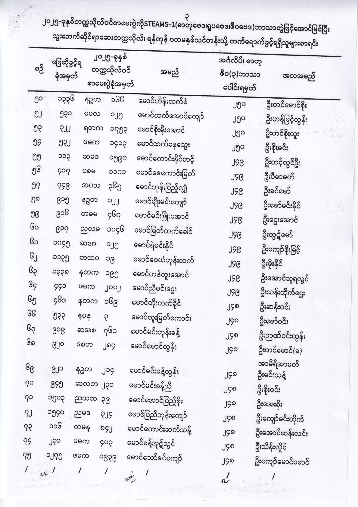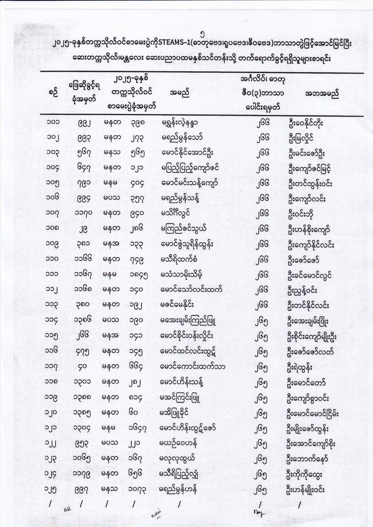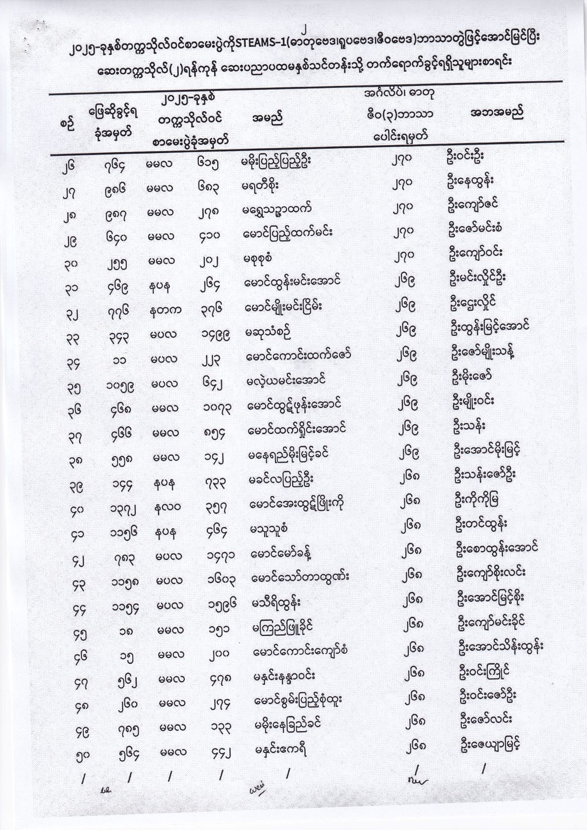 (၂၀၂၅) ခုနှစ်တွင် တက္ကသိုလ်ဝင်စာမေးပွဲကို STEAMS-1 (ဓာတုဗေဒ၊ ရူပဗေဒ၊ ဇီဝဗေဒ) ဘာသာတွဲ ဖြင့် အောင်မြင်ပြီး ကျန်းမာရေးလူ့စွမ်းအားအရင်းအမြစ်ဦးစီးဌာန၊ ဆေးတက္ကသိုလ်များနှင့် သွားဘက်ဆိုင်ရာ ဆေးတက္ကသိုလ်များ၏ ပထမနှစ်သင်တန်းသို့ ဝင်ခွင့်ရရှိသည့် ကျောင်းသား/သူများ