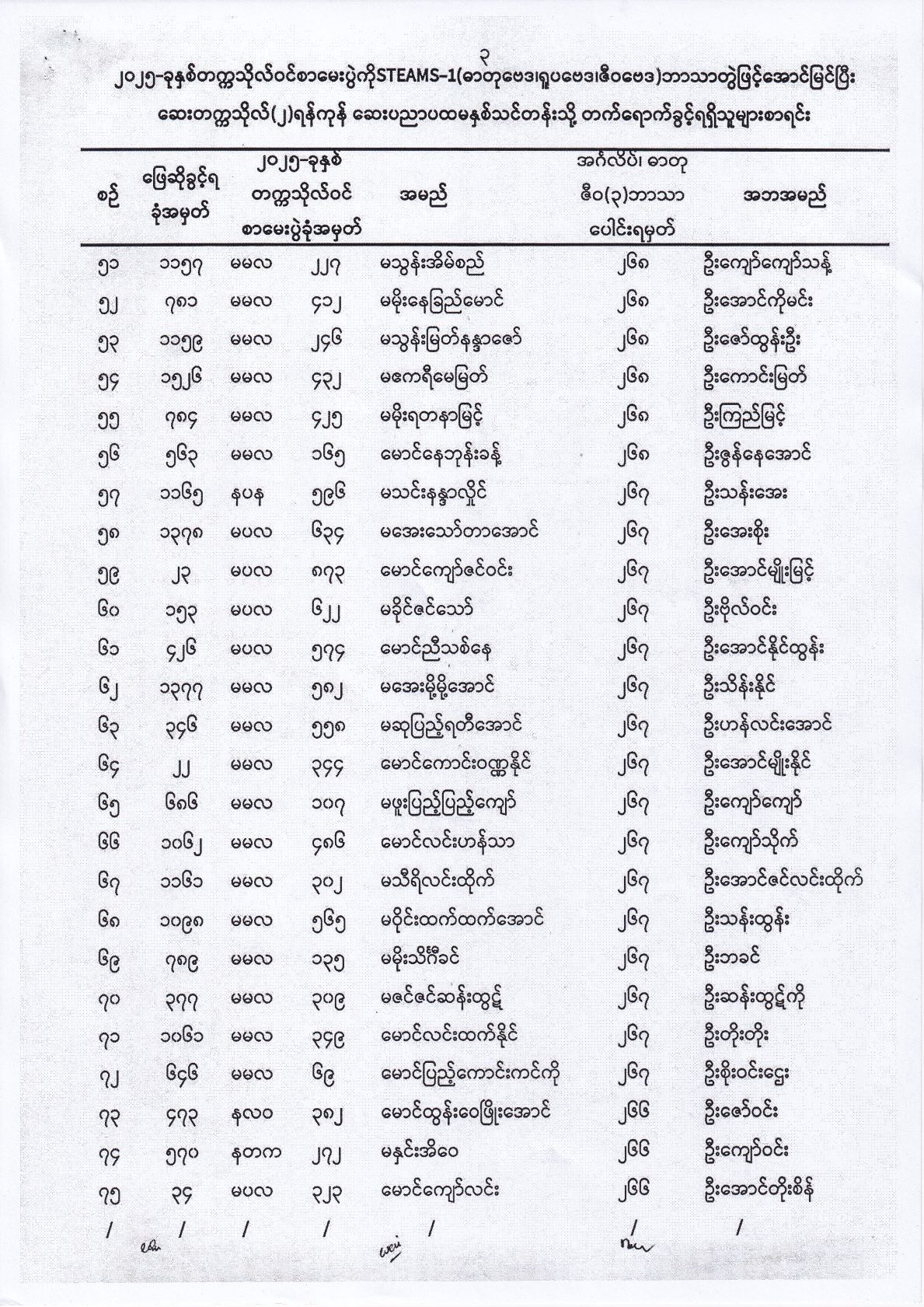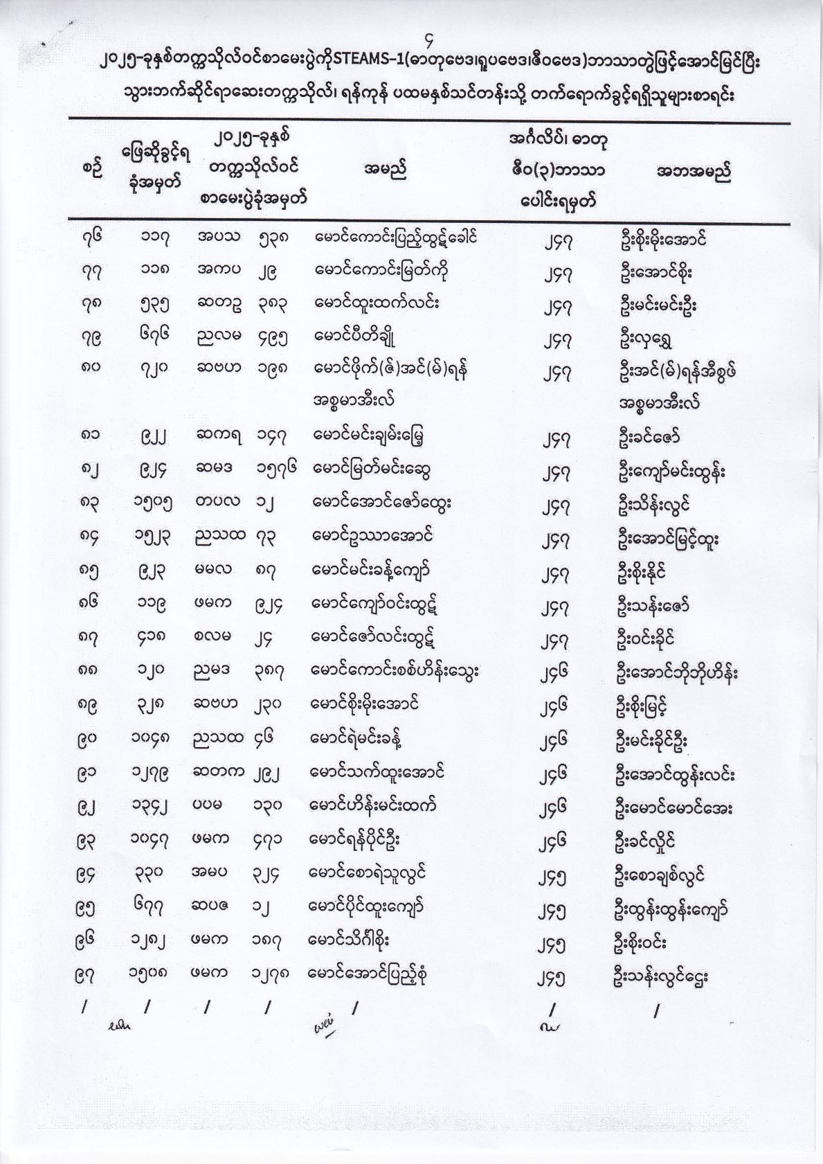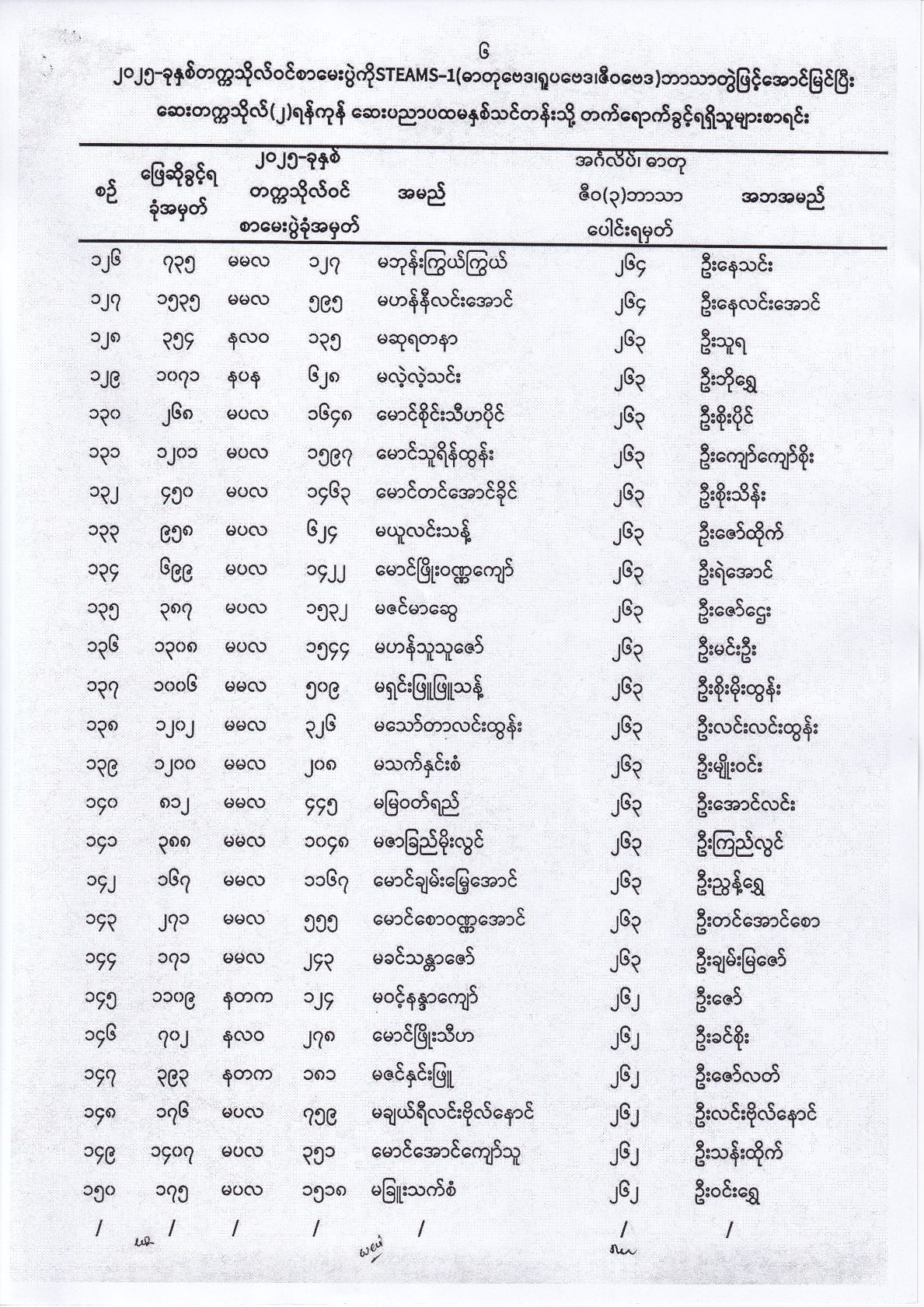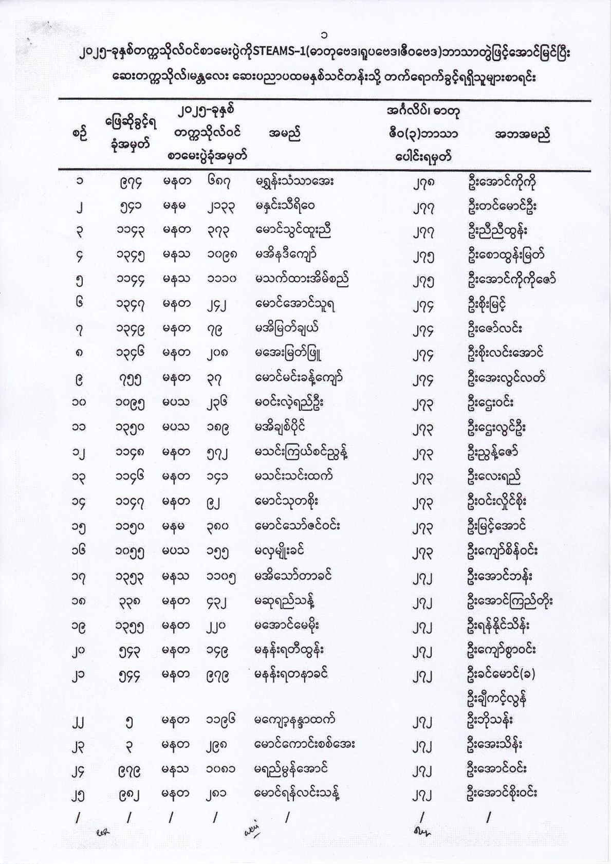 (၂၀၂၅) ခုနှစ်တွင် တက္ကသိုလ်ဝင်စာမေးပွဲကို STEAMS-1 (ဓာတုဗေဒ၊ ရူပဗေဒ၊ ဇီဝဗေဒ) ဘာသာတွဲ ဖြင့် အောင်မြင်ပြီး ကျန်းမာရေးလူ့စွမ်းအားအရင်းအမြစ်ဦးစီးဌာန၊ ဆေးတက္ကသိုလ်များနှင့် သွားဘက်ဆိုင်ရာ ဆေးတက္ကသိုလ်များ၏ ပထမနှစ်သင်တန်းသို့ ဝင်ခွင့်ရရှိသည့် ကျောင်းသား/သူများ