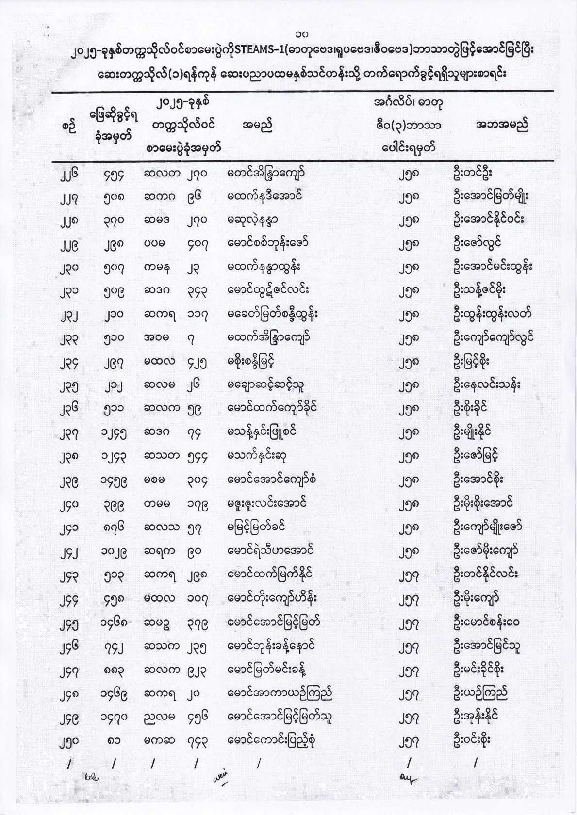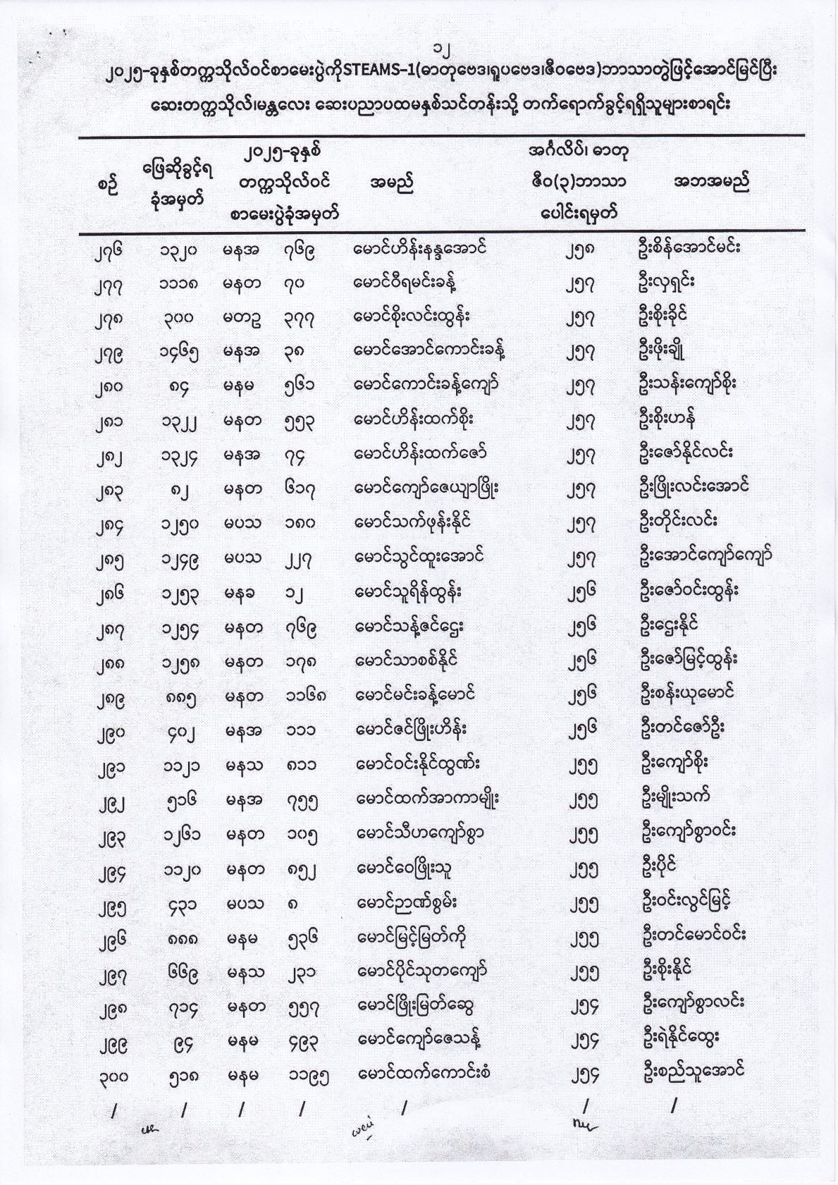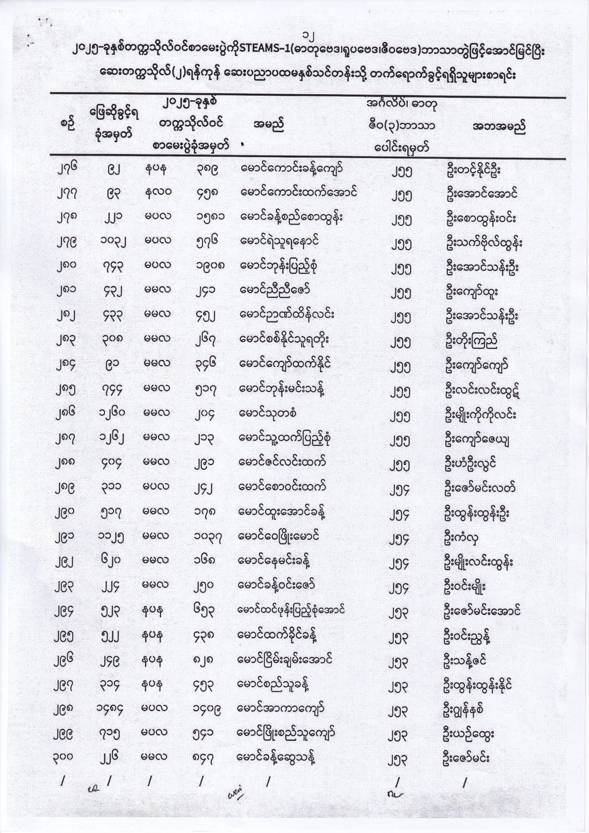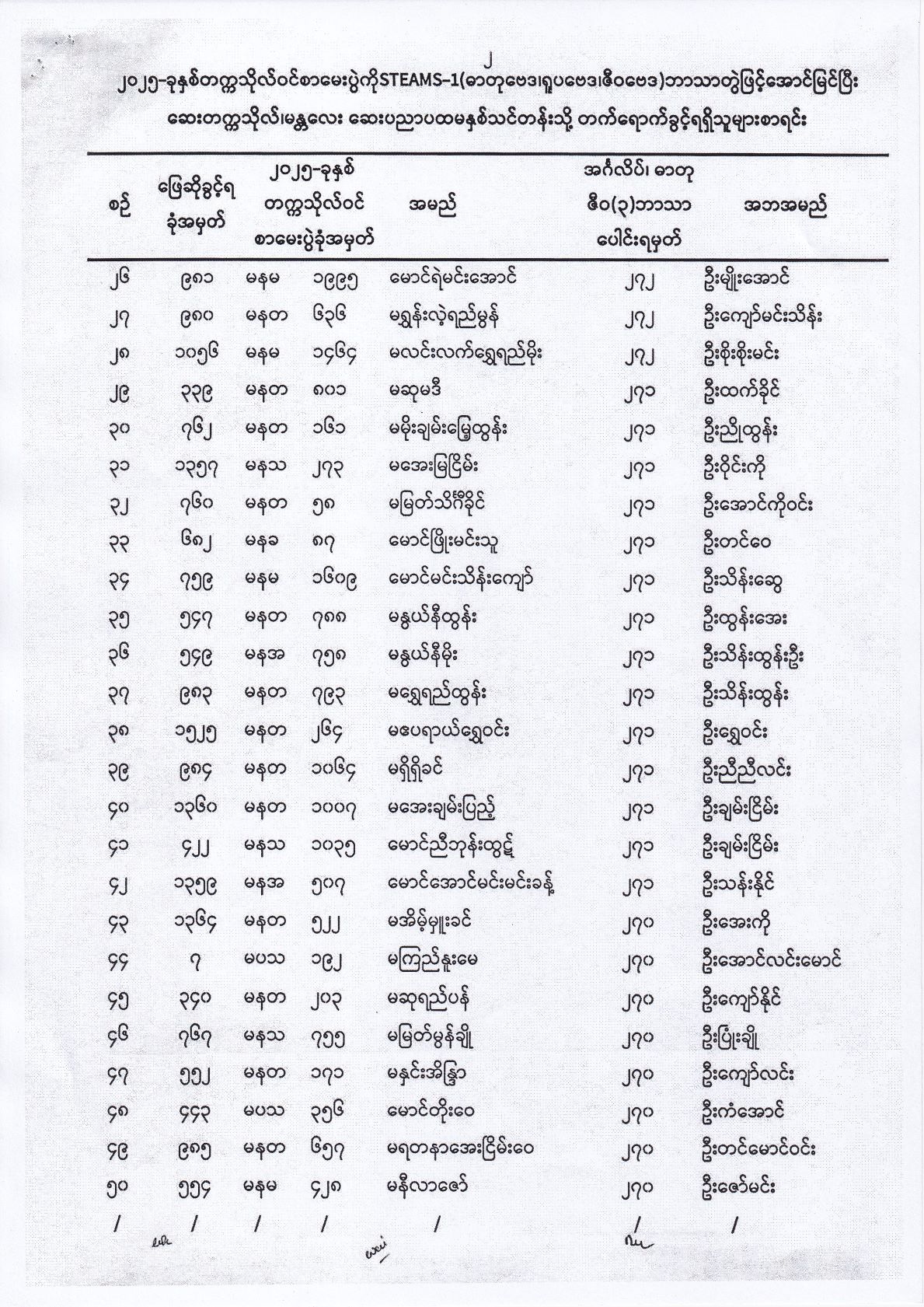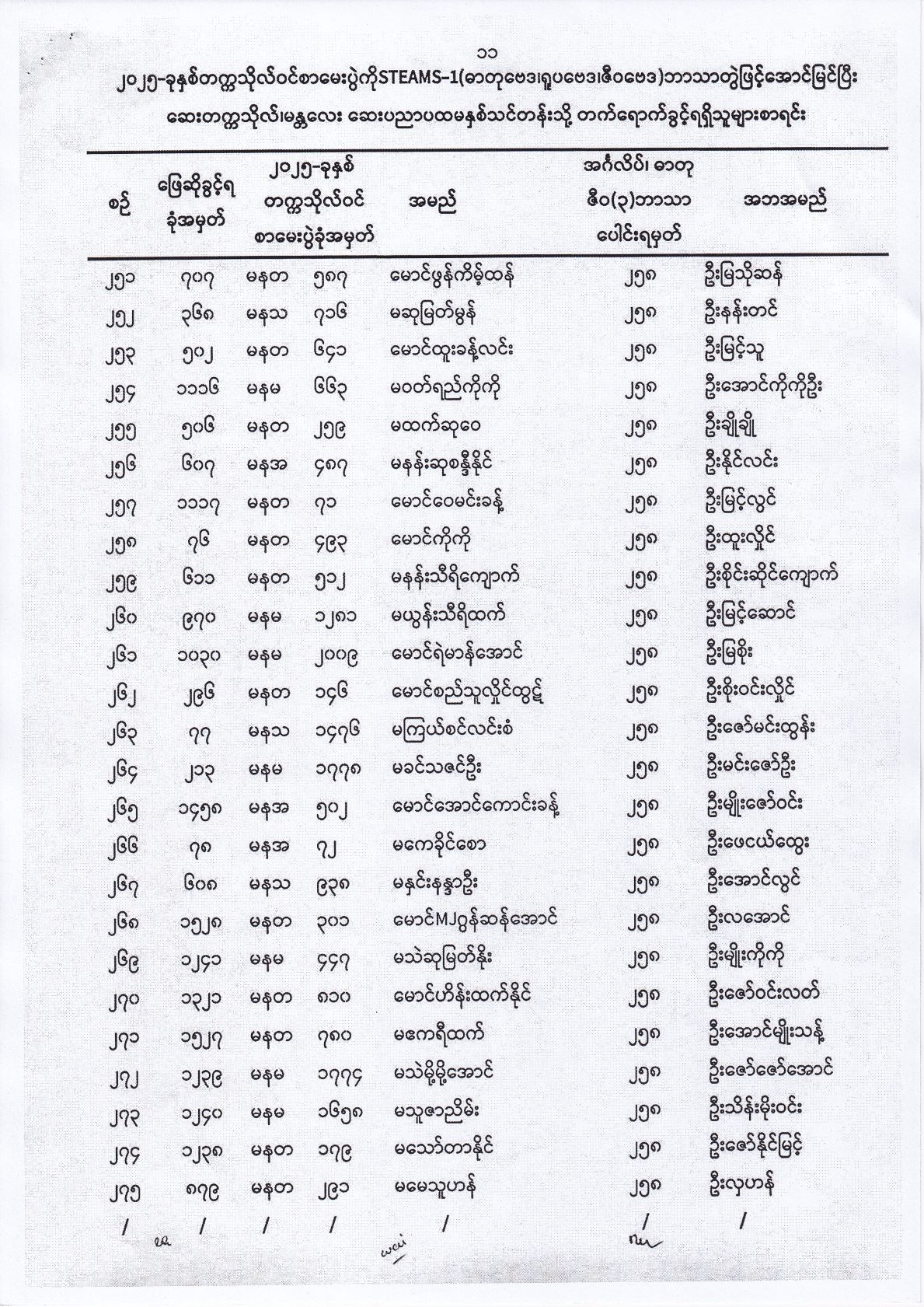 (၂၀၂၅) ခုနှစ်တွင် တက္ကသိုလ်ဝင်စာမေးပွဲကို STEAMS-1 (ဓာတုဗေဒ၊ ရူပဗေဒ၊ ဇီဝဗေဒ) ဘာသာတွဲ ဖြင့် အောင်မြင်ပြီး ကျန်းမာရေးလူ့စွမ်းအားအရင်းအမြစ်ဦးစီးဌာန၊ ဆေးတက္ကသိုလ်များနှင့် သွားဘက်ဆိုင်ရာ ဆေးတက္ကသိုလ်များ၏ ပထမနှစ်သင်တန်းသို့ ဝင်ခွင့်ရရှိသည့် ကျောင်းသား/သူများ