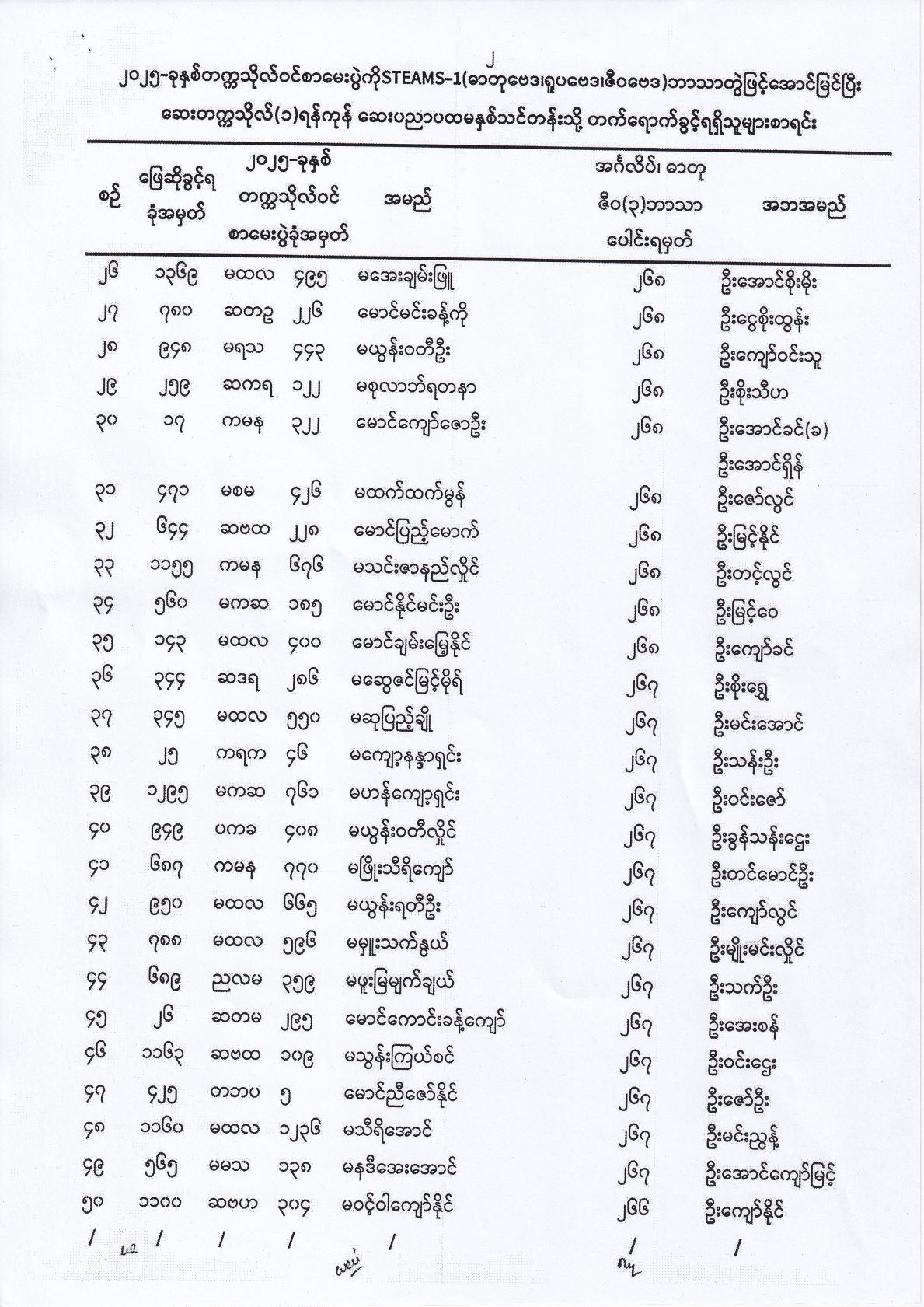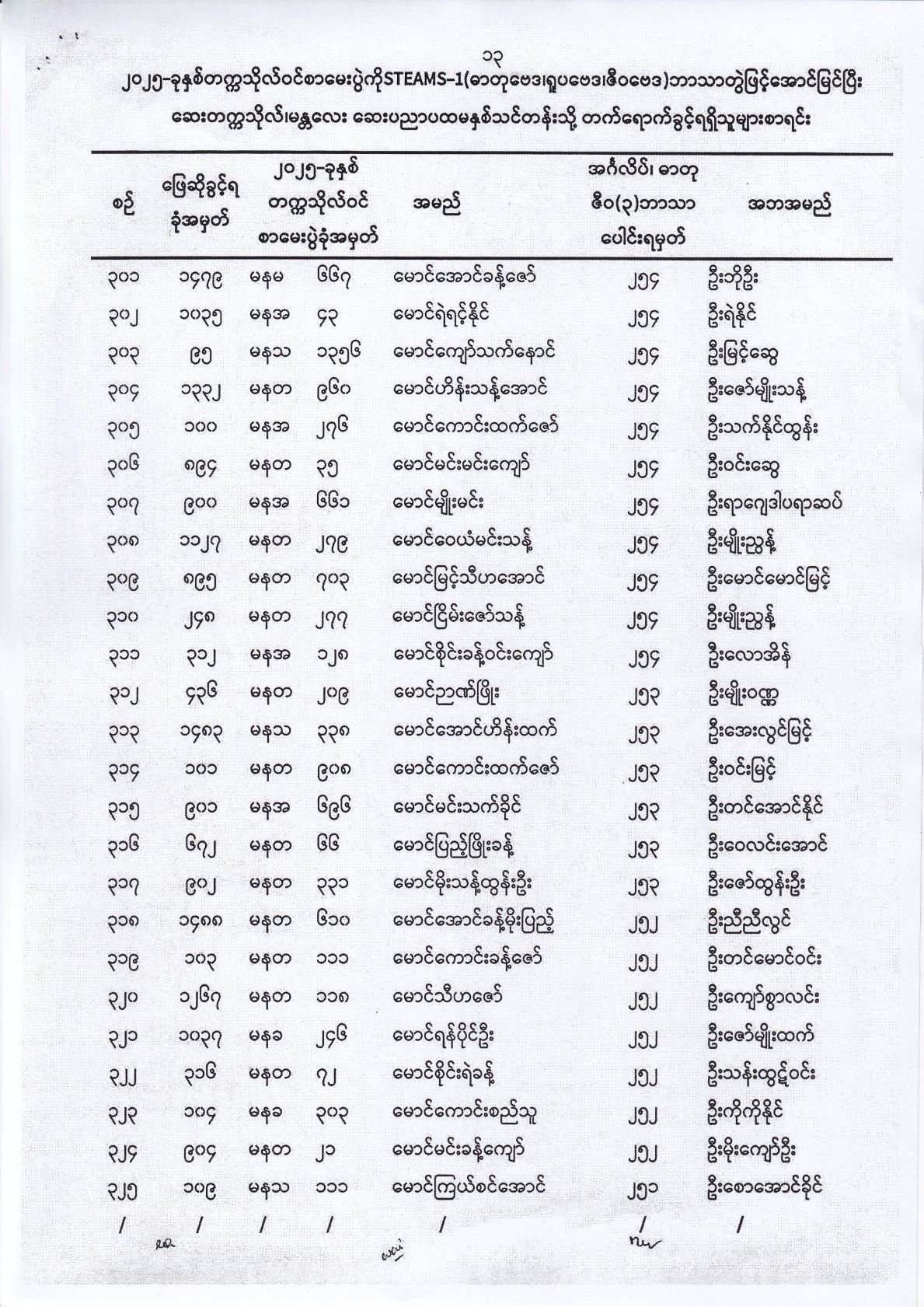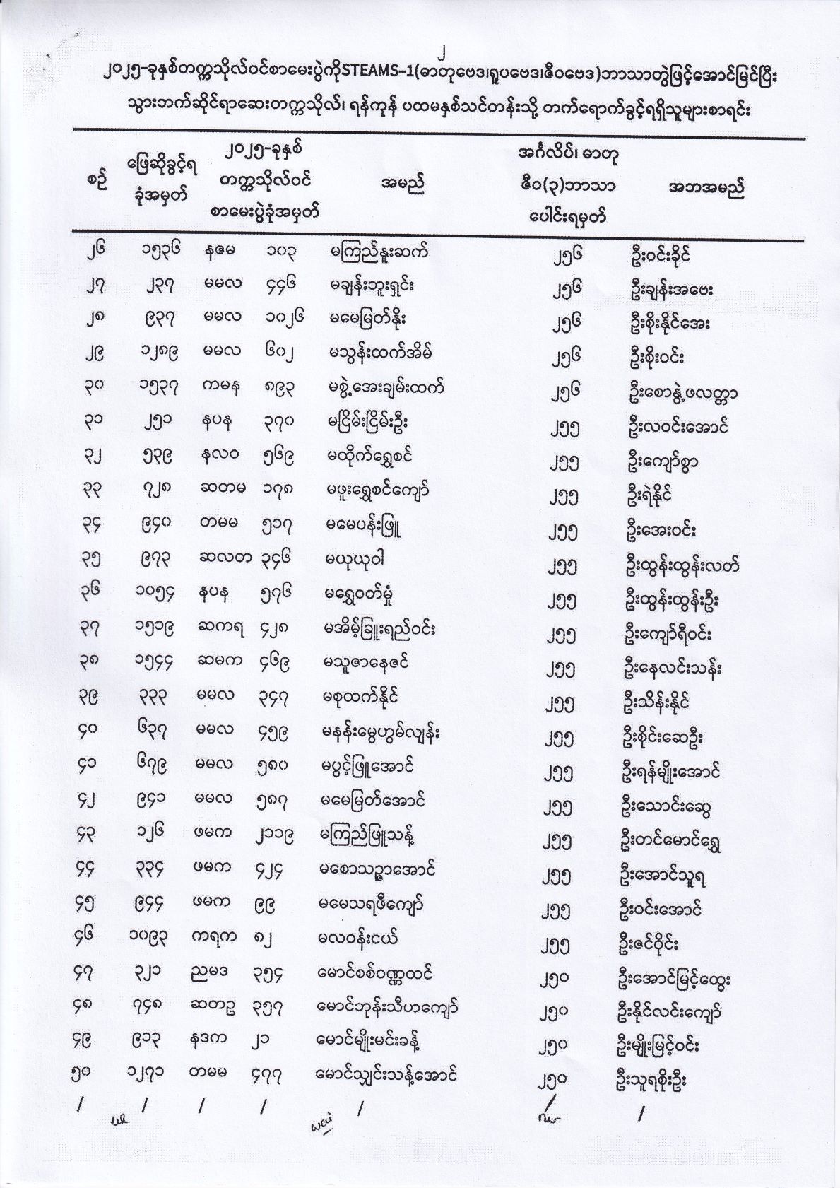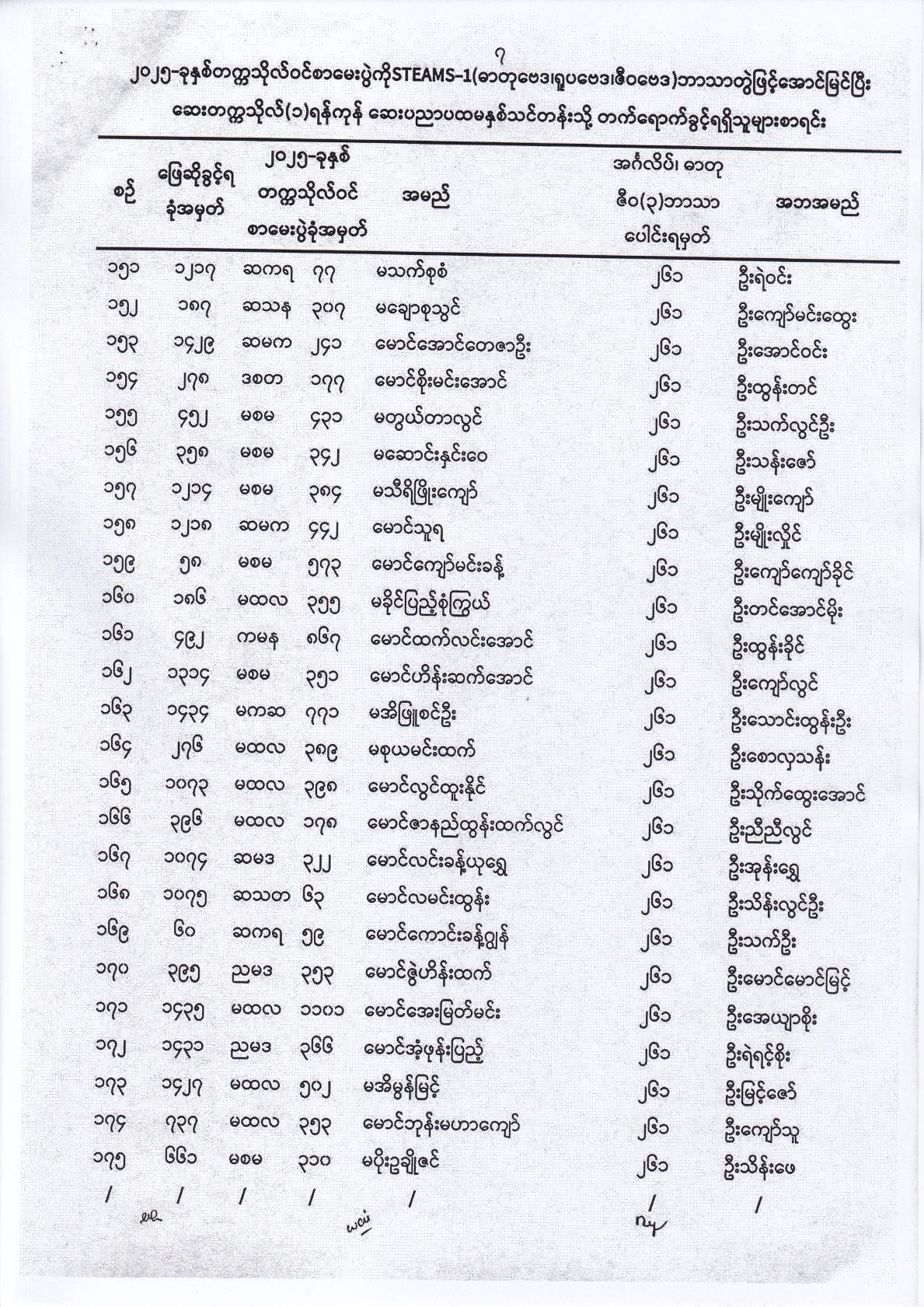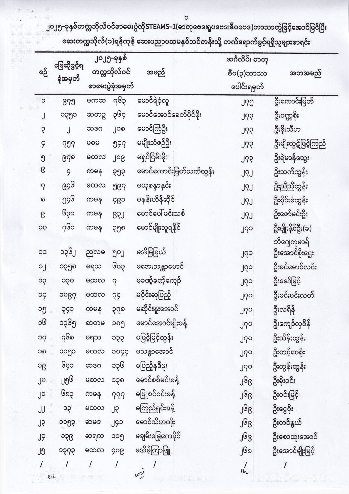 (၂၀၂၅) ခုနှစ်တွင် တက္ကသိုလ်ဝင်စာမေးပွဲကို STEAMS-1 (ဓာတုဗေဒ၊ ရူပဗေဒ၊ ဇီဝဗေဒ) ဘာသာတွဲ ဖြင့် အောင်မြင်ပြီး ကျန်းမာရေးလူ့စွမ်းအားအရင်းအမြစ်ဦးစီးဌာန၊ ဆေးတက္ကသိုလ်များနှင့် သွားဘက်ဆိုင်ရာ ဆေးတက္ကသိုလ်များ၏ ပထမနှစ်သင်တန်းသို့ ဝင်ခွင့်ရရှိသည့် ကျောင်းသား/သူများ