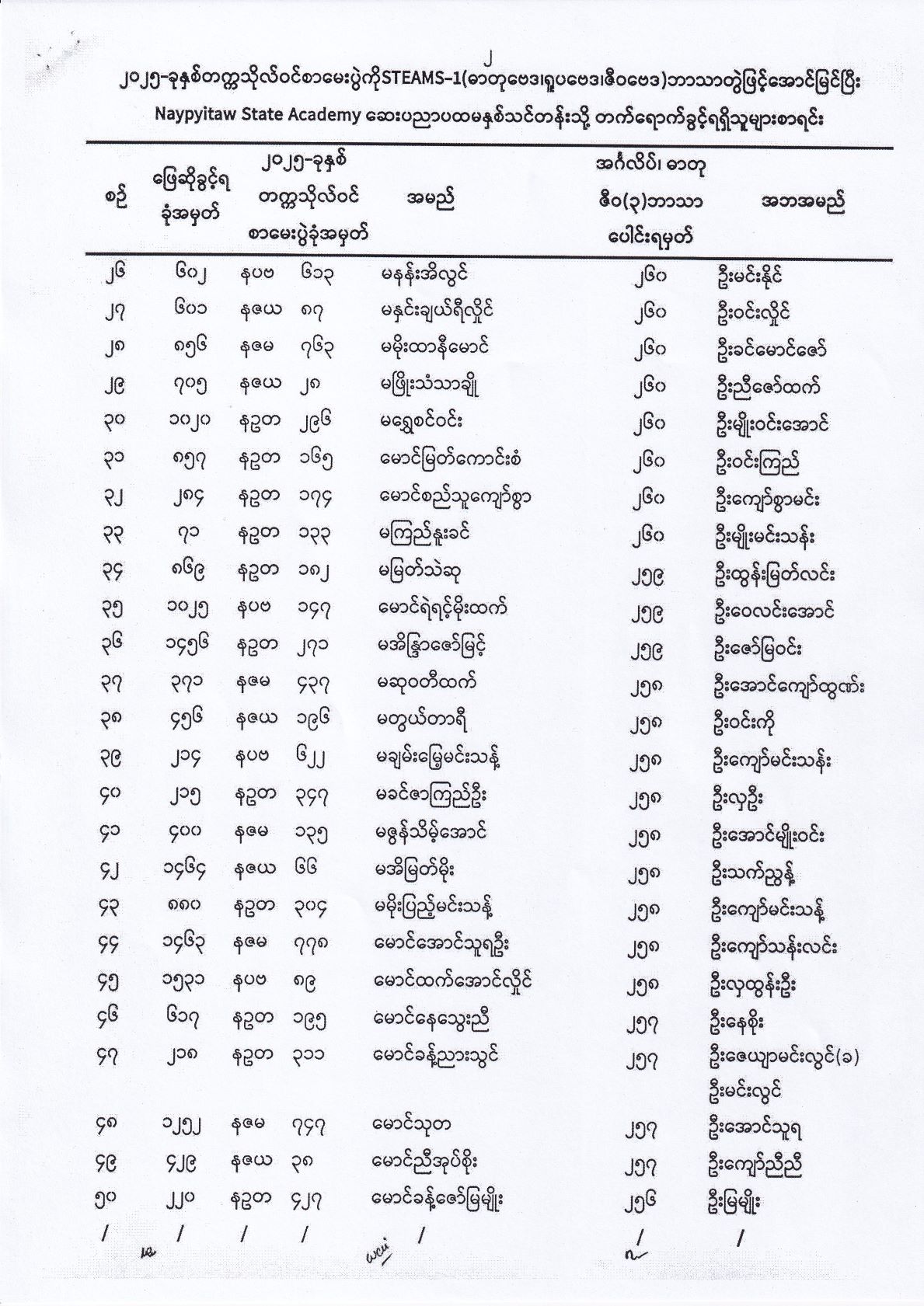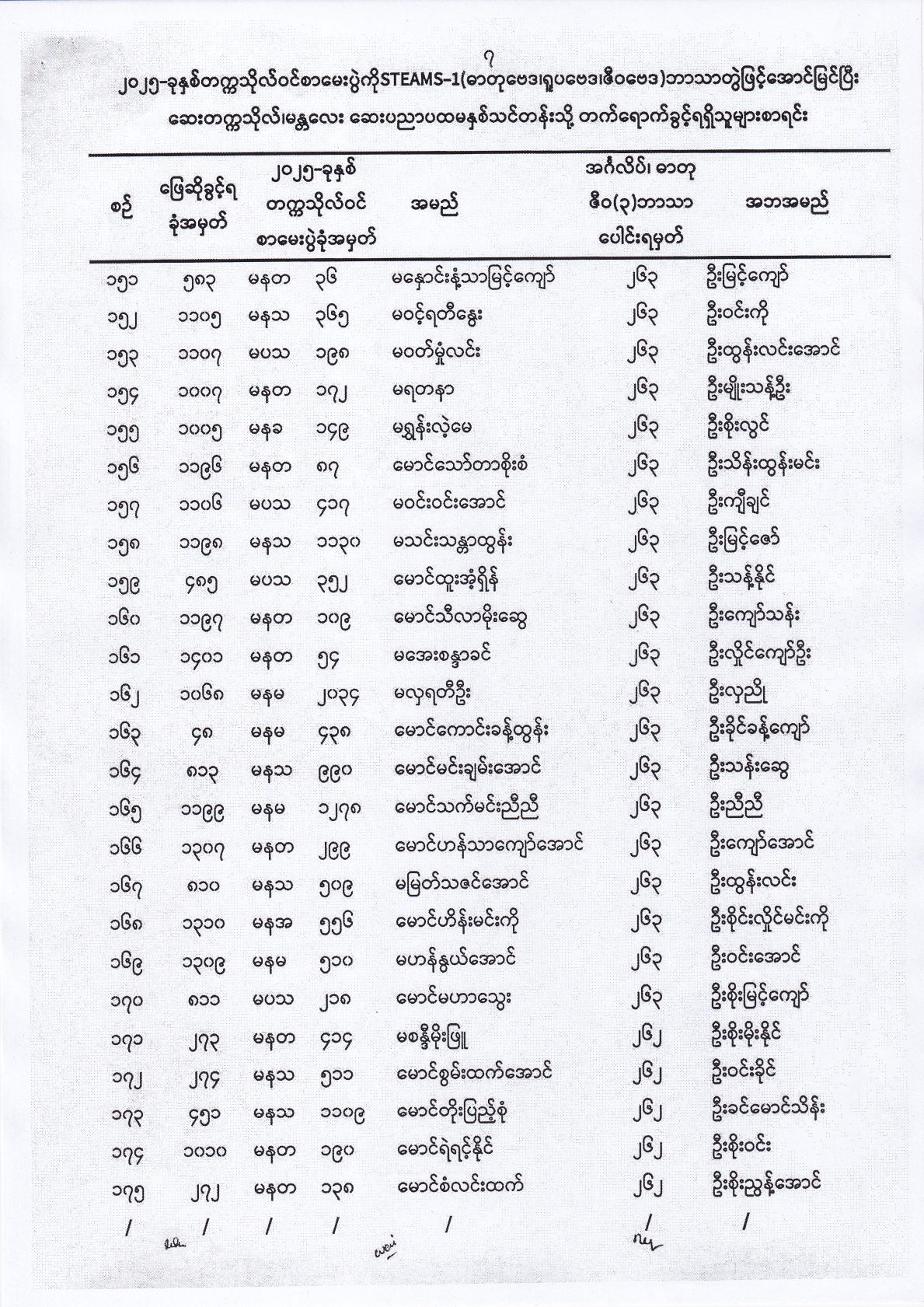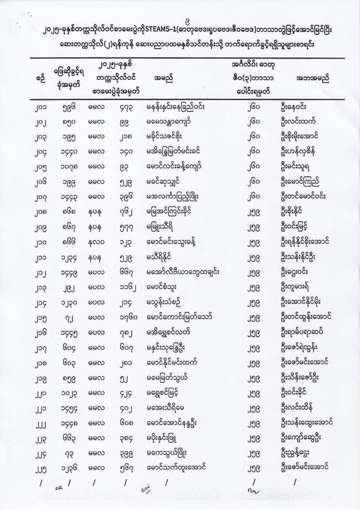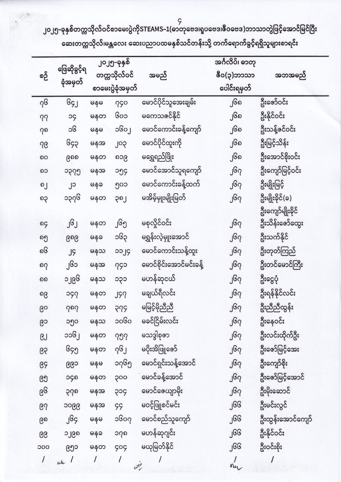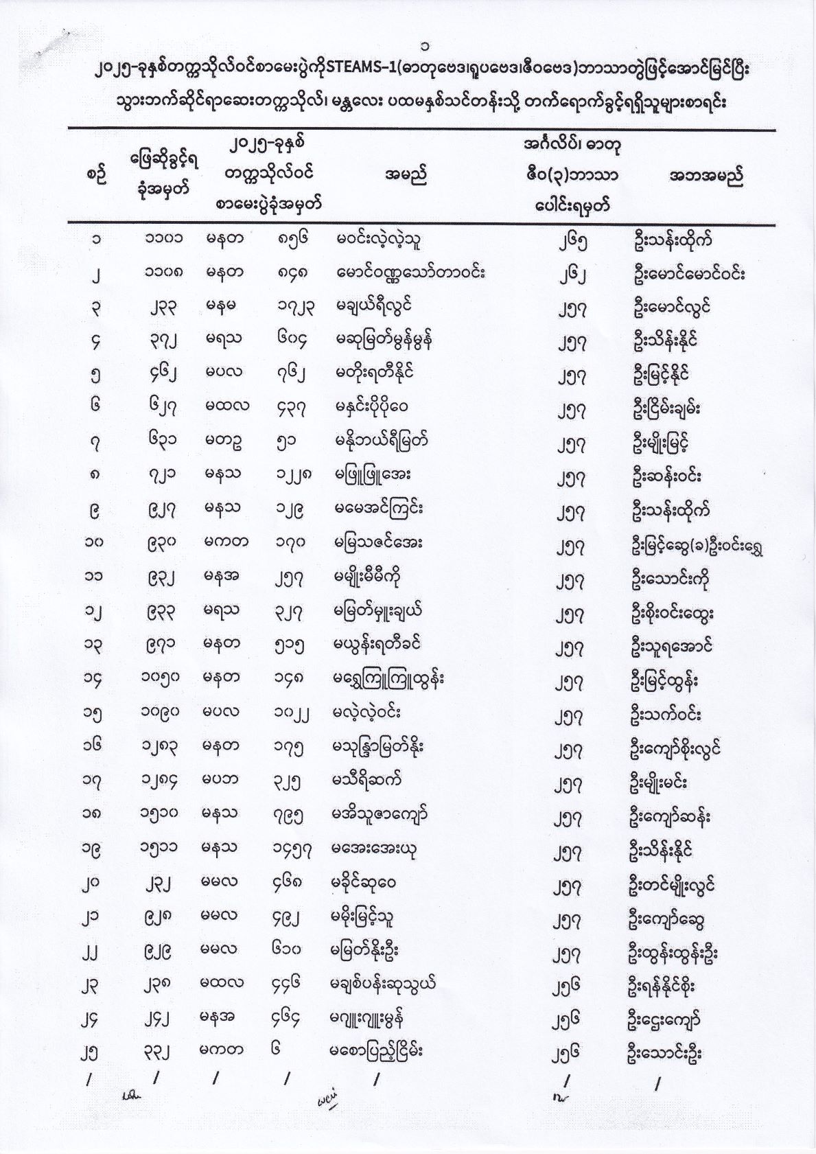 (၂၀၂၅) ခုနှစ်တွင် တက္ကသိုလ်ဝင်စာမေးပွဲကို STEAMS-1 (ဓာတုဗေဒ၊ ရူပဗေဒ၊ ဇီဝဗေဒ) ဘာသာတွဲ ဖြင့် အောင်မြင်ပြီး ကျန်းမာရေးလူ့စွမ်းအားအရင်းအမြစ်ဦးစီးဌာန၊ ဆေးတက္ကသိုလ်များနှင့် သွားဘက်ဆိုင်ရာ ဆေးတက္ကသိုလ်များ၏ ပထမနှစ်သင်တန်းသို့ ဝင်ခွင့်ရရှိသည့် ကျောင်းသား/သူများ