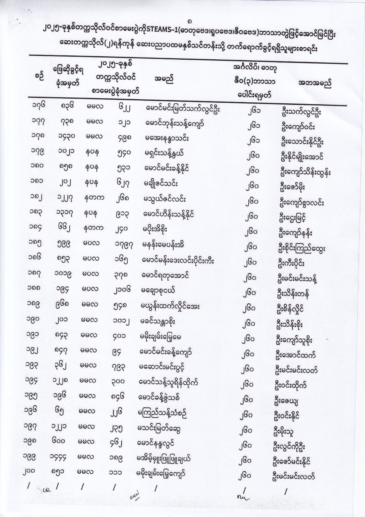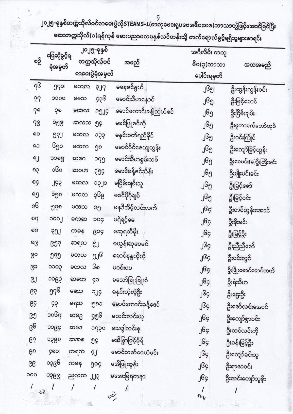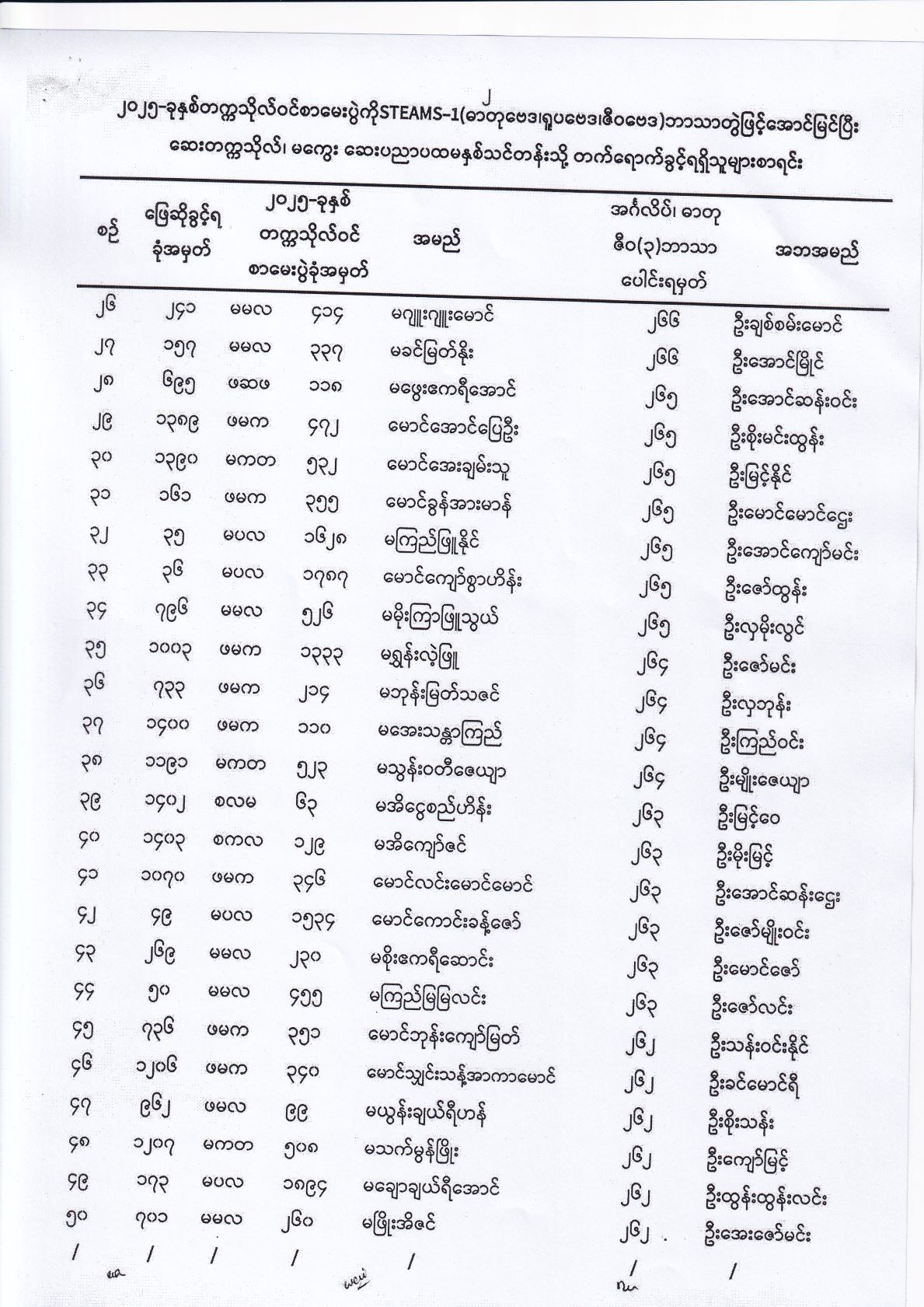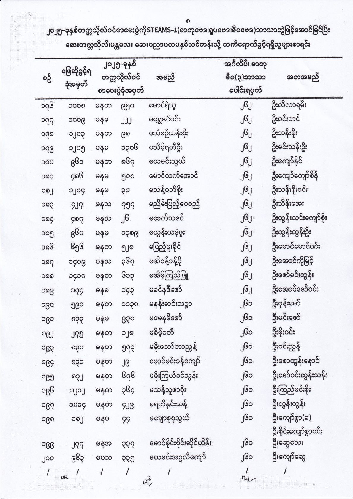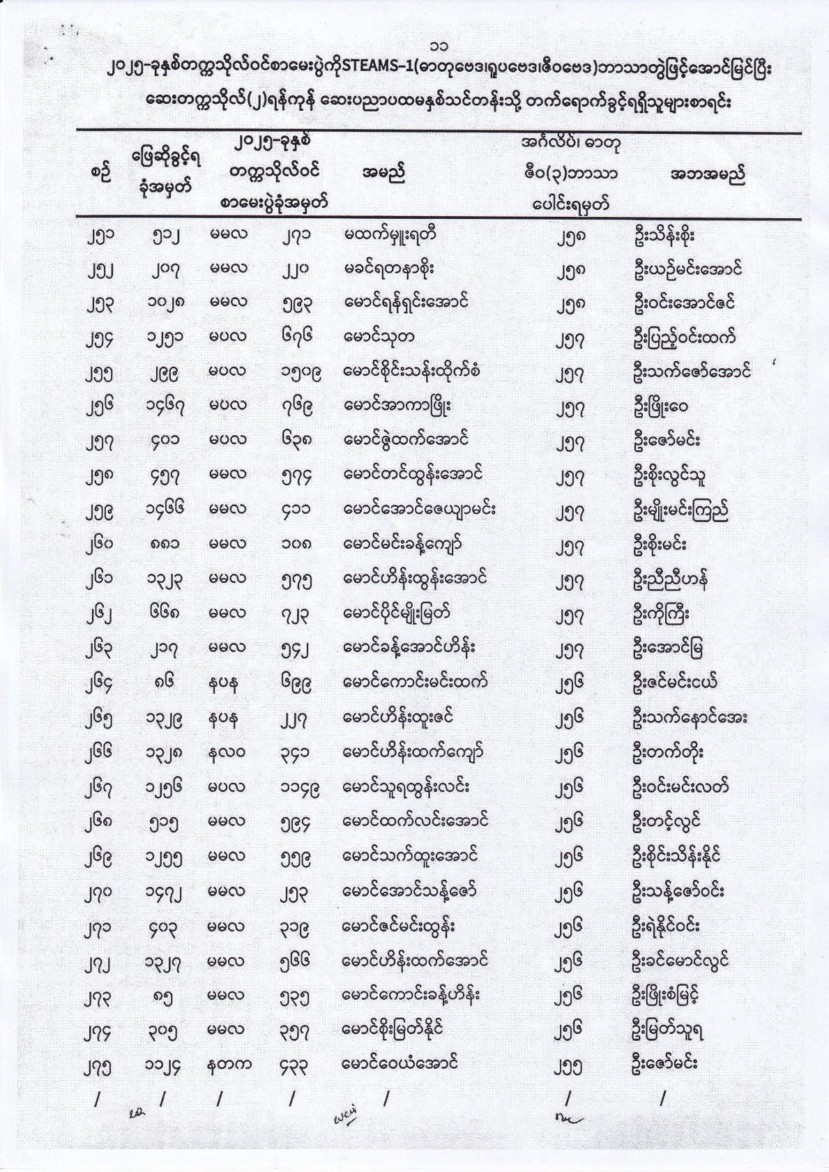 (၂၀၂၅) ခုနှစ်တွင် တက္ကသိုလ်ဝင်စာမေးပွဲကို STEAMS-1 (ဓာတုဗေဒ၊ ရူပဗေဒ၊ ဇီဝဗေဒ) ဘာသာတွဲ ဖြင့် အောင်မြင်ပြီး ကျန်းမာရေးလူ့စွမ်းအားအရင်းအမြစ်ဦးစီးဌာန၊ ဆေးတက္ကသိုလ်များနှင့် သွားဘက်ဆိုင်ရာ ဆေးတက္ကသိုလ်များ၏ ပထမနှစ်သင်တန်းသို့ ဝင်ခွင့်ရရှိသည့် ကျောင်းသား/သူများ