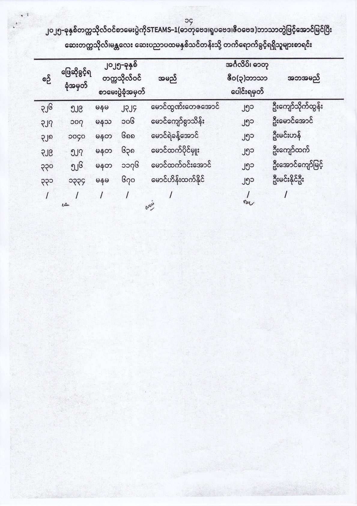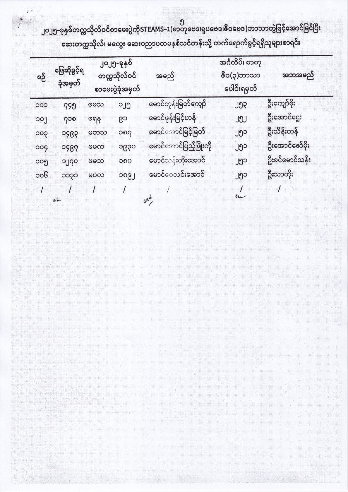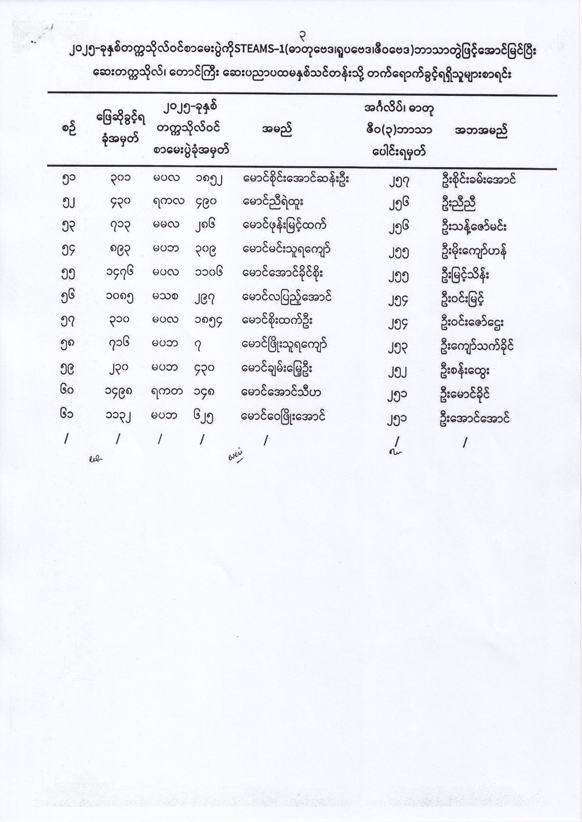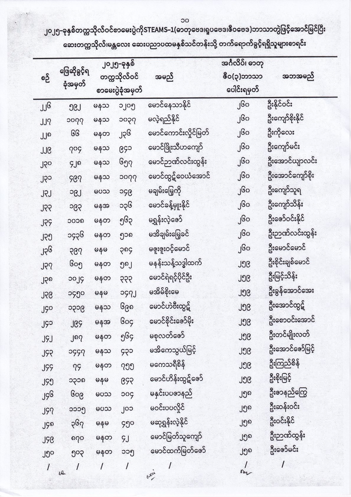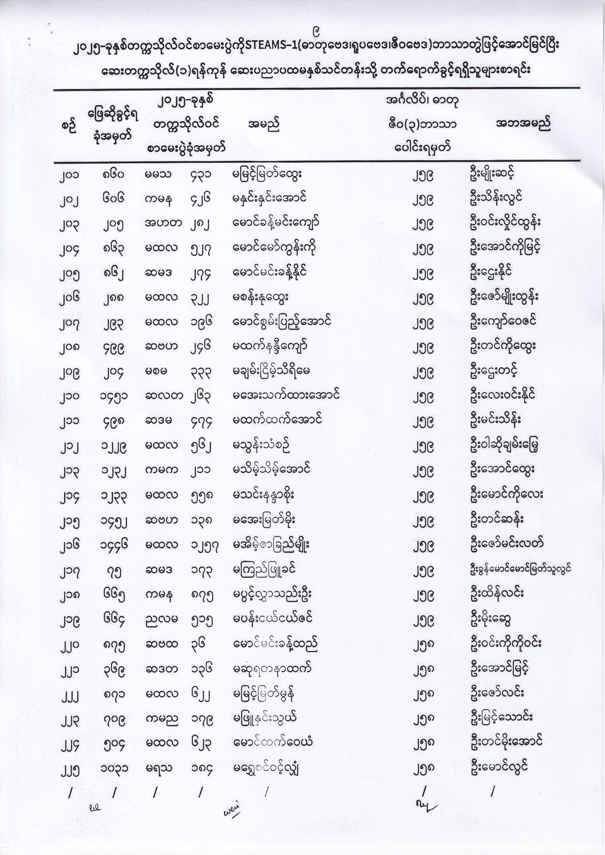 (၂၀၂၅) ခုနှစ်တွင် တက္ကသိုလ်ဝင်စာမေးပွဲကို STEAMS-1 (ဓာတုဗေဒ၊ ရူပဗေဒ၊ ဇီဝဗေဒ) ဘာသာတွဲ ဖြင့် အောင်မြင်ပြီး ကျန်းမာရေးလူ့စွမ်းအားအရင်းအမြစ်ဦးစီးဌာန၊ ဆေးတက္ကသိုလ်များနှင့် သွားဘက်ဆိုင်ရာ ဆေးတက္ကသိုလ်များ၏ ပထမနှစ်သင်တန်းသို့ ဝင်ခွင့်ရရှိသည့် ကျောင်းသား/သူများ