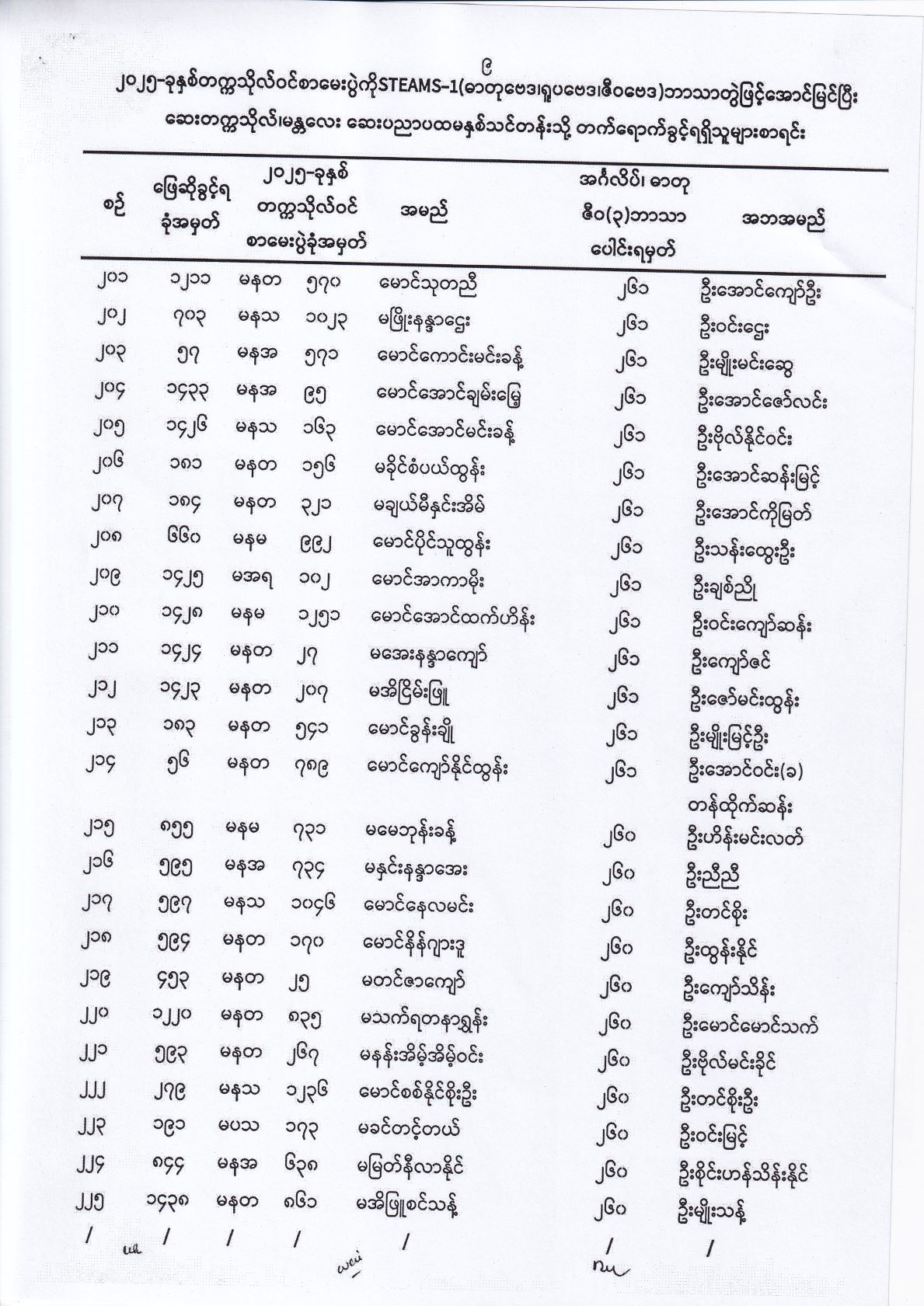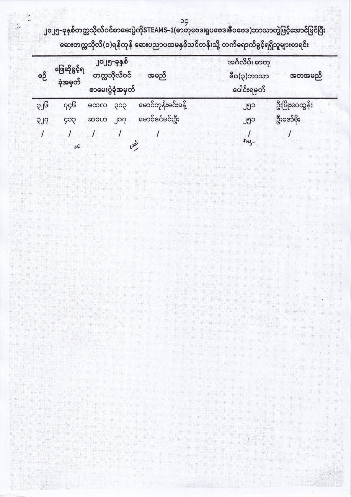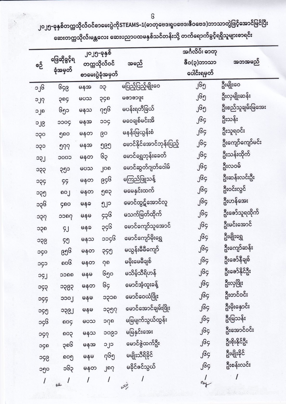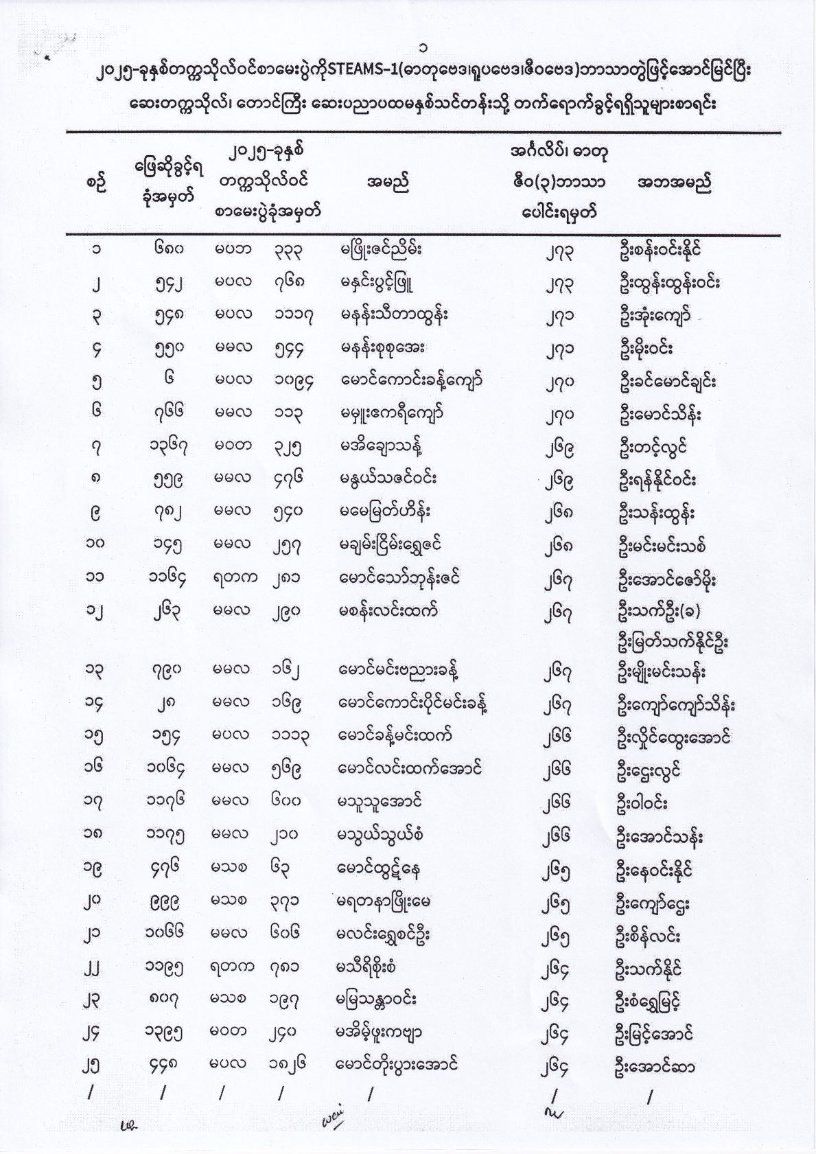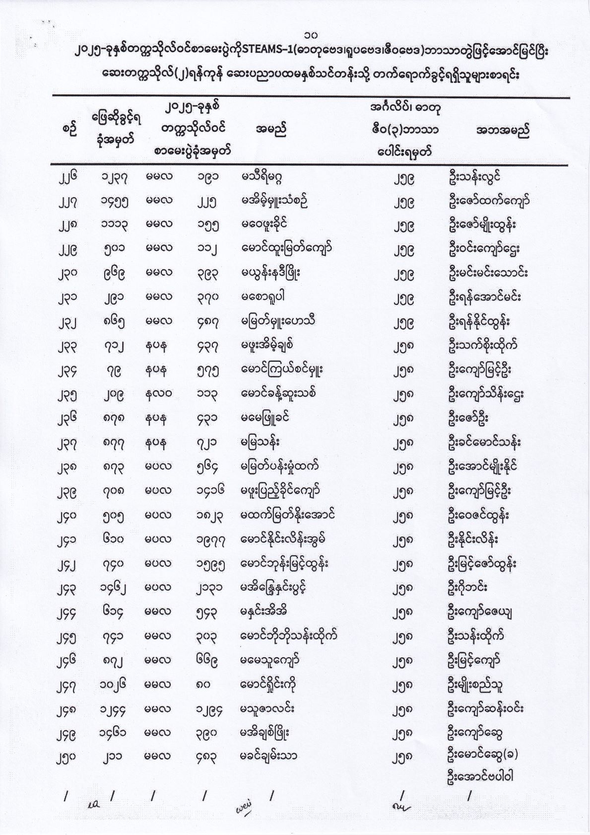 (၂၀၂၅) ခုနှစ်တွင် တက္ကသိုလ်ဝင်စာမေးပွဲကို STEAMS-1 (ဓာတုဗေဒ၊ ရူပဗေဒ၊ ဇီဝဗေဒ) ဘာသာတွဲ ဖြင့် အောင်မြင်ပြီး ကျန်းမာရေးလူ့စွမ်းအားအရင်းအမြစ်ဦးစီးဌာန၊ ဆေးတက္ကသိုလ်များနှင့် သွားဘက်ဆိုင်ရာ ဆေးတက္ကသိုလ်များ၏ ပထမနှစ်သင်တန်းသို့ ဝင်ခွင့်ရရှိသည့် ကျောင်းသား/သူများ