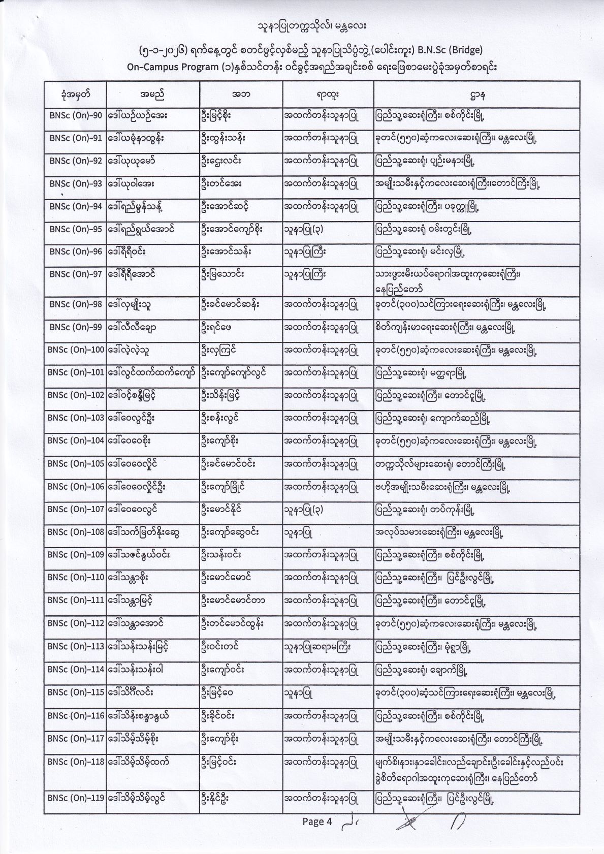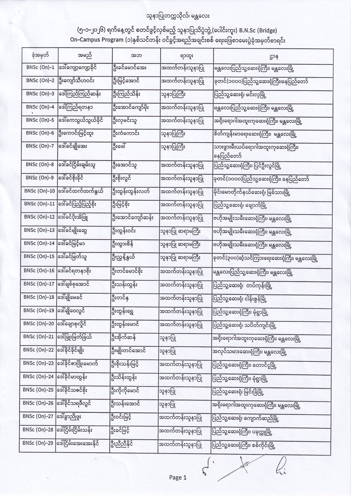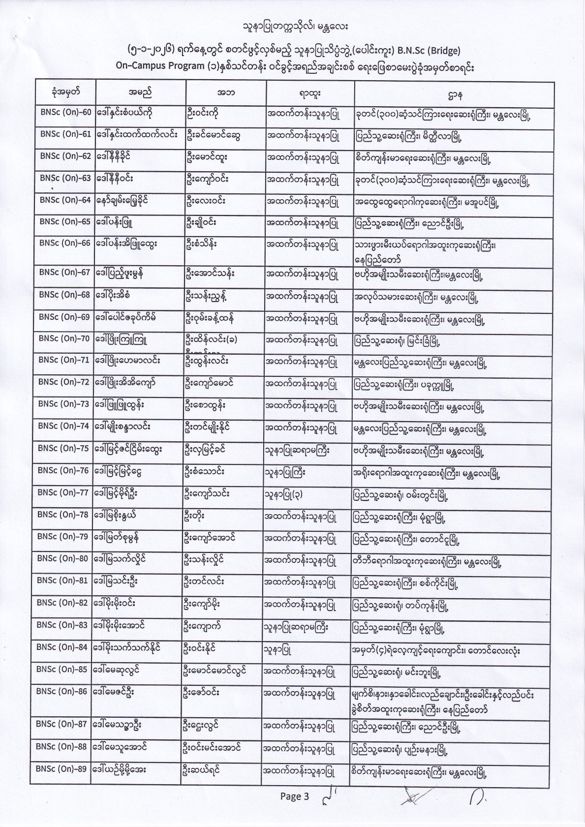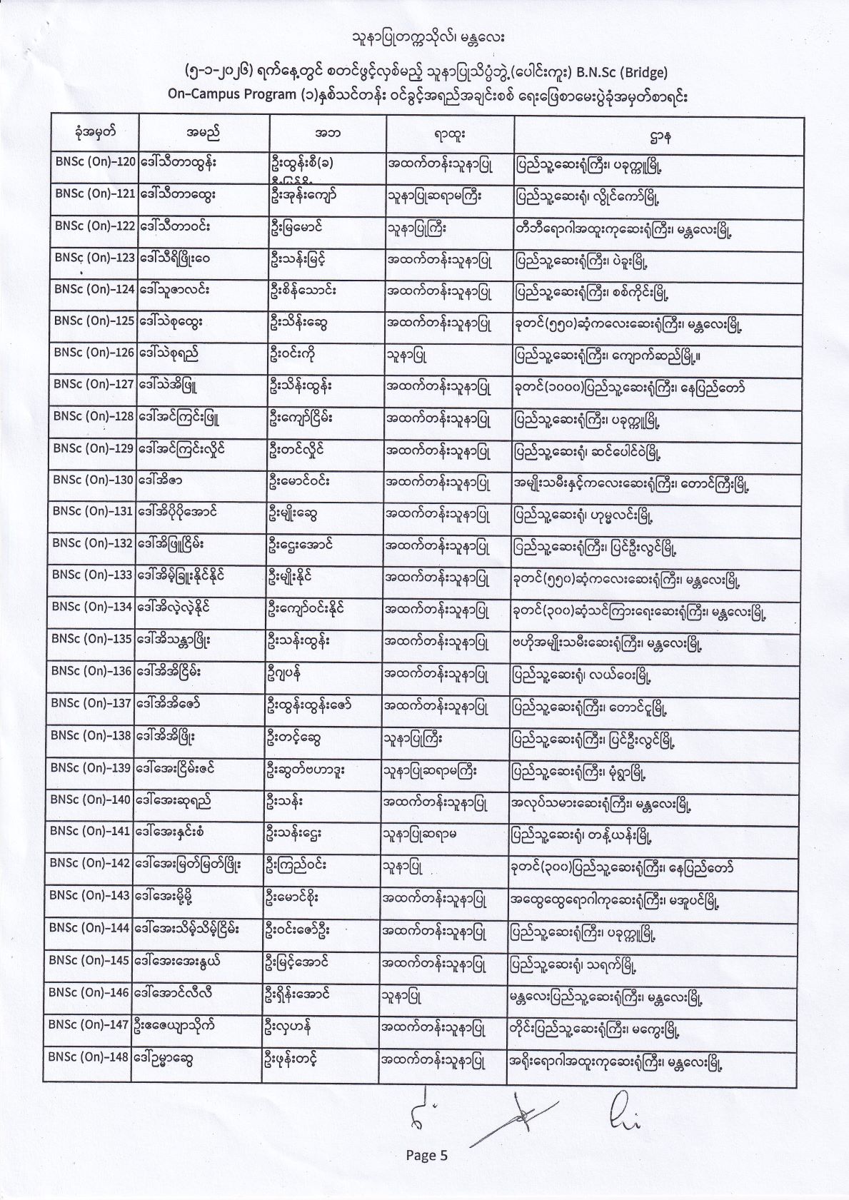 သူနာပြုတက္ကသိုလ်-မန္တလေး၌ (၅-၁-၂၀၂၆) ရက်နေ့၌ဖွင့်လှစ်မည့် သူနာပြုသိပ္ပံဘွဲ့(ပေါင်းကူး) B.N.Sc (Bridge) On-Campus Program (၁)နှစ်သင်တန်းအတွက် ရေးဖြေစာမေးပွဲဖြေဆိုခွင့်ရရှိသူများ၏ ခုံအမှတ်စာရင်းနှင့် စာမေးပွဲအချိန်စာရင်း