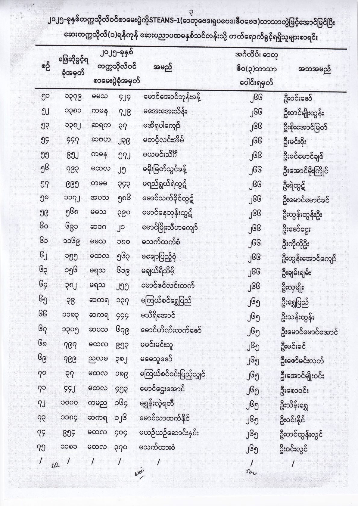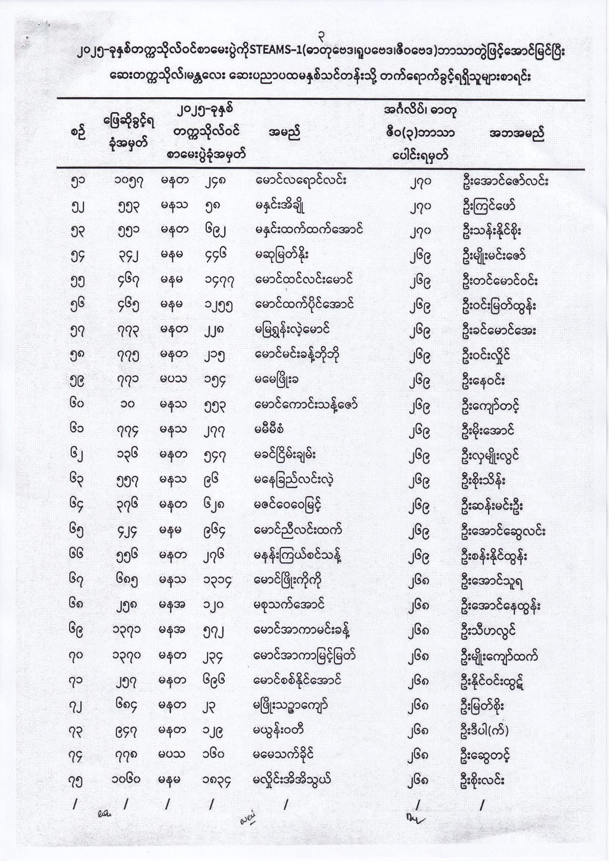 (၂၀၂၅) ခုနှစ်တွင် တက္ကသိုလ်ဝင်စာမေးပွဲကို STEAMS-1 (ဓာတုဗေဒ၊ ရူပဗေဒ၊ ဇီဝဗေဒ) ဘာသာတွဲ ဖြင့် အောင်မြင်ပြီး ကျန်းမာရေးလူ့စွမ်းအားအရင်းအမြစ်ဦးစီးဌာန၊ ဆေးတက္ကသိုလ်များနှင့် သွားဘက်ဆိုင်ရာ ဆေးတက္ကသိုလ်များ၏ ပထမနှစ်သင်တန်းသို့ ဝင်ခွင့်ရရှိသည့် ကျောင်းသား/သူများ