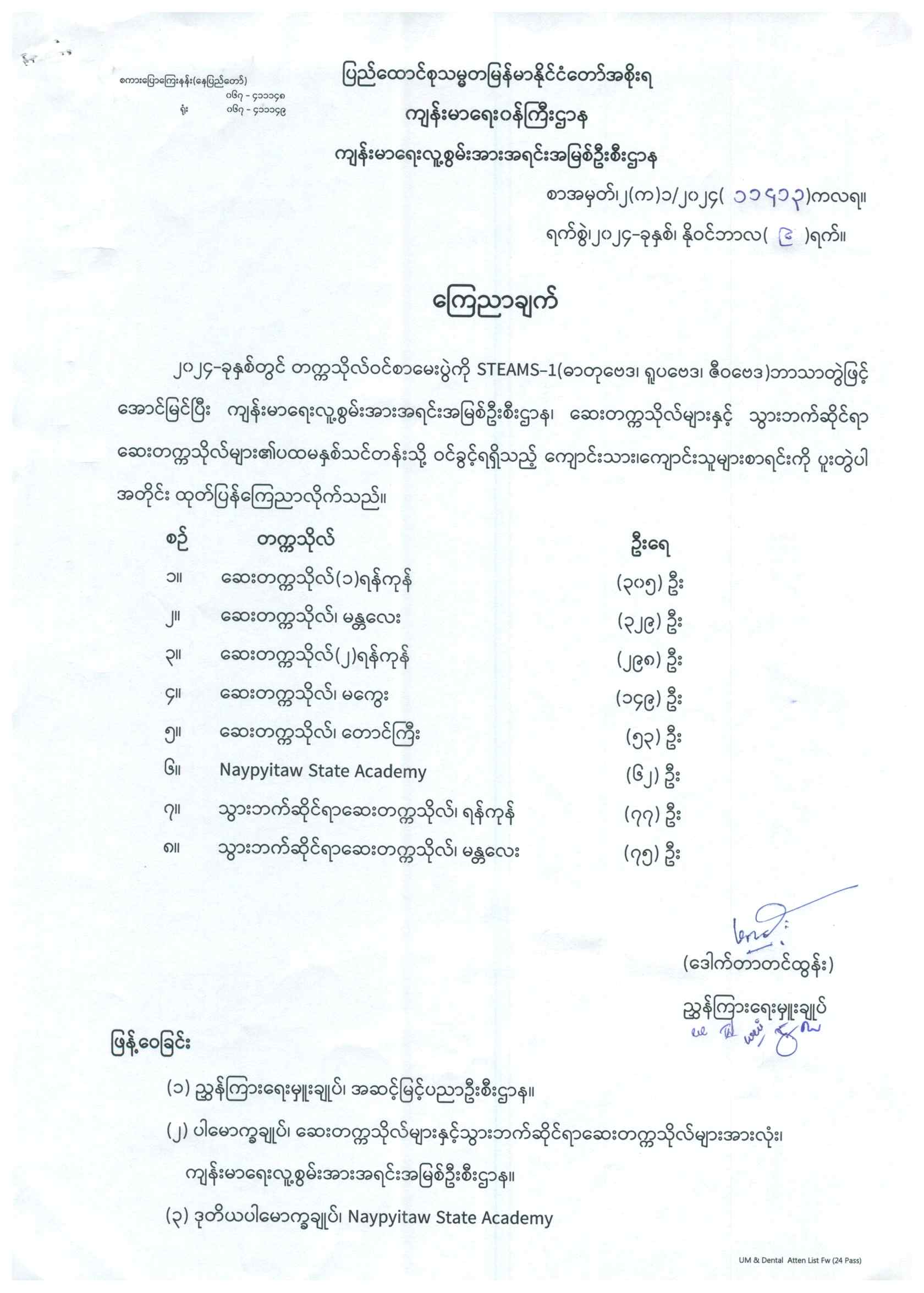 ၂၀၂၅-ပညာသင်နှစ် ဆေးတက္ကသိုလ်များနှင့် သွားဘက်ဆိုင်ရာဆေးတက္ကသိုလ်များ၏ ပထမနှစ်သင်တန်းသို့ မိမိစရိတ်ဖြင့်ဝင်ခွင့်ရရှိသောကျောင်းသားကျောင်းသူများစာရင်း