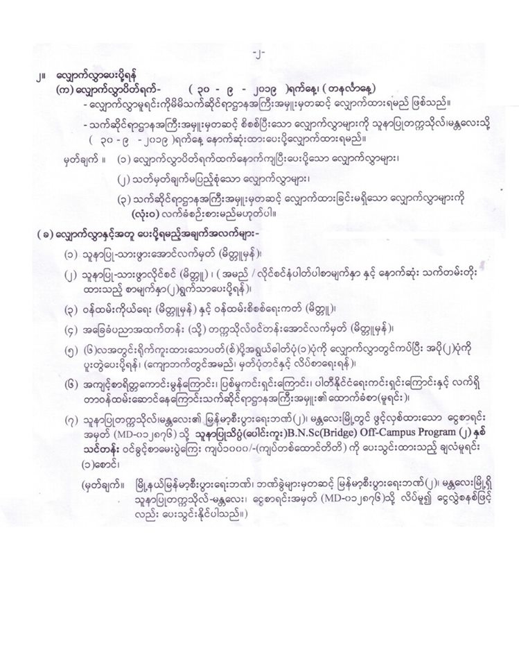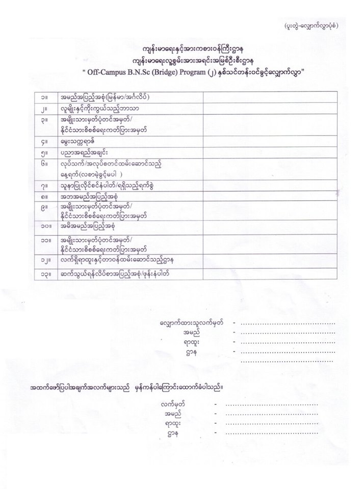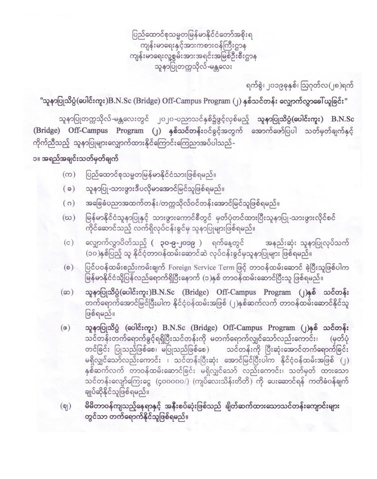 သူနာပြုသိပ္ပံ(ပေါင်းကူး) B.N.Sc(Bridge)(Off-Campus Program) (၂) နှစ်သင်တန်း