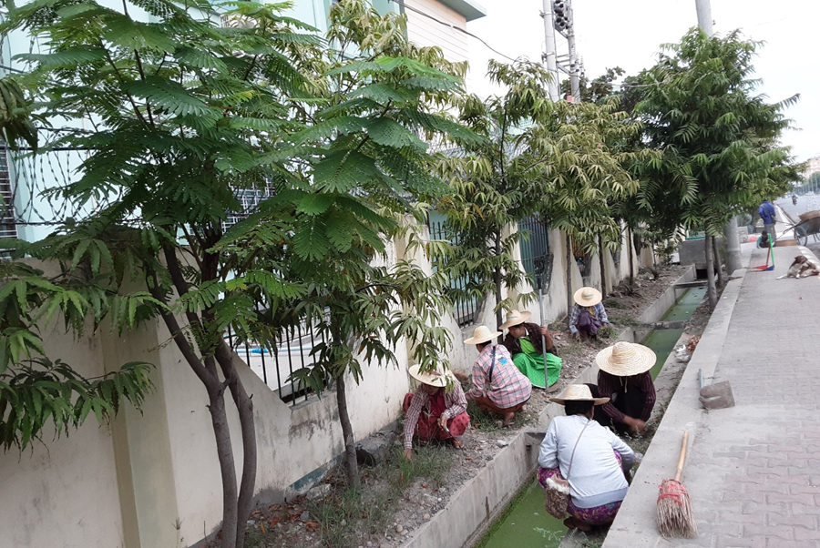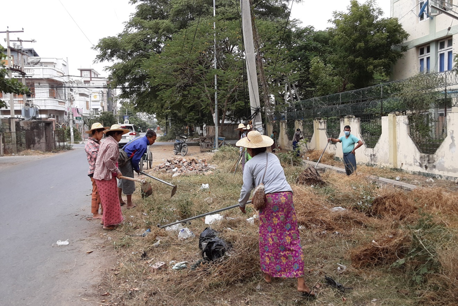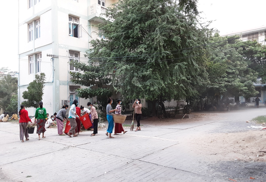 တက္ကသိုလ်ပတ်ဝန်းကျင်သန့်ရှင်းသာယာလှပစေရေးအတွက် အဆောင်နေဆရာ/ဆရာမများ ကျောင်းသား/သူများ ဝန်ထမ်းများသန့်ရှင်းရေးပြုလုပ်နေပုံ