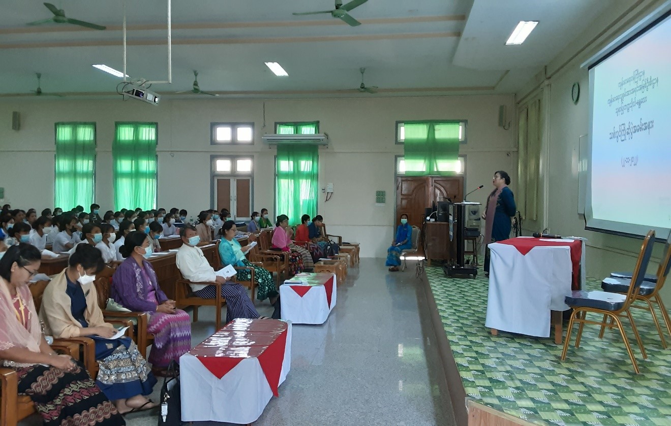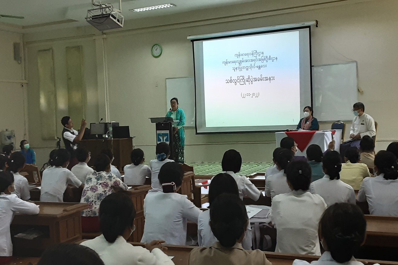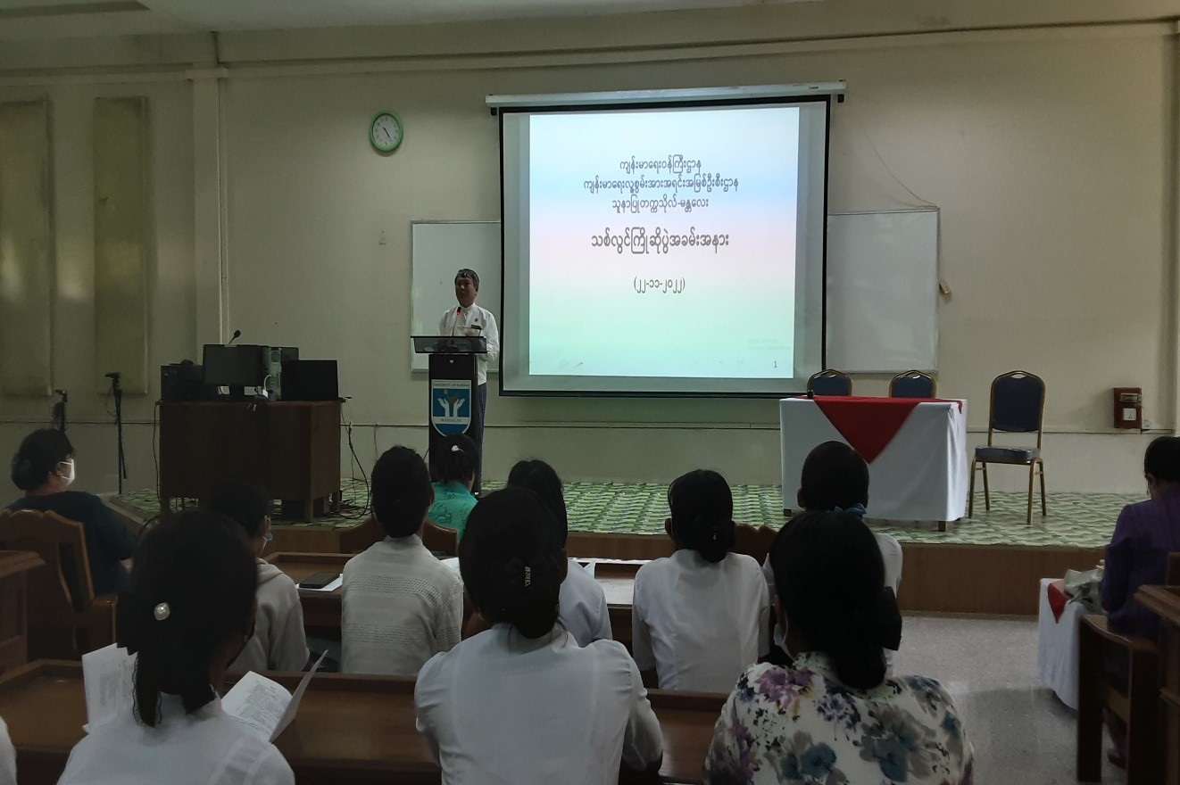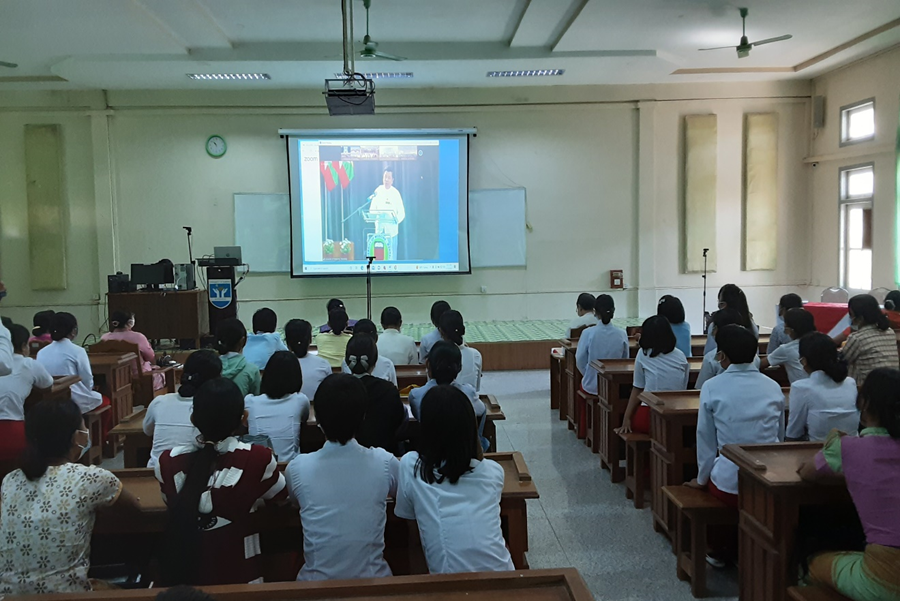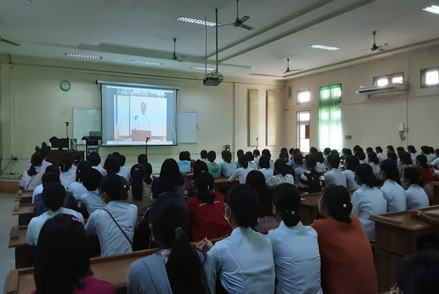 သူနာပြုတက္ကသိုလ်-မန္တလေး၊ ပထမနှစ်သူနာပြုသိပ္ပံဘွဲ့ (ပုံမှန်) (၁၁/၂၀၂၂) သင်တန်းသို့တက်ရောက်မည့် ကျောင်းသား/သူများအား ပြည်ထောင်စုဝန်ကြီး ပါမောက္ခဒေါက်တာသက်ခိုင်ဝင်းနှင့် ညွှန်ကြားရေးမှူးချုပ် ဒေါက်တာတင်ထွန်းတို့မှ အမှာစကားပြောကြားနေပုံ